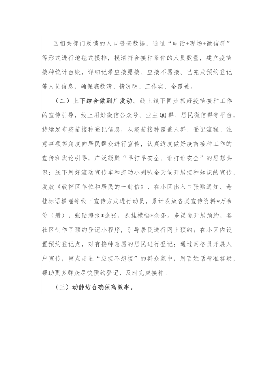 关于新冠疫苗接种工作的情况汇报尊敬的各位领导:根据会议安排,现将我们新冠疫苗接种工作情况汇报如下:一、工作开展情况为巩固疫情防控成果,筑牢群体免疫屏障,我们根据市、区新冠疫苗接种工作整体部署安排及相关要求,强化组织领导,做到“四个结合”,切实加快推进新冠病毒疫苗接种工作。截至目前,已接种疫苗*万余人。(一)条块结合实现全覆盖。坚持“条块结合、以块为主”的组织实施体系,按照街道统筹、社区抓落实和行业管理部门督促,落实属地责任和行业主管责任,实行主要领导包片、驻居领导及干部包社区、社区干部包网格、网格员包楼幢,层层压实工作责任,做到责任到人、任务到人。建立“1+2+17”工作机制,“1”即1个街道疫苗接种工作专班,实行“日通报、周调度”,以“日报表+碰头会”工作模式,做好相关数据的汇报与交流,及时、全面、准确把握工作进度与情况,并将疫苗接种任务完成情况纳入年度考核,形成责任倒逼;“2”即2个接种点,面对街道疫苗接种任务数量全区最多的实际情况,在现有的区妇幼保健院接种点基础上,得益于区卫健委大力支持,仅用了半天时间便在人员集中的锦华路社区居民区新增了1个临时接种点,及时缓解了妇幼保健院接种压力,并做好2个接种点人员、物资、秩序维护等保障工作;“17”即17个社区工作协调组,对照区相关部门反馈的人口普查数据,通过“电话+现场+微信群”等形式进行地毯式摸排,摸清符合接种条件的人员数量,建立疫苗接种统计台账,详细记录应接愿接、应接不愿接、已完成预约登记等人员信息,确保底数清、情况明、工作实、全覆盖。(二)上下结合做到广发动。线上线下同步抓好疫苗接种工作的宣传引导,线上用好微信公众号、业主QQ群、居民微信群等平台,持续发布疫苗接种登记信息,从疫苗接种覆盖人群、登记流程、注意事项等角度向居民群众进行宣传,认真适度做好疫苗接种工作的宣传和舆论引导,广泛凝聚“早打早安全、谁打谁安全”的思想共识;线下用好流动宣传车和流动小喇叭全天候开展接种知识的宣传,发放《致辖区单位和居民的一封信》,在小区出入口张贴通知、悬挂标语横幅等线下宣传方式进行动员,累计发放各类宣传资料*万余份(册),张贴海报*余张,悬挂横幅*余条。多渠道开展预约,各社区制作了预约登记小程序,引导居民进行网上预约;在小区内设置预约登记点,对有接种意愿的居民进行登记;通过网格员开展入户宣传,重点走进“应接不想接”的群众家中,用百姓话精准答疑,帮助更多群众尽快预约登记,及时完成接种。(三)动静结合确保高效率。每天与区卫健委做好对接沟通,根据疫苗数量和接种点的承载能力,在人员集中的接种点“高配”疫苗,在其他接种点“标配”疫苗,并合理设置各社区群众接种时间段,根据当天疫苗接种进度适时调整接种人数,避免群众排队久等后无苗接种的情况。为了不耽误企业生产,街道主动对接辖区*多家企业,并通过区疫情防控指挥部预约了全区首台流动接种车,分别在名世贸城商圈、千汇商业街、东方烹饪学校操场等*个企业集中的区域设置了流动接种点,为企业提供组团接种服务,精分接种时段,保证每个企业只需提前10分钟到点候场,避免现场人员聚集,减少接种等候时间。(四)学做结合党员作表率。结合正在开展的党史学习教育,街道提出了“支部靠前行动、党员带头接种”的工作要求,形成“我是党员我先上”“党员家属带头上”的良好氛围。扎实开展“我为群众办实事”实践活动,开展联系群众“大走访”,了解难题“大排查”,服务能力“大提升”,将新冠疫苗接种工作与家庭医生签约、老年人健康体检等工作紧密结合起来,用实际行动为辖区群众筑起最大化健康屏障,保障群众健康平安。二、存在的问题疫苗接种工作总体进展顺利,但还存在部分群众有等待观望思想、疫苗有时缺供(有效接种时间9天)、接种台少群众等候时间较长(两个接种点共5个接种台)、接种人员信息统计较难等问题,建议:一是在有条件的接种点适当增设接种台,并增配医务人员;二是利用信息化手段加强接种人员信息管理,提高精确性和工作效率。三、工作建议我们将提高政治站位和思想认识,把疫苗接种工作作为当前的首要政治任...