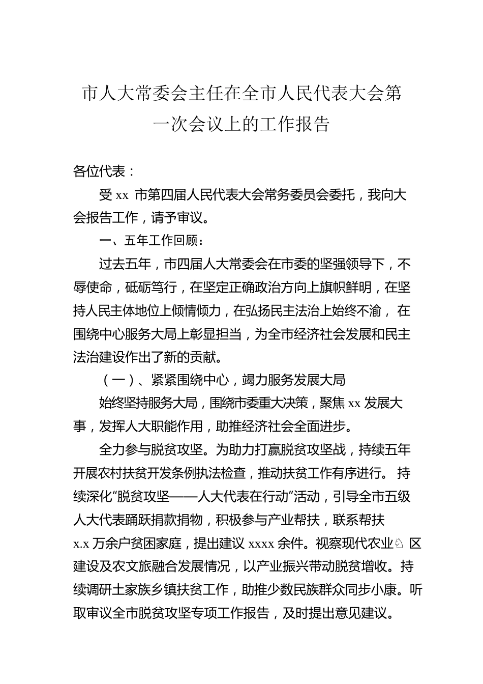 市人大常委会主任在全市人民代表大会第一次会议上的工作报告各位代表:受xx市第四届人民代表大会常务委员会委托,我向大会报告工作,请予审议。一、五年工作回顾:过去五年,市四届人大常委会在市委的坚强领导下,不辱使命,砥砺笃行,在坚定正确政治方向上旗帜鲜明,在坚持人民主体地位上倾情倾力,在弘扬民主法治上始终不渝,在围绕中心服务大局上彰显担当,为全市经济社会发展和民主法治建设作出了新的贡献。(一)、紧紧围绕中心,竭力服务发展大局始终坚持服务大局,围绕市委重大决策,聚焦xx发展大事,发挥人大职能作用,助推经济社会全面进步。全力参与脱贫攻坚。为助力打赢脱贫攻坚战,持续五年开展农村扶贫开发条例执法检查,推动扶贫工作有序进行。持续深化“脱贫攻坚——人大代表在行动”活动,引导全市五级人大代表踊跃捐款捐物,积极参与产业帮扶,联系帮扶x.x万余户贫困家庭,提出建议xxxx余件。视察现代农业♘区建设及农文旅融合发展情况,以产业振兴带动脱贫增收。持续调研土家族乡镇扶贫工作,助推少数民族群众同步小康。听取审议全市脱贫攻坚专项工作报告,及时提出意见建议。持续开展定点帮扶工作,千方百计帮助xx村等xx个贫困村发展产业、完善基础设施建设、带动群众增收致富。常委会机关扶贫工作受到省委省政府表彰。倾力督导重大项目。坚持每季度督导重大项目和民生实事,视察施工现场,召开项目专题会,确保工程顺利实施。听取审议市级政府性重大投资建设项目实施情况,督促相关部门严格监管,提高政府性投资效益。全程协调推动红色旅游精品线路、精品景区、重点镇村的深度打造和提档升级,xx保卫战战史陈列馆迁建工程全面竣工并投入使用。着力促进“示范区”建设。积极参与融入xx地区“双城圈”,建好万达开xx统筹发展“示范区”重大战略实施,听取审议专项工作报告,强化对“示范区”重点项目落地情况的监督。承办xx全国人大代表首次联合专题视察、xx人大相关专委会调研“示范区”工作,积极推动区域一体化协同发展。视察城乡规划法实施及区域中心城市建设情况,推动完善城市功能,提升城市品质,增强在“示范区”建设中的引领作用。聚力助推疫情防控。面对新冠肺炎疫情的严重冲击和稳经济保发展的严峻挑战,及时作出依法全力做好当前新冠肺炎疫情防控工作的决定,对传染病防治法开展执法检查,听取疫情常态化防控工作专项报告,有效发挥法治在疫情防控中的保障作用。在这场大考中,全市各级人大代表以实际行动践行初心使命,奋力投入抗疫第一线,在各行各业发挥了模范带头作用。人大机关干部深入联系社区、帮扶村开展志愿服务,生动诠释了人大干部的担当作为。(二)、坚持务实管用,立良法保善治促发展始终坚持发挥人大在立法中的主导作用,在首批被赋予地方立法权后,积极开展立法工作。五年来,围绕重点领域和民生问题颁布实施了x部地方性法规,立法数量和质量均居全省前列。突出重点领域立法。聚焦生态环境,颁布实施集中式饮用水水源保护、莲花湖湿地保护等条例,切实保护xx的碧水蓝天。聚焦城市管理,颁布实施文明行为促进、市容和环境卫生管理、城市公共汽车客运等条例,加快了物业管理立法,积极助推幸福、美丽、文明xx建设。聚焦历史文化,颁布实施红色文化遗存保护利用、xx遗址遗迹保护、传统村落保护与利用等条例,以法制守护xx人文根脉。注重提升立法质效。不断完善科学立法、民主立法、依法立法机制,组建立法咨询专家库,有效整合社会立法资源,优化立法要素配置。拓宽公众有序参与渠道,共召开听证会x次,多形式征集社会各界意见,更好地汇集民意,凝聚共识。开展立法案例研究,确保所立之法能管用。集中式饮用水水源保护管理条例颁布后,力促依法拆迁罗江取水口一级保护区内的建构筑物,严肃查处影响饮用水源环境的违法行为,该条例的颁布实施被评为全市“十大法治事件”之一。切实维护法制统一。组织开展宪法、民法典等法律学习宣传。扎实做好我市地方性法规专项清理,针对相关上位法修改以及机构改革行政职能调整,及时对两部法规进行修改。认真开展备案审查,加快市县人大信息平台建设,实现备案审查全市“一张网”。五年来,累计审...