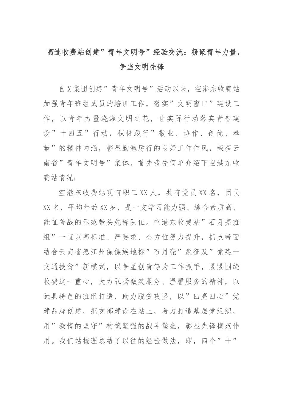 高速收费站创建”青年文明号”经验交流:凝聚青年力量,争当文明先锋自X集团创建”青年文明号”活动以来,空港东收费站加强青年班组成员的培训工作,落实”文明窗口”建设工作,以青年力量浇灌文明之花,让实际行动落实青春建设”十四五”行动,积极践行”敬业、协作、创优、奉献”的精神内涵,彰显勤勉厉行的良好工作作风,荣获云南省”青年文明号”集体。首先我先简单介绍下空港东收费站情况:空港东收费站现有职工XX人,共有党员XX名,团员XX名,平均年龄XX岁,是一支学习能力强、综合素质高、能征善战的示范带头先锋队伍。空港东收费站”石月亮班组”一直以高标准、严要求、全方位努力提升,抓点带面结合云南省怒江州傈僳族地标”石月亮”象征及”党建+交通扶贫”新模式,以争星创青等为工作抓手,紧紧围绕收费这一重心,大力弘扬微笑服务、温馨服务的精神,以独具特色的班组打造,助力脱贫攻坚,以”四亮四心”党建品牌创建,把支部建设在站上,着力打造基层党组织,用”激情的坚守”构筑坚强的战斗堡垒,彰显先锋模范作用。我们站梳理总结了以往的经验做法,即,四个”+”下面我重点围绕这四个”1+1”工作模式,和大家做一汇报。一是建强组织,”党建+团建”同发力。空港东收费站高度重视组织建设,通过党建引领团建的方式,强化青年员工思想政治引领,以实际行动践行社会主义核心价值观。党员先锋引领新风尚,合理分配党小组党员骨干力量将党小组建设与班组发展有机融合,打造”一个班组一名党员”的工作局面,充分发挥党员在业务、服务、管理等方面工作优势,深化对品牌服务、安全生产、收费运营工作的引领和保障。开展了”青春向党·强国有我”主题学习培训。引导广大青年员工增强”四个意识”、坚定”四个自信”、做到”两个维护”,多种形式掀起”青年大学习”热潮。通过”青年大学习网上主题团课〞”青年学习日活动”、班后会等方式,领导班子成员带头参加,使站内职工能够深刻领悟党的XX大理论成果。”面对面找问题,实打实抓整改”谈心谈话活动,拆除了收费站与青年员工之间的”隔心墙”,建立了彼此交流畅谈的”连心桥”,为安康东收费站各项工作的顺利开展奠定了基础,确保青年员工队伍建设和安全生产”双稳定”。二是培训赋能。”学习+实践”提质效。结合党史学习教育、学习贯彻党的XX大精神、习近平新时代中国特色社会主义思想主题教育等,借助”学习强国”平台,搭建”学习强站”小组,开展”党员带头学、团员对标学、青年参照学”的学习模式,同时利用职工书屋,制定职工书屋管理制度,定期组织员工进行业务知识学习,重点学习《公路法》《公路安全保护条例》《收费管理条例》《云南省收费公路管理办法》等法律法规,全站比、学、赶、帮、超氛围浓厚,为青年职工提素质、创一流、作表率注入动力。通过站例会要求班长必须对本月工作总结、对下月工作进行计划,会上班长将问题提出来集体讨论,给出结论,营造全员参与、积极探讨的氛围。除此之外,空港东收费站自主积极开展岗位练兵实践活动,激发全站工作人员的工作热情,提高服务水平,落实廉洁文明的工作理念,净化工作氛围,由团委带头,明确职责分工,在实践锻炼中持续锤炼团员青年的文明素养、道德修养、收费业务技能和文明服务水平,树立了良好的服务形象。三是多措并举,”业务+培训”双追踪。在活动期间,空港东站以”亮身份、建阵地、强队伍、创服务”为抓手将提高业务技能、培养青年员工成才作为建设”青年文明号”的有力手段,在工作之余,青年内训师积极开展文明服务礼仪培训,内容涵盖服务态度、服务方式、应急演练业务内容等,以专项活动、班组学习和现场指导的方式增强员工服务意识,提高服务水平;全体员工立足岗位,真抓实干,重安全、抓生产、争优先,紧密结合运营管理及站区生产实际,坚持高标准、严要求,将安全和质量抓紧抓实、抓细,开展疫情防控、防火减灾、突发停电、缓堵保畅等应急演练,营造平安站区建设。深入开展”我为安全生产献一计”活动,积极促进站区安全水平提升和安全生产形势持续稳定向好,持续打击”偷逃漏”通行费行动,严查闯站、”大车小标”、假冒绿通等偷逃通...
