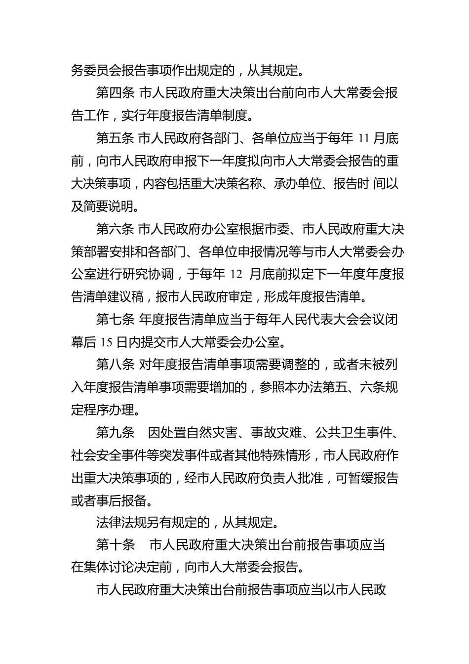 第一条为做好市人民政府重大决策出台前向市人民代表大会常务委员会(以下简称市人大常委会)报告工作,根据《中华人民共和国宪法》《中华人民共和国地方各级人民代表大会和地方各级人民政府组织法》《中华人民共和国各级人民代表大会常务委员会监督法》等有关规定,结合实际,制定本办法。第二条市人民政府办公室负责本办法的具体组织实施工作。市人民政府办公室应当加强与市人大常委会办公室沟通协调,及时研究处理本办法贯彻执行中的有关问题。第三条涉及下列重大决策事项的,市人民政府应当在出台前向市人大常委会报告:(一)加强本市民主法治建设的重大措施;(二)城镇建设、重大改革举措、重大民生工程、重大建设项目等重大事项;(三)市人大常委会认为市人民政府重大决策出台前应当报告的事项;(四)市人民政府认为重大决策出台前需要向市人大常委会报告的事项。法律法规对市人民政府应当向市人民代表大会及其常务委员会报告事项作出规定的,从其规定。第四条市人民政府重大决策出台前向市人大常委会报告工作,实行年度报告清单制度。第五条市人民政府各部门、各单位应当于每年11月底前,向市人民政府申报下一年度拟向市人大常委会报告的重大决策事项,内容包括重大决策名称、承办单位、报告时间以及简要说明。第六条市人民政府办公室根据市委、市人民政府重大决策部署安排和各部门、各单位申报情况等与市人大常委会办公室进行研究协调,于每年12月底前拟定下一年度年度报告清单建议稿,报市人民政府审定,形成年度报告清单。第七条年度报告清单应当于每年人民代表大会会议闭幕后15日内提交市人大常委会办公室。第八条对年度报告清单事项需要调整的,或者未被列入年度报告清单事项需要增加的,参照本办法第五、六条规定程序办理。第九条因处置自然灾害、事故灾难、公共卫生事件、社会安全事件等突发事件或者其他特殊情形,市人民政府作出重大决策事项的,经市人民政府负责人批准,可暂缓报告或者事后报备。法律法规另有规定的,从其规定。第十条市人民政府重大决策出台前报告事项应当在集体讨论决定前,向市人大常委会报告。市人民政府重大决策出台前报告事项应当以市人民政府名义向市人大常委会报告。市人大常委会审议重大决策事项报告时,由市长、副市长或受市人民政府委托的相关负责人作说明,听取意见,回答询问。第十一条市人民政府重大决策出台前报告应当包括:(一)重大决策草案及起草说明;(二)重大决策事项制定的法律法规和政策依据;(三)部门和社会公众意见采纳情况等相关材料,以及应当提交的调研报告、听证报告、专家论证意见和风险评估报告等;(四)合法性审查意见;(五)其他有关材料。第十二条各县市区人民政府和市直有关单位应当按照要求,配合市人大常委会为做好听取重大决策出台前报告所组织的相关视察、调研和论证等工作。第十三条市人大常委会对重大决策事项提出意见建议的,市人民政府应当认真组织研究,并按规定向市人大常委会反馈相关情况。第十四条本办法自印发之日起施行。