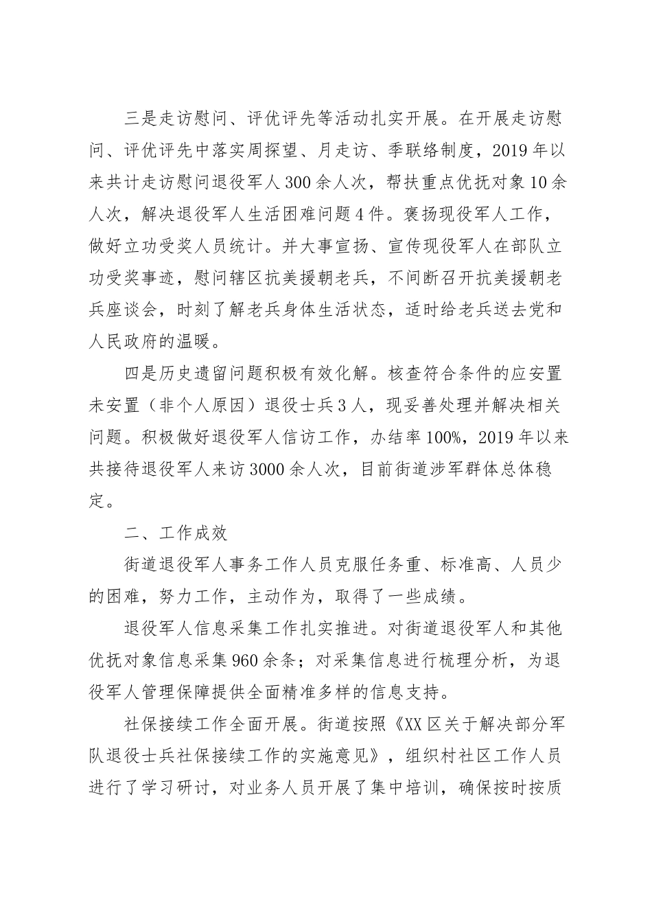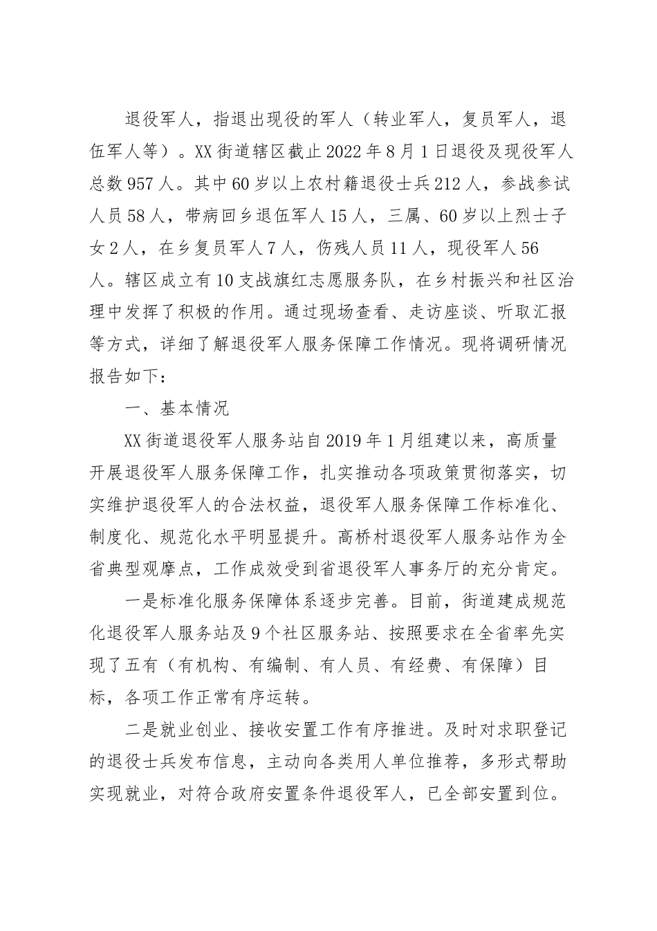 街道退役军人服务保障调研情况报告退役军人,指退出现役的军人(转业军人,复员军人,退伍军人等)。XX街道辖区截止2022年8月1日退役及现役军人总数957人。其中60岁以上农村籍退役士兵212人,参战参试人员58人,带病回乡退伍军人15人,三属、60岁以上烈士子女2人,在乡复员军人7人,伤残人员11人,现役军人56人。辖区成立有10支战旗红志愿服务队,在乡村振兴和社区治理中发挥了积极的作用。通过现场查看、走访座谈、听取汇报等方式,详细了解退役军人服务保障工作情况。现将调研情况报告如下:一、基本情况XX街道退役军人服务站自2019年1月组建以来,高质量开展退役军人服务保障工作,扎实推动各项政策贯彻落实,切实维护退役军人的合法权益,退役军人服务保障工作标准化、制度化、规范化水平明显提升。高桥村退役军人服务站作为全省典型观摩点,工作成效受到省退役军人事务厅的充分肯定。一是标准化服务保障体系逐步完善。目前,街道建成规范化退役军人服务站及9个社区服务站、按照要求在全省率先实现了五有(有机构、有编制、有人员、有经费、有保障)目标,各项工作正常有序运转。二是就业创业、接收安置工作有序推进。及时对求职登记的退役士兵发布信息,主动向各类用人单位推荐,多形式帮助实现就业,对符合政府安置条件退役军人,已全部安置到位。三是走访慰问、评优评先等活动扎实开展。在开展走访慰问、评优评先中落实周探望、月走访、季联络制度,2019年以来共计走访慰问退役军人300余人次,帮扶重点优抚对象10余人次,解决退役军人生活困难问题4件。褒扬现役军人工作,做好立功受奖人员统计。并大事宣扬、宣传现役军人在部队立功受奖事迹,慰问辖区抗美援朝老兵,不间断召开抗美援朝老兵座谈会,时刻了解老兵身体生活状态,适时给老兵送去党和人民政府的温暖。四是历史遗留问题积极有效化解。核查符合条件的应安置未安置(非个人原因)退役士兵3人,现妥善处理并解决相关问题。积极做好退役军人信访工作,办结率100%,2019年以来共接待退役军人来访3000余人次,目前街道涉军群体总体稳定。二、工作成效街道退役军人事务工作人员克服任务重、标准高、人员少的困难,努力工作,主动作为,取得了一些成绩。退役军人信息采集工作扎实推进。对街道退役军人和其他优抚对象信息采集960余条;对采集信息进行梳理分析,为退役军人管理保障提供全面精准多样的信息支持。社保接续工作全面开展。街道按照《XX区关于解决部分军队退役士兵社保接续工作的实施意见》,组织村社区工作人员进行了学习研讨,对业务人员开展了集中培训,确保按时按质按量完成工作任务。主题表彰活动取得实效。在八一建军节来临之际,开展最美退役军人最美军嫂评选活动,弘扬新风、表彰先进,激发退役军人爱国拥军、自主创业的精神动力,激发广大退役军人和军嫂的自豪感、荣誉感和责任感,营造尊崇军人、关心关爱退役军人、支持退役军人创业的浓厚氛围。双拥工作再创佳绩。在春节及八一前期积极开展形式多样的慰问走访工作,重点走访驻区部队、部队离退休干部和其他重点优抚对象,使其形成制度化、常态化,进一步扩大了拥军优属的影响力,为XX区争创全省双拥模范县打下坚实基础。拓宽退役军人就业创业渠道。积极组织退役军人订单式定向式定岗式培训,提高退役军人就业创业能力,扩大就业渠道。光荣牌发放工作有声有色。坚决落实对辖区烈属、军属和退役军人等家庭悬挂光荣牌工作,主动上门提供服务,营造良好的拥军优属氛围,为900余户符合条件的家庭悬挂光荣牌。优待证办理工作有序推进。自2022年4月开展工作以来,积极学习办理流程并顺利展开办理工作,共办理优待证1011张。三、存在问题(一)少数已安置人员工作成效不优。部分人员安置上岗后,没有及时提供专业对口的就业指导服务、职业技能培训、心理疏导等,使得安置人员对新工作、新环境有一点迷茫,安置人员的岗位作用发挥有待进一步提高。(二)个别历史遗留问题解决办法不多。退役军人服务保障工作,遗留问题复杂多样,需要探索有效解决办法。如:因时间跨度长、档案资料不完善、相关证明证件缺失等原因,部分退役军人身份、条件核查难度较大。四、工...