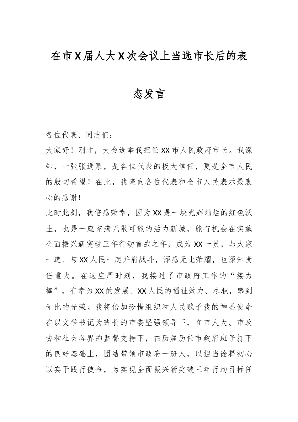 在市X届人大X次会议上当选市长后的表态发言各位代表、同志们:大家好!刚才,大会选举我担任XX市人民政府市长。我深知,一张张选票,是各位代表的极大信任,更是全市人民的殷切希望!在此,我谨向各位代表和全市人民表示最衷心的感谢!此时此刻,我倍感荣幸,因为XX是一块光辉灿烂的红色沃土,也是一座充满无限可能的活力新城,能有机会在实施全面振兴新突破三年行动首战之年,成为XX一员,与大家一道、与XX人民一起并肩战斗,深感无比荣耀,也深知责任重大。在这庄严时刻,我接过了市政府工作的“接力棒”,有幸为XX的发展、XX人民的福祉效力、尽职,感到无比的光荣。我将倍加珍惜组织和人民赋予我的神圣使命在以文举书记为班长的市委坚强领导下,在市人大、市政协和社会各界的监督支持下,在历届历任市政府班子打下的良好基础上,团结带领市政府一班人,以担当诠释初心以实干践行使命,为实现全面振兴新突破三年行动目标任务,奋力谱写中国式现代化XX篇章矢志奋斗。一、永葆忠诚之心,旗帜鲜明讲政治。始终把习近平新时代中国特色社会主义思想作为行动指南,深刻领悟“两个确立”的决定性意义,增强“四个意识”坚定“四个自信”、做到“两个维护”,全面贯彻落实党的XX大精神,不断提高政治判断力、政治领悟力和政治执行力。始终把党的全面领导贯穿政府工作全过程,强化抓落实主责意识,带头维护市委权威,步调一致、令行禁止确保市委各项决策部署落实落地。二、永葆奋斗之心,担当实干促振兴。坚持把发展作为第一要务,完整、准确、全面贯彻落实新发展理念,笃定高质量发展不动摇,盯住全面振兴新突破三年行动目标任务,按照市委“12345”总体部署,不断培育壮大环保装备制造、循环经济、农产品加工和清洁能源等产业,着力构建现代化产业体系;坚持项目为王不动摇,抢抓国省东北振兴政策机遇,特别是新时代东北振兴座谈会精神,包装、引进、实施一批高质量项目;坚持科技创新和数字赋能,做好结构调整三篇大文章,加快企业提质升级;坚持问题导向,强化服务规范,构建亲清政商关系为市场主体提供公平、稳定、可预期、可持续的营商环境。三、永葆为民之心,用情用力惠民生。牢固树立以人民为中心的发展思想,坚持把改善民生作为一切工作的出发点和落脚点,做到政策向民生聚焦、财力向民生倾斜、服务向民生覆盖。时刻把人民群众的安危冷暖放在心上,认真办好就业、教育、医疗、供暖、物业管理、文明城创建、美丽乡村建设等事关群众切身利益的民生实事,不断增强人民群众的获得感、幸福感、安全感。四、永葆尊崇之心,践行法治重规范。深入贯彻落实习近平法治思想,自觉维护宪法和法律权威坚持用法治思维和法治方式推进工作,解决问题。带头执行民主集中制,严格遵循行政决策程序,切实尊重班子成员意见,注重听取社会各界建议,做到民主决策、科学决策、依法决策。自觉接受人大及其常委会的法律监督和工作监督、政协的民主监督,主动接受社会和舆论监督。五、永葆敬畏之心,清正廉洁守底线。时刻牢记手中的权力是人民赋予的,时刻警醒自身言行,知敬畏、存戒惧、守底线,始终敬畏党、敬畏人民、敬畏法纪,做到依宪施政、依法行政、廉洁从政。认真履行“一岗双责”,严格遵守廉洁从政各项规定,严格执行中央八项规定精神,保持清正廉洁的政治本色,清清白白做人,踏踏实实做事。各位代表、同志们,实现梦想,惟有实干,我将时刻牢记面对宪法发出的神圣誓言,时刻牢记面对各位代表作出的庄严承诺,时刻牢记XX父老乡亲的信任与重托,在市委的坚强领导下,踔厉奋发、勇毅前行,全力以赴推动XX全面振兴全方位振兴!谢谢大家!