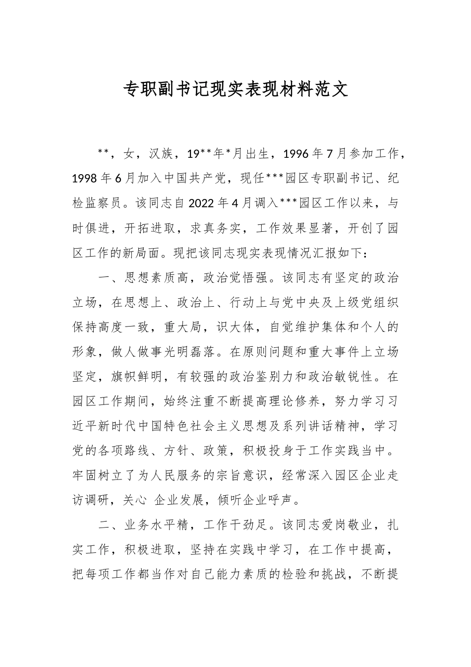 专职副书记现实表现材料范文**,女,汉族,19**年*月出生,1996年7月参加工作,1998年6月加入中国共产党,现任***园区专职副书记、纪检监察员。该同志自2022年4月调入***园区工作以来,与时俱进,开拓进取,求真务实,工作效果显著,开创了园区工作的新局面。现把该同志现实表现情况汇报如下:一、思想素质高,政治觉悟强。该同志有坚定的政治立场,在思想上、政治上、行动上与党中央及上级党组织保持高度一致,重大局,识大体,自觉维护集体和个人的形象,做人做事光明磊落。在原则问题和重大事件上立场坚定,旗帜鲜明,有较强的政治鉴别力和政治敏锐性。在园区工作期间,始终注重不断提高理论修养,努力学习习近平新时代中国特色社会主义思想及系列讲话精神,学习党的各项路线、方针、政策,积极投身于工作实践当中。牢固树立了为人民服务的宗旨意识,经常深入园区企业走访调研,关心企业发展,倾听企业呼声。二、业务水平精,工作干劲足。该同志爱岗敬业,扎实工作,积极进取,坚持在实践中学习,在工作中提高,把每项工作都当作对自己能力素质的检验和挑战,不断提高自己的工作能力和业务水平,围绕产业发展、项目建设党的建设等工作重点,全力以赴、攻坚克难,取得了突出的工作业绩。全力投入**地区服饰经营户向**产业园转移工作,推动27家服饰产业经营户完成转移。疫情防控期间,协助街道进行核酸检测,积极开展上门检测,同时,考虑企业闭环生产实际困难,为企业累计发放蓝色通行证、“白名单卡”,疫情防控后期积极推动园区企业复工复产。疫情期间多方组织发动企业向区慈善会捐款捐物,累计捐款近300万元。作为园区党建工作的主要负责人,在基层党建方面同样做了大量工作,2022年新建两新支部2个、功能型两新党支部25个,企业覆盖率达95%,新发展党员11名,其中,**党支部成功创建市级两新标杆党组织,**党支部成功创建区级两新标杆党组织。三、思想观念新,工作方法多。该同志能够正确把握时代发展的要求,科学地判断形势,从全局性、前瞻性、战略性的高度思考问题、把握方向。工作有魄力,善于抓大事,抓主要矛盾,处理问题迅速果断,有较强的应对复杂局面和解决复杂矛盾的能力。办事情既能坚持原则,又能主动解决遇到的困难和问题,工作勤勤勉勉,又勇于创新,能够比较出色的完成分工负责的各项工作任务,展现出良好的工作能力和精神风貌,得到领导和同事的肯定和好评。四、廉洁自律清,工作作风正。该同志在廉洁从政方面,能严格自律,时时刻刻按照党员的标准严格要求自己自觉遵守党的纪律,保持清醒的头脑,自觉抵制腐朽思想的侵蚀。坚持奉行“为了一切群众,为了群众的一切”的宗旨开展工作,从不以势欺人,从不向群众索拿卡要。坚持率先垂范的做人准则,凡是要求别人做的,自己首先做到,禁止别人做的事,自己坚决不做,自觉的接受党和群众的批评和监督。有较好的大局观念和团队精神,善于集中正确意见,善于团结同志,文化和旅游局廉政风险点防控自查报告今年以来,为进一步从源头上预防腐败的滋生,不断加大预防腐败的力度,充分发挥廉政风险防控对文旅事业融合发展的保障作用,推进全局廉政风险防控机制建设,提升全局党员干部廉政风险防控能力,我们在全系统范围内开展了岗位廉政风险点和风险岗位排查工作,为文旅事业融合发展和干部干事创建奠定了坚实的政治保障和纪律保障。现根据***市委办《关于在全市开展加强廉政风险防控工作的实施方案》通知要求,并结合我局工作职能和业务特色,将自查报告汇报如下:一、工作开展情况1、全面排查。在岗位廉政风险点和风险岗位排查过程中,为了把风险点找全、找准、找到位,我们要求各科室各单位根据三定方案规定的职能职责和工作实际,全面排查本部门本科室在岗位职责、工作流程、制度管理、政策执行落实等方面可能存在的风险,特别是对涉及管人、管事、管财、管物、管项目等廉政风险等级比较高的工作环节都要进行全面细致精准的梳理排查,通过自己查、同事提、领导点、相互找等方法,局办公室、财务科、文化科、旅游科市场监管科、政工科、党建办等***个科室(单位),在思想建设、财务管理、选人用人、廉政教育等四大...