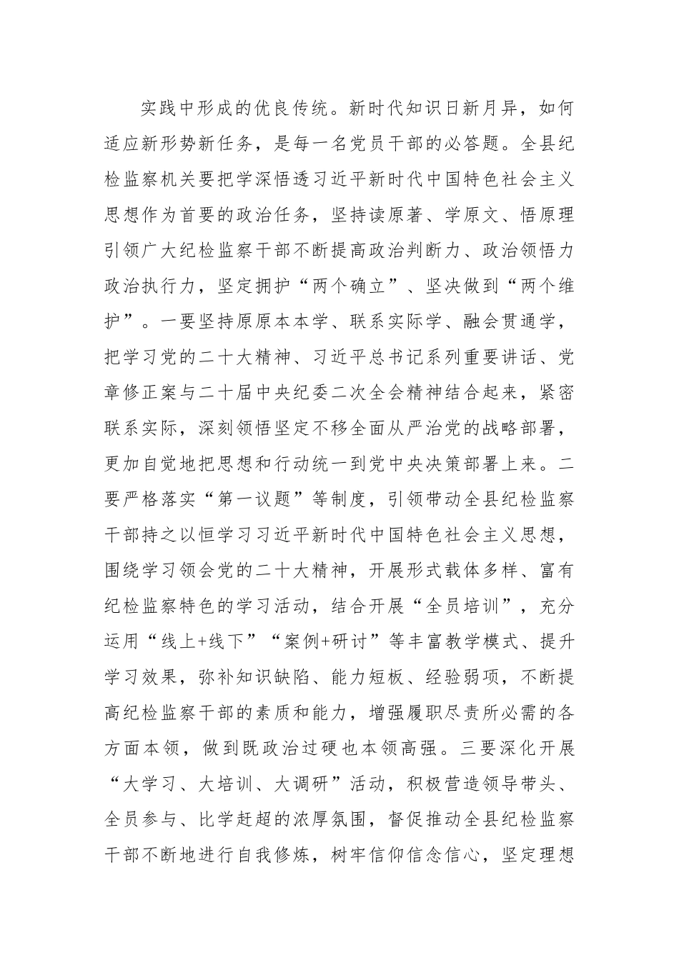 2023年X纪检监察干部队伍教育整顿研讨发言材料二十届中央纪委二次全会对“锻造堪当新时代新征程重任的高素质纪检监察干部队伍”做出部署安排,提出“强化能力建设,发扬斗争精神,坚定斗争意志,增强斗争本领,用好深学习、实调研、抓落实工作方法,打造敢于善于斗争的纪检监察铁军。”2023年是贯彻党的二十大精神的开局之年,是实施“十四五”规划承前启后的关键一年,面对“一刻不停推进全面从严治党,保障党的二十大决策部署贯彻落实”新形势、新任务,全县纪检监察机关将主动用好“深学习、实调研、抓落实”的工作机制和方法,结合纪检监察干部队伍教育整顿,坚持在深学习中找准调研、落实的目标、方向和要求;在实调研中深化学习、找准症结、破解难题、推动工作;在抓落实中把学习调研成果推广好运用好,不断增强责任感使命感,以更加昂扬的姿态履职尽责,以新担当新作为展现开局之年履职新气象,推动全县纪检监察工作高质量发展再上新台阶。一、在深学习上下功夫,切实做到学思用贯通、知信行统一,进一步提高履行岗位职责本领二十届中央纪委二次全会提出,“在深学习上下功夫……切实做到学思用贯通、知信行统一。”立身百行,以学为基。重视学习、善于学习、坚持学习,是我们党在长期实践中形成的优良传统。新时代知识日新月异,如何适应新形势新任务,是每一名党员干部的必答题。全县纪检监察机关要把学深悟透习近平新时代中国特色社会主义思想作为首要的政治任务,坚持读原著、学原文、悟原理引领广大纪检监察干部不断提高政治判断力、政治领悟力政治执行力,坚定拥护“两个确立”、坚决做到“两个维护”。一要坚持原原本本学、联系实际学、融会贯通学,把学习党的二十大精神、习近平总书记系列重要讲话、党章修正案与二十届中央纪委二次全会精神结合起来,紧密联系实际,深刻领悟坚定不移全面从严治党的战略部署,更加自觉地把思想和行动统一到党中央决策部署上来。二要严格落实“第一议题”等制度,引领带动全县纪检监察干部持之以恒学习习近平新时代中国特色社会主义思想,围绕学习领会党的二十大精神,开展形式载体多样、富有纪检监察特色的学习活动,结合开展“全员培训”,充分运用“线上+线下”“案例+研讨”等丰富教学模式、提升学习效果,弥补知识缺陷、能力短板、经验弱项,不断提高纪检监察干部的素质和能力,增强履职尽责所必需的各方面本领,做到既政治过硬也本领高强。三要深化开展“大学习、大培训、大调研”活动,积极营造领导带头、全员参与、比学赶超的浓厚氛围,督促推动全县纪检监察干部不断地进行自我修炼,树牢信仰信念信心,坚定理想信念不动摇,做党和人民的忠诚卫士。二、在实调研上下功夫,转变作风树好形象,进一步增强执纪执法为民能力水平二十届中央纪委二次全会提出,“在实调研上下功夫……通过扎实调研,找准问题,找对路径,找到解决问题的办法和举措。”调查研究是谋事之基、成事之道,认真开展调查研究,必须树立求真务实的作风。2023年,我们谋划了多项创新性工作,要全面推进落实这些工作,必须周密部署安排、深入调查研究,找准找实纪检监察工作中的短板不足,把新情况新问题找出来、把创新经验总结好在深入分析思考上下功夫,找到破解难题的办法,拿出切实可行的方案措施,不断提高结合实际创造性开展工作的水平。一要围绕开展乡村振兴领域不正之风和腐败问题专项整治做实调研。按照中央纪委《关于开展乡村振兴领域不正之风和腐败问题专项整治的意见》部署要求,重点围绕产业、人才、文化、生态、组织“五个振兴”,寻求解决农村党员干部在乡村振兴中贪污侵占、骗取套取、截留挪用、吃拿卡要、优亲厚友、搞暗箱操作、权钱交易等问题等行为的治本之策,为在全县开展农村党员干部在乡村振兴中违纪违法突出问题专项整治工作提供详实资料。二要围绕护航优化营商环境做实调研。按照省纪委监委《关于开展护航优化营商环境专项行动的实施意见》部署要求聚焦市场主体普遍关注、反映强烈、反复出现、制约发展和不依法行政、不依法办事问题,以及不担当、不作为、假作为、乱作为和漠视群利益的作风问题,寻求打造高效便捷的政务环境、公平...