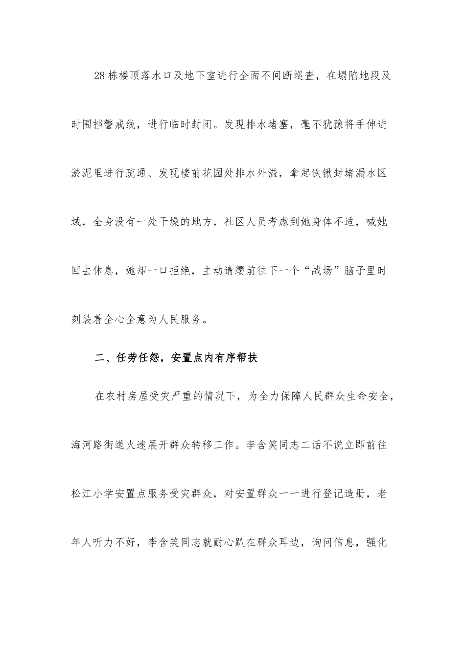 防汛救灾先进个人事迹材料1择一业忠一事哪里需要你就是哪里的战士没有战袍也可震慑千军万马化作幕后你用文字记录着战场上动人的故事7月11日以来,受“烟花”和副热带高压气流影响,我市多地遭遇暴雨“车轮战”,防汛应急响应级别更是由II级提升为I级,科创中心作为最大降水量站点,24小时内降水峰值一度达到777.5毫米,造成渤海路街道以北地区水位不断上涨,农村房屋多处受灾严重。洪水汹汹,牵动人心,防汛救灾工作刻不容缓。李含笑同志虽然参加工作不到一年,但在防汛一线的战场上,她不畏艰险,任劳任怨,以实际行动在抗洪救灾中彰显着一位共产党员的本色、一名选调生的风采、一个基层干部的担当,她与大自然赛跑,她与风雨斗争,用自己的身体守护着人民群众的安全。一、冲锋在前,暴雨中的细致排查7月21日下午,我市雨势不断增强,量极大、范围广。由于地势原因,多处社区、房屋被淹。在海河路街道的防汛工作部署下,李含笑同志被分到北晨嘉园社区开展防汛工作,在没有雨衣、胶靴等防护的情况下,李含笑同志不畏险阻,不顾自身过敏和特殊生理期的不适,冒雨冲锋在前,淌着及膝的水流,跟着社区工作人员一起细致排查地下积水、地面塌陷等安全隐患,对84个单元楼、90余部电梯、28栋楼顶落水口及地下室进行全面不间断巡查,在塌陷地段及时围挡警戒线,进行临时封闭。发现排水堵塞,毫不犹豫将手伸进淤泥里进行疏通、发现楼前花园处排水外溢,拿起铁锹封堵漏水区域,全身没有一处干燥的地方,社区人员考虑到她身体不适,喊她回去休息,她却一口拒绝,主动请缨前往下一个“战场”脑子里时刻装着全心全意为人民服务。二、任劳任怨,安置点内有序帮扶在农村房屋受灾严重的情况下,为全力保障人民群众生命安全,海河路街道火速展开群众转移工作。李含笑同志二话不说立即前往松江小学安置点服务受灾群众,对安置群众一一进行登记造册,老年人听力不好,李含笑同志就耐心趴在群众耳边,询问信息,强化人员安全管理,1个多小时内,迅速全面登记受灾人员信息488人。这项任务完成了,李含笑同志又迅速投入到打扫卫生、分发餐食、等工作当中,直到凌展2点多,400多名老百姓全部得到妥善安置,她才托着疲惫的身躯趴到了桌子上。为给受灾群众提供一个温馨舒适的居住环境,李含笑同志和海河路街道的工作人员一起,对安置点进行清洁消杀,帮助群众打扫卫生、收拾房间、整理床铺,让他们即使“流落”在外,依旧体会到家的温暖。三、尽职尽责,办公室里保障后勤安置点情况稳定之后,为保障防汛信息畅通、救援工作及时顺利上报。李含笑同志留在办公室内,坚持18个小时开展信息对接工作,第一时间保证信息上传下达,撰写文字材料1万余字,上报美篇信息10篇,上报防汛实事照片、视频150余张,及时有效宣传防汛战场上的英勇事迹,全力保障后勤工作稳定有序进行,每一次艰难险阻都是对初心的考验、对党性的锤炼。她无视身体不适,用无畏的行动向群众践行着她入党时喊出的铮铮誓言;她尽职尽责的完成每项任务,用无怨无悔向祖国诉说着她身为选调生的使命!防汛救灾先进个人事迹材料2离开城里的繁华化身人民的公仆红妆退去长裙换成战衣大雨滂沱你依旧顶天立地以身开路不负选调的光荣名誉7月21日,一场突如其来的暴风雨席卷鹤壁,根据气象台检测,21日05时-21日17时,全国最大降水量出现在鹤壁科创中心,累计降雨量已超过1113.5毫米。科创中心位于我区海河路街道的中心位置,以科创中心为中心,辖区内多条道路出现积水,多个村庄被淹,防汛工作紧急而又艰巨,黄凯琳同志冲锋在前,充分发挥一名党员的先锋作用、树牢一名选调生的责任意识、彰显一名基层干部的担当作为,迅速投入防汛工作,筑牢群众的安全墙。不惧危险,勇当防汛先锋员海河路街道辖区内的渤海路由于地势低于107国道,大量107国道的水自西向东流入渤海路,道路上的积水已经淹没膝盖。黄凯琳同志曾经挂职的刘长屯村就在渤海路上,道路上的积水从村子的南门汹涌流入村子,村内积水严重,大量汽车面临被泡的危险、多处地下室出现漏水情况。黄凯琳同志迅速开车到村内查看情况,车子因为积水太多走不动,她就把车停在路边蹼着水去村子里,跟着村民一起...