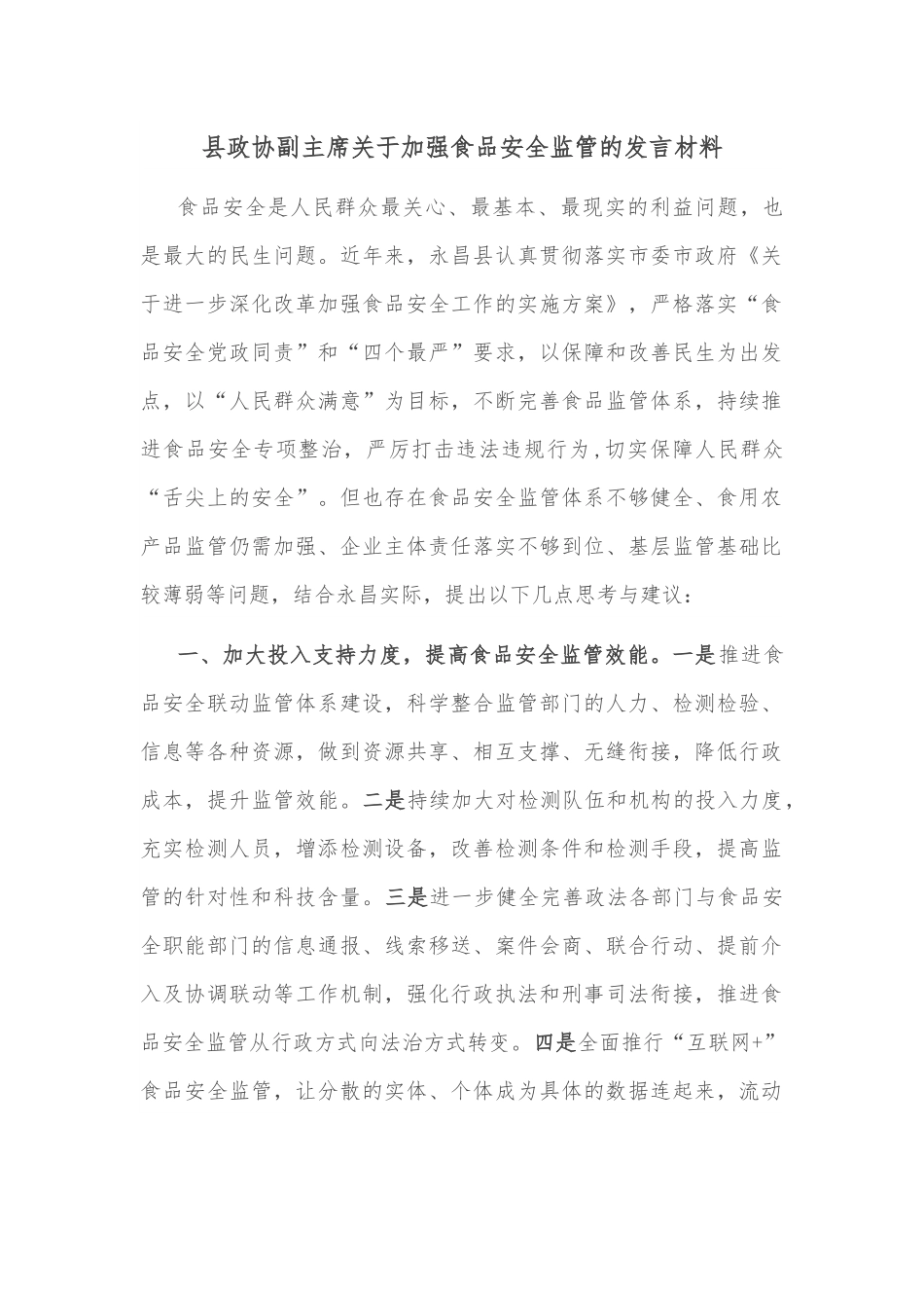 县政协副主席关于加强食品安全监管的发言材料食品安全是人民群众最关心、最基本、最现实的利益问题,也是最大的民生问题。近年来,永昌县认真贯彻落实市委市政府《关于进一步深化改革加强食品安全工作的实施方案》,严格落实“食品安全党政同责”和“四个最严”要求,以保障和改善民生为出发点,以“人民群众满意”为目标,不断完善食品监管体系,持续推进食品安全专项整治,严厉打击违法违规行为,切实保障人民群众“舌尖上的安全”。但也存在食品安全监管体系不够健全、食用农产品监管仍需加强、企业主体责任落实不够到位、基层监管基础比较薄弱等问题,结合永昌实际,提出以下几点思考与建议:一、加大投入支持力度,提高食品安全监管效能。一是推进食品安全联动监管体系建设,科学整合监管部门的人力、检测检验、信息等各种资源,做到资源共享、相互支撑、无缝衔接,降低行政成本,提升监管效能。二是持续加大对检测队伍和机构的投入力度,充实检测人员,增添检测设备,改善检测条件和检测手段,提高监管的针对性和科技含量。三是进一步健全完善政法各部门与食品安全职能部门的信息通报、线索移送、案件会商、联合行动、提前介入及协调联动等工作机制,强化行政执法和刑事司法衔接,推进食品安全监管从行政方式向法治方式转变。四是全面推行“互联网+”食品安全监管,让分散的实体、个体成为具体的数据连起来,流动起来,实现智慧监管,提高监管效能,推动食品安全工作健康有序开展。二、强化日常监督和专项整治,倒逼各领域食品安全责任落实。大力开展市场巡查,将日常监管与专项治理相结合,加大执法力度,充分利用县内新闻媒体,大力开展违法行为的曝光,形成社会共治的良好局面。加强食品源头污染整治,对种养殖业开展农药残留、兽药残留整治,消除违禁药物使用,宣传推广合理使用农药、化肥,减少对初级农产品的污染;加强生产加工环节整治,特别是在农村普遍存在的“磨面坊”、“榨油坊”等小作坊的日常监管,建立完善企业质量档案,加大日常抽检力度;加强食品流通环节整治,深入推进“追溯码+合格证”监管新模式,严厉打击经营假冒伪劣食品行为,对集贸市场、小商店、小超市、代销点、流动摊贩进行整治,提高其责任意识;加强农村餐饮服务行为整治,重点对小餐饮、建筑工地食堂、农村红白事聚餐等持续加大监管力度。强化校园食品安全监管,严格落实食品安全校长(园长)负责制和学校相关负责人陪餐制度,以更严更高标准对每一个环节严格把关,逐个排查风险,消除隐患。统筹抓好疫情防控工作,持续做好进口冷链食品安全监管工作,严格落实“三专、三证、四不”要求,严守进口冷链食品关。深入开展食品领域侵害群众利益突出问题专项整治,紧紧围绕食醋、肉制品、乳制品、食用豆芽、保健食品虚假宣传、农家乐、早餐摊点、网络订餐等重点品种和重点环节,实施集中整治、强化精准突破,解决突出问题,切实保障人民群众饮食安全。三、积极探索创新,建立健全食品安全监管长效机制。一是强化食品企业(经营户)是食品质量安全第一责任人的责任意识,牢固树立“诚信至上、以质取胜、守法经营”的经营理念,将社会责任观念融入企业经营决策之中,建立健全企业食品质量安全责任制和食品安全责任追溯制度。二是建立食品生产经营户质量档案和食品安全诚信档案,对诚信守纪企业大力宣传褒扬,对问题食品和问题企业(经营户)公开曝光,建立守信受益、失信惩罚的激励约束机制和以诚信为凭证的行业准入机制,使失信企业(经营户)失去生存空间。三是建立食品安全监管工作考核激励机制,明确工作任务,量化考核指标,建立科学合理的食品安全工作考核激励机制,进一步调动食品安全工作人员的积极性。四是构筑及时有效的“群众监督网”,充分发挥食品安全社会监督员桥梁纽带作用,及时发现食品安全问题线索,协助排查化解食品安全风险隐患和推进文明餐桌行动,共同守护“舌尖上的文明”。四、加大食品安全宣传力度,提高全民食品安全意识。一是提高食品产业的队伍建设与设施建设水平,通过建设食品行业人员高素质队伍、运用好新设备与新技术,保障食品生产、流通过程中的质量安全。二是大力...