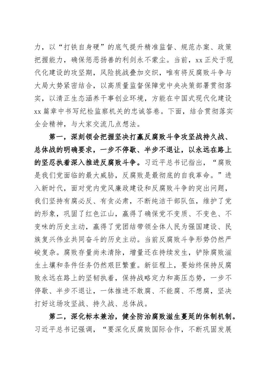 纪检监察领导干部学习中央纪委四次全会精神交流研讨发言材料(1)各位领导、同志们:习近平总书记在二十届中央纪委四次全会上的重要讲话,立足新时代党的建设新的伟大工程实践,以清醒的历史自觉、强烈的忧患意识和深远的战略智慧,深刻揭示了反腐败斗争的历史逻辑、实践要求与时代使命。讲话立足“反腐败斗争取得压倒性胜利并全面巩固”这一历史性成果,系统阐明了一体推进不敢腐、不能腐、不想腐的战略内涵,既是对党的十八大以来全面从严管党治党实践经验的科学凝练,更是向新征程上纵深推进反腐败斗争发出的政治动员令。我深切体会到,习近平总书记提出的“四个任重道远”重大论断,既是对反腐败斗争长期性、复杂性、艰巨性的清醒判断,也是对纪检监察机关坚定斗争意志、把准斗争方向的政治嘱托。学习好、贯彻好全会精神,必须牢牢把握政治机关属性,从“两个确立”中汲取力量、以“两个维护”校准方向,既要扛稳“永远吹冲锋号”的政治责任,就要聚焦重点领域腐败问题深化靶向施治,在严查系统性腐败、行业性积弊上保持“惩”的强度;又要紧扣“三不腐”一体推进这一重大方法论,以“全周期管理”思维推动制度堵漏、监督促治、教育固本有机贯通,让“后半篇文章”从个案整改向全域治理延伸;更要以刀刃向内的勇气锻造铁军队伍,在斗争实践中锤炼政治判断力、政治领悟力、政治执行力,以“打铁自身硬”的底气提升精准监督、规范办案、政策把握能力,确保惩恶扬善的利剑永不蒙尘。当前,xx正处于现代化建设的攻坚期,风险挑战叠加交织,唯有将反腐败斗争与大局大势紧密结合,以高质量监督保障党中央决策部署贯彻落实,以清正生态涵养干事创业环境,方能在中国式现代化建设xx篇章中书写纪检监察机关的忠诚答卷。下面,结合贯彻落实全会精神,与大家交流几点想法。第一,深刻领会把握坚决打赢反腐败斗争攻坚战持久战、总体战的明确要求,一步不停歇、半步不退让,以永远在路上的坚忍执着深入推进反腐败斗争。习近平总书记指出,“腐败是我们党面临的最大威胁,反腐败是最彻底的自我革命。”进入新时代,面对党内党风廉政建设和反腐败斗争的突出问题,我们坚持有腐必反、有贪必肃,不断纯洁干部队伍,维护了党的形象,巩固了红色江山,赢得了确保党不变质、不变色、不变味的历史主动,赢得了党团结带领全体人民为强国建设、民族复兴伟业共同奋斗的历史主动。当前反腐败斗争形势仍然严峻复杂。腐败存量尚未清除,增量还在持续发生,铲除腐败滋生土壤和条件任务仍然艰巨繁重。新征程上,要始终保持反腐败永远在路上的坚韧执着,保持战略定力和高压态势,一步不停歇、半步不退让,一体推进不敢腐、不能腐、不想腐,坚决打好这场攻坚战、持久战、总体战。第二,深化标本兼治,健全防治腐败滋生蔓延的体制机制。习近平总书记强调,“要深化反腐败国际合作,不断巩固发展反腐败斗争压倒性胜利”。当前,腐败问题呈现出隐形变异、翻新升级的特点,必须坚持系统观念、强化源头治理。一方面,要瞄准权力集中、资金密集、资源富集领域,紧盯项目审批、招投标、国企改革等关键环节,运用大数据监督、穿透式审计等手段,全链条排查廉政风险点,推动审批监管、执法司法、金融信贷等制度“补丁”动态升级,扎紧“不能腐”的笼子。另一方面,要深化以案促改、以案促治,针对粮食购销、乡村振兴等领域暴露的监管缺位问题,推动行业主管部门开展“清单式”自查整改,将个案整改成果转化为管人管事管权的长效机制,实现“查处一案、警示一片、治理一域”的综合效应。第三,强化政治监督,确保党中央决策部署穿透落实。纪检监察机关必须心怀“国之大者”,把监督保障习近平总书记重要指示批示精神和党的二十大战略部署在xx落地作为首要任务。聚焦长三角一体化发展、科技创新攻坚等重大战略,建立“立项监督—跟踪督办—问责问效”闭环机制,坚决纠治空泛表态、数据造假、推诿扯皮等“中梗阻”问题;围绕营商环境优化升级,深入开展“清风护企”专项行动,严查吃拿卡要、设租寻租等破坏市场公平行为,以“亲清指数”提升“发展指数”;紧盯生态环保、安全生产等底线任务,对虚假整改、纸面整改背后的形...