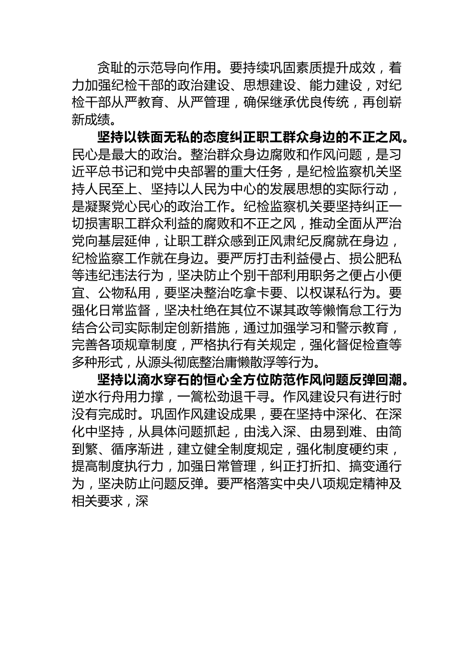 纪检监察干部研讨发言:坚定不移推进全面从严治党为高质量发展提供坚强保障今年是贯彻落实党的二十大精神开局之年,纵深推进全面从严治党、营造风清气正的政治生态至关重要,必须以更高标准、更严要求做好党风廉政建设和反腐败工作,为公司高质量发展奠定坚实基础,以实际行动贯彻落实党的二十大精神。坚持以时不我待的精神推动全面从严治党向纵深发展。“要强化政治监督,确保完整、准确、全面贯彻新发展理念。”习近平总书记在二十届中央纪委二次全会上的重要讲话,是公司各级党员干部的根本遵循、是公司纪委工作的行动指南。政治监督是纪检监察机关的主业,必须立足两个大局,心怀“国之大者”“企之要情”,将“两个维护”作为纪检监察工作的首要任务、根本指向。要持续巩固监督治理成效,坚持以政治监督为统领、各项监督贯通融合,着力构建全面覆盖、权威高效的监督体系,确保公司重大决策部署开展到哪里,政治监督就跟进到哪里。要持续巩固教育整顿成效,盯紧盯牢关键环节,充分运用监督检查、警示教育、执纪问责等手段,精准施策、持续加压。要持续巩固工作创新成效,不断创新工作思路、工作机制,将不利因素变为有利条件,将短板漏洞变为长项优势。要持续巩固文化浸润成效,善于运用现代多媒体手段,西安本地的廉政文化资源,充分发挥廉荣贪耻的示范导向作用。要持续巩固素质提升成效,着力加强纪检干部的政治建设、思想建设、能力建设,对纪检干部从严教育、从严管理,确保继承优良传统,再创崭新成绩。坚持以铁面无私的态度纠正职工群众身边的不正之风。民心是最大的政治。整治群众身边腐败和作风问题,是习近平总书记和党中央部署的重大任务,是纪检监察机关坚持人民至上、坚持以人民为中心的发展思想的实际行动,是凝聚党心民心的政治工作。纪检监察机关要坚持纠正一切损害职工群众利益的腐败和不正之风,推动全面从严治党向基层延伸,让职工群众感到正风肃纪反腐就在身边,纪检监察工作就在身边。要严厉打击利益侵占、损公肥私等违纪违法行为,坚决防止个别干部利用职务之便占小便宜、公物私用,要坚决整治吃拿卡要、以权谋私行为。要强化日常监督,坚决杜绝在其位不谋其政等懒惰怠工行为结合公司实际制定创新措施,通过加强学习和警示教育,完善各项规章制度,严格执行有关规定,强化督促检查等多种形式,从源头彻底整治庸懒散浮等行为。坚持以滴水穿石的恒心全方位防范作风问题反弹回潮。逆水行舟用力撑,一篙松劲退千寻。作风建设只有进行时没有完成时。巩固作风建设成果,要在坚持中深化、在深化中坚持,从具体问题抓起,由浅入深、由易到难、由简到繁、循序渐进,建立健全制度规定,强化制度硬约束,提高制度执行力,加强日常管理,纠正打折扣、搞变通行为,坚决防止问题反弹。要严格落实中央八项规定精神及相关要求,深挖细查“四风”问题隐形变异的种种表现,紧盯关键节点对顶风违纪行为从严查处,对典型案例通报曝光,坚决防止“四风”特别是形式主义、官僚主义问题反弹回潮。要重视新形势下的“文山会海”问题,统筹规范调研督查检查考核工作,严格控制总量和频次,避免多头督查调研,切实给基层“减负”。要持续推动廉洁文化建设,加强党性党风教育,大力弘扬苦干实干等优良作风,密切联系职工群众,培养斗争精神,倡导真抓实干、担当作为。坚持以攻坚克难的勇气加大干部的教育管理监督力度。监督是纪检监察机关基本职责、第一职责,高质量监督才能促进纪检监察工作高质量发展。要把自上而下和自下而上的监督结合起来,用好批评和自我批评武器,破解同级监督难题,抓住“关键少数”、守住重点节点、紧盯薄弱环节,做深做实日常监督,从经常化全方位监督入手,切实把管行为和管思想统一起来,把管工作圈与管社交圈衔接起来把管八小时内与管八小时外贯通起来,让党员干部切身感受到监督常在。要始终坚守监督执纪问责的职能定位,准确把握“四种形态”,积极运用批评教育、约谈函询、诫勉谈话、组织处理、纪律处分等方式开展执纪问责,对违纪行为发现一起查处一起,让那些想搞违纪的人断了念头、搞了违纪的人付出代价。要以纪律为尺子,在线索处置、纪律审查、...