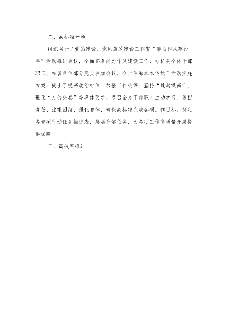 XX市XX党组能力作风建设经验交流总结材料全市机关“能力作风建设年”活动启动以来,市外办党组认真贯彻落实省、市委部署要求,紧盯市委、市政府中心工作,迅速行动,紧盯目标重点,把践行“五个新提升、六个新跨越”作为检验活动成效的重要标准,分析存在问题,找到提升路径,以创新“五大平台”建设为抓手,跳起摸高,推动机关干部能力全面提升、作风向严向实、落实有力有效。牢固树立“忠诚敏锐、精准高效、守规安全”工作理念,积极打造“外事争先、服务一流”党建品牌,坚持党建引领高起点开局,聚焦主业高标准推进,在发挥外事力量上谋求作为,采取“三项措施”高标准推进机关“能力作风建设年”活动高效开展。一、高起点谋划XX党组对能力作风建设工作高度重视,市委召开能力作风建设工作会议后,第一时间召开主任办公会,传达会议精神,要求全办统一思想认识,提高政治站位,将开展“能力作风建设”系列行动作为重要任务来抓。明确了“忠诚敏锐、精准高效、守规安全”的工作理念,并以此为统领,提前谋划具体工作内容,研究制定《市外办机关“能力作风建设年”活动实施方案》,确定了“解放思想、振兴发展”研讨和7个专项行动为主要内容的“1+7”综合性措施,为能力作风建设工作顺利开展提供了根本保障。成立办“能力作风建设”领导小组,设立3个专项工作组,明确责任分工,构建上下贯通、齐抓共管、强力推进的工作格局。二、高标准开局组织召开了党的建设、党风廉政建设工作暨“能力作风建设年”活动推进会议,全面部署能力作风建设工作,办机关全体干部职工、办属单位部分党员参加会议。会上原原本本传达了活动实施方案,提出了提高政治站位、加强工作统筹、坚持“跳起摸高”、强化“打铃交卷”等具体要求,号召全办干部职工主动学习、勇担责任、注重团结、强化自律,确保高标准完成各项工作目标。制定各专项行动任务推进表,层层分解任务,为各项工作高质量开展提供保障。三、高效率推进市外办坚持解放思想,创新观念,采取三项措施,全力推动机关能力作风建设走深走实。一是固化一批品牌活动。重点打造党建品牌活动,深化“彩虹桥”行动。组织开展青年理论学习小组实践活动,与共建社区开展“忆党史、提作风、志愿行”主题党日活动,开展“警钟长鸣”警示教育活动,开展军队光荣传统教育,开展外事课题撰写工作,提炼我办文明公约。通过开展彩虹桥行动,全面提升干部职工综合素质,提振想事、干事、成事精气神,为我市全面振兴全方位振兴贡献力量。二是建立一套动态管理机制。在意识形态防渗透、外国记者管理、涉外舆情、领保宣传、PU邀请函发放等方面建立系列工作流程和管理机制。做好涉外疫情防控工作,动态监督落地管控措施,确保不漏一人。三是建设一支高素质队伍。通过参观见学、专家讲学、交流互学、比武促学等方式,打造“外事课堂”“外事讲堂”“外事赛场”三个平台。加强学用结合,建设“忠诚敏锐”的干部队伍;组织岗位练兵,提升“精准高效”的工作标准;完善各项制度,建立“守规安全”的工作模式。通过“书香外事”“双语播报”等多维度活动,促进干部职工自觉增强“八种本领”、提高“七种能力”,落实“五细”要求、弘扬“工匠精神”,全方位展示市外办精神风貌。四、高标准实行锚定目标念好“实”字诀。XX党组针对具有全局性、牵动性的突出问题,在提能力转作风、办好民生实事上“出实招”。全面启动“春风行动”云聘会系列活动,采取“1+16+N”模式,开展了形式多样、内容丰富的线上、线下招聘及服务活动。依托“广播+新华社现场云+快手”等融媒体,先后开展了“稳岗留工”“乡村振兴”“高校毕业生”“退役军人”等7个专场云聘会;举办了“返乡创业指导”“就业政策解读”等4场云指导服务专场直播。活动期间全市共组织举办“直播带岗”专场、云聘会等193场次,有1001家企业提供就业岗位8000余个,接待求职登记2.7万余人次,为9.5万人次提供了职业指导和职业介绍服务。下一步,XX组将以更高标准、更严要求持续深入开展“能力作风建设年”活动,努力推进作风建设在“站排头”“争一流”。