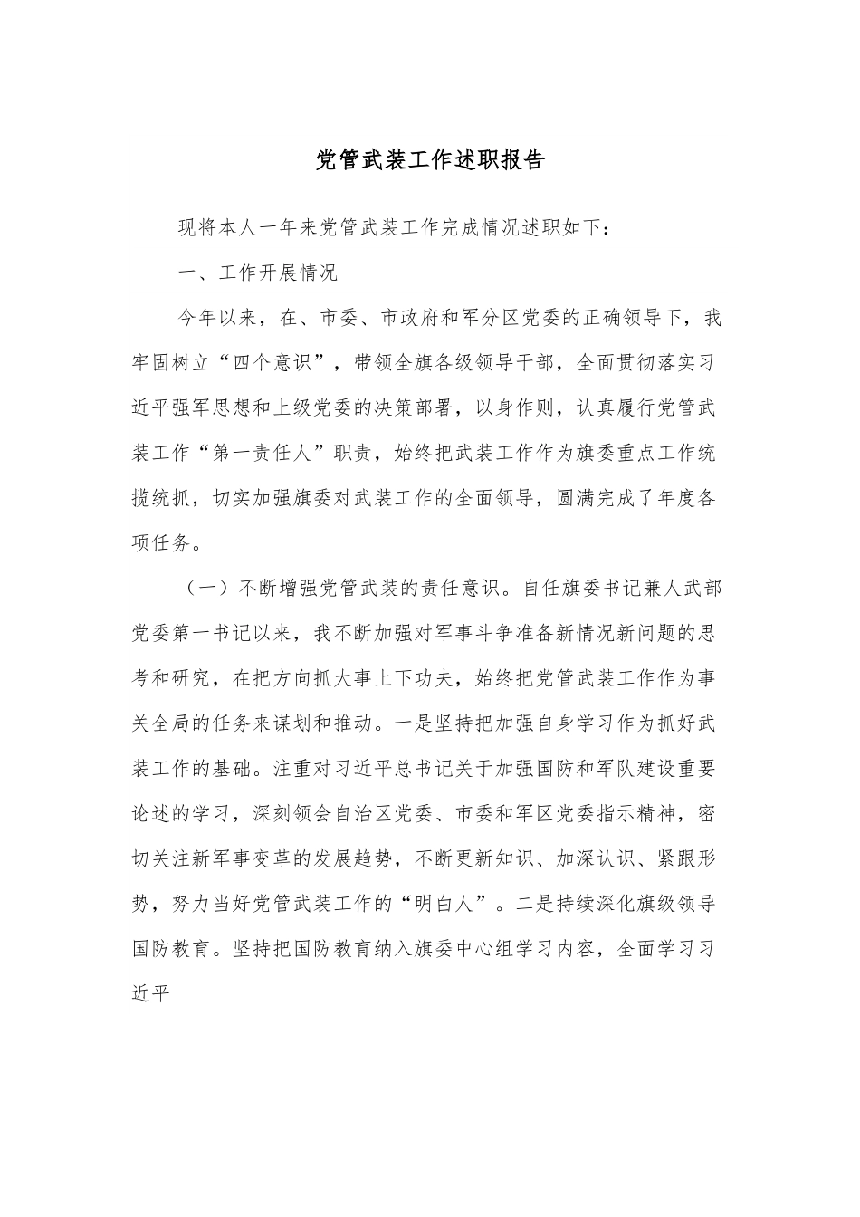 党管武装工作述职报告现将本人一年来党管武装工作完成情况述职如下:一、工作开展情况今年以来,在、市委、市政府和军分区党委的正确领导下,我牢固树立“四个意识”,带领全旗各级领导干部,全面贯彻落实习近平强军思想和上级党委的决策部署,以身作则,认真履行党管武装工作“第一责任人”职责,始终把武装工作作为旗委重点工作统揽统抓,切实加强旗委对武装工作的全面领导,圆满完成了年度各项任务。(一)不断增强党管武装的责任意识。自任旗委书记兼人武部党委第一书记以来,我不断加强对军事斗争准备新情况新问题的思考和研究,在把方向抓大事上下功夫,始终把党管武装工作作为事关全局的任务来谋划和推动。一是坚持把加强自身学习作为抓好武装工作的基础。注重对习近平总书记关于加强国防和军队建设重要论述的学习,深刻领会自治区党委、市委和军区党委指示精神,密切关注新军事变革的发展趋势,不断更新知识、加深认识、紧跟形势,努力当好党管武装工作的“明白人”。二是持续深化旗级领导国防教育。坚持把国防教育纳入旗委中心组学习内容,全面学习习近平总书记强军兴军的重要论述,突出抓好国家民族历史文化传统教育和我党我军国防法规宣传,着力强化拥武意识,营造拥武氛围,提高党员领导干部国防观念。三是增强广大干部群众国防观念和爱军拥军意识。组建国防教育讲师团,不定期深入机关、学校、嘎查、社区和生产一线进行国防教育宣讲,使关心国防、热爱国防、建设国防、保卫国防成为全社会的思想共识和自觉行动。(二)切实加强党管武装工作的领导。坚持把武装工作摆上旗委重要议事日程,纳入全旗目标考核范围,推动武装工作在基层的巩固落实。一是会议部署抓武装。主持召开旗委议军会,听取各苏木镇党委书记党管武装工作汇报,认真总结上一年工作,安排部署今后党管武装重点任务。二是深入一线抓武装。先后两次到旗人武部现场办公,听取人武部班子建设情况汇报,了解人武工作开展情况,及时解决存在的重点难点问题。三是走访慰问抓武装。先后利用“八一”建军节、“十一”国庆节、春节等重要节庆时间段,走访慰问新组建的边防第xx、xx旅及驻旗军警部队,与部队官兵、干部群众座谈交流,深入了解基层武装工作实际情况。在武警部队改革期间,深入边防派出所、边防大队调研指导,确保改革期间工作有序衔接,实现平稳过渡。(三)打牢后备力量建设基础。始终把加紧推进军事斗争准备作为党管武装的中心任务,紧紧围绕实现能打胜仗这一核心目标,坚持提升战斗力这一根本标准,强化后备力量建设,狠抓军事实战演练,不断提高完成多样化任务的能力。一是高标准抓好国防动员和征兵工作。指定专人对各类数据进行核查,针对我旗人口基数小、适龄青年外出学习打工多、兵员征集相对困难的实际,我们坚持做到及早动员、深入宣传、严格把关,圆满完成了年度征兵任务,在呼伦贝尔市率先完成适龄青年兵役登记工作,征兵“五率”指标均达到上级规定要求。今年共输送xx名优秀青年参军入伍,其中大学生xx名,占xx%。二是建强民兵应急队伍。为有效解决我旗民兵后备力量建设工作中存在的思想发动难、编制落实难、人员集中难的问题,我们提出了“政府协调、共同参与、密切协作”的工作机制,改变以往靠人武部“单打独斗”难以推动的局面,在旗所在地组建了民兵应急连作为我旗应急处突常备力量,同时吸收中金集团、大庆融泰公司、中国电信等企业人员组成专业分队,在每个苏木镇组建x人的边防骑兵分队,完成了我旗x名基干民兵和xx名普通民兵的编组任务。三是严格落实各项实训制度。组织安排阿镇民兵应急连和各苏木镇民兵排分别预建了党支部和党小组,按照训练计划,有针对性地进行入队及日常训练。同时,积极组织专武干部和民兵参加军分区集训比武活动。在=市国动委组织的应急应战准备考核中,我旗民兵应急连的优秀表现得到了考核组的充分肯定。在军分区组织的比武训练中,我旗表现优异,基干民兵取得边防分队团体第一名的好成绩,专武干部取得个人综合成绩总分第一、第二名,半自动步枪射击个人第一名的好成绩。(四)不断提升边境管控质量。着眼当前边境管控形势和部队改革后管段任务调整的...