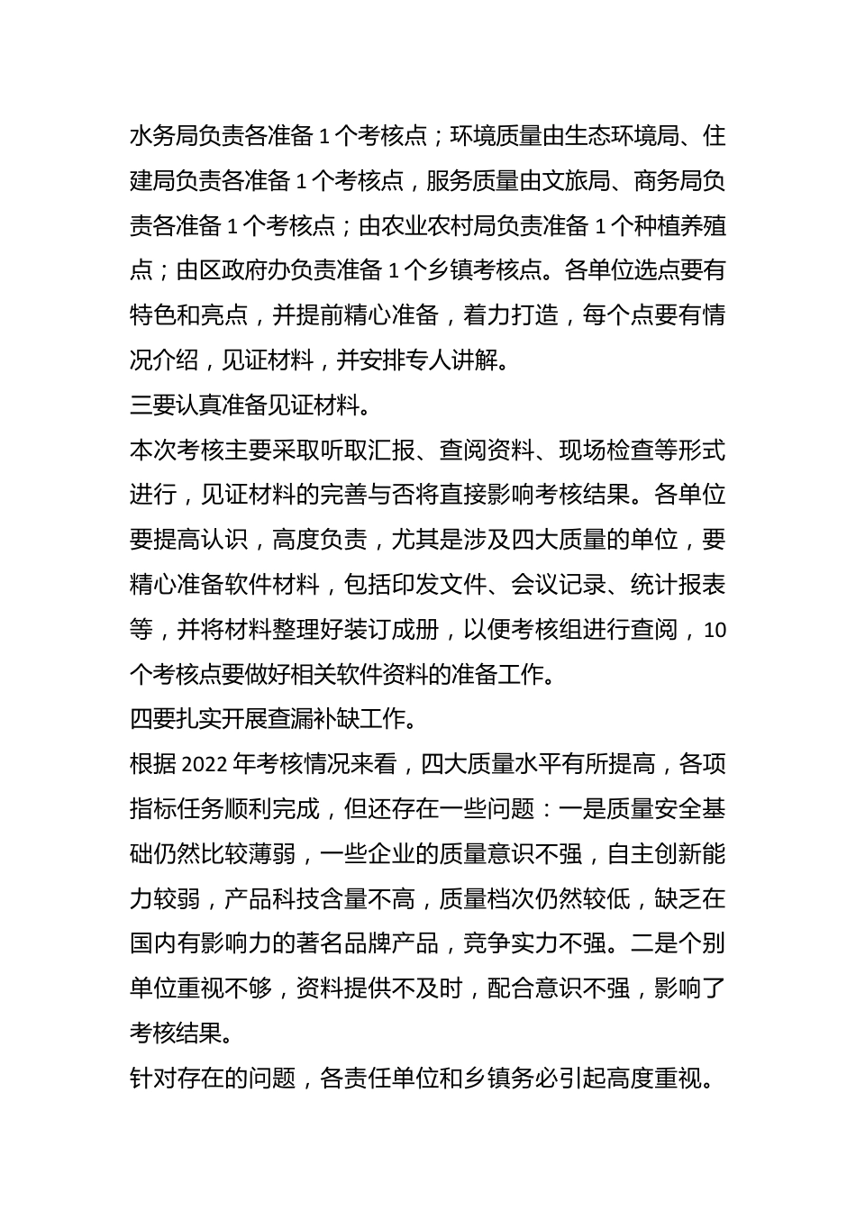 XX干部在全区2023年质量发展工作领导小组会议讲话提纲《X市质量发展领导小组办公室关于做好当前质量发展工作的紧急通知》文件精神,今年考核比去年提前近一个月,考核内容为2022年6月至2023年2月质量发展工作完成情况及今年质量工作安排部署开展情况。为圆满完成2023年质量发展考核工作,各成员单位要高度重视,重点抓好以下四个方面的工作。一要扎实准备汇报材料。各成员单位要对去年下半年至目前质量发展工作进行全面总结,并根据签订的目标责任书对今年质量工作做好扎实安排部署,尤其是涉及四大质量的市场监管局、住建局、交通局、水务局、文旅局、生态环境局、商务局等部门,务必于9月底前将质量发展工作总结纸质版和电子版报送区市场监管局,由市场监管局汇总后形成全区汇报材料。二要精心准备考核点。根据今年全市质量工作考核有关工作通知,X区被确定为2023年质量工作考核县区。按照考核要求,我区要确定10个考核点,即产品、工程、环境和服务质量每项两个点,再确定一个乡镇和一个种植养殖质量考核点。产品质量由市场监管局负责准备2个考核点;工程质量由住建局、交通局和水务局负责各准备1个考核点;环境质量由生态环境局、住建局负责各准备1个考核点,服务质量由文旅局、商务局负责各准备1个考核点;由农业农村局负责准备1个种植养殖点;由区政府办负责准备1个乡镇考核点。各单位选点要有特色和亮点,并提前精心准备,着力打造,每个点要有情况介绍,见证材料,并安排专人讲解。三要认真准备见证材料。本次考核主要采取听取汇报、查阅资料、现场检查等形式进行,见证材料的完善与否将直接影响考核结果。各单位要提高认识,高度负责,尤其是涉及四大质量的单位,要精心准备软件材料,包括印发文件、会议记录、统计报表等,并将材料整理好装订成册,以便考核组进行查阅,10个考核点要做好相关软件资料的准备工作。四要扎实开展查漏补缺工作。根据2022年考核情况来看,四大质量水平有所提高,各项指标任务顺利完成,但还存在一些问题:一是质量安全基础仍然比较薄弱,一些企业的质量意识不强,自主创新能力较弱,产品科技含量不高,质量档次仍然较低,缺乏在国内有影响力的著名品牌产品,竞争实力不强。二是个别单位重视不够,资料提供不及时,配合意识不强,影响了考核结果。针对存在的问题,各责任单位和乡镇务必引起高度重视。一要围绕今年责任指标做好任务分解和落实,对本部门承担的任务层层分解,做到人员到位,措施到位,责任到位,并对去年考核组提出的问题进行整改落实。二要充分利用电视、报刊、微新等媒介,构筑“质量兴区”宣传平台,提高全社会的质量意识。各单位工作开展过程中好的经验和做法在全区表扬并推广,对工作重视不够,开展力度不大,影响我区考核等次的要对单位主要负责人实行问责,通报批评。三要保障产品、工程、服务、环境四大质量工作的经费投入,落实标准化、计量等基础工作经费。