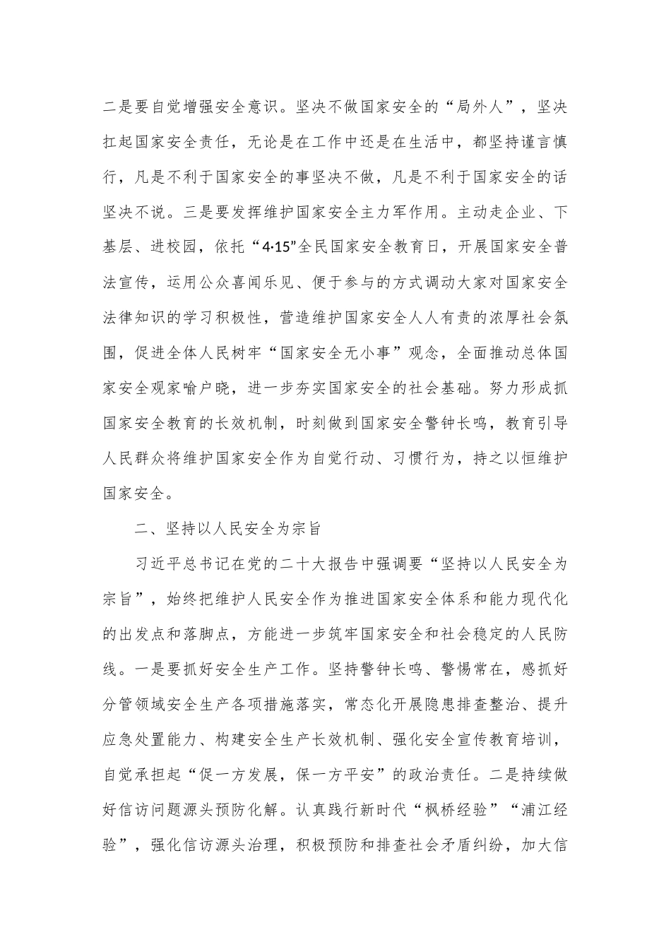 领导班子国家安全观研讨交流发言材料按照中心组安排,近期我认认真真学习了习近平总书记关于总体国家安全观的论述。总体国家安全观是以习近平同志为核心的党中央对国家安全理论和实践的重大创新,是做好新时代国家安全工作的根本遵循,是有效应对外部环境变化和我国改革发展稳定面临的新形势新挑战的行动指南。结合此次集中学习内容和工作实际,下面我简单谈谈我的认识体会。一、坚持以政治安全为根本习近平总书记将总体国家安全观的内涵要求系统概括为“十个坚持”,其中包括“要把政治安全放在首要位置”。党的领导是中国特色社会主义的本质特征,只有坚持党的领导,始终绷紧“国家安全是头等大事”这根弦,坚决服从党对国家安全工作的集中统一领导,国家安全才有主心骨,才能凝聚各方面的力量。作为党员领导干部,我认为,一是要强化理论武装,提升党性修养。通过常委会会议集体学、读书活动深入学、网络平台线上学、理论中心组研讨学的方式,认真组织有关国家安全的法律法规、规章制度理论学习,不断补足精神之“钙”、吸足理论之“氧”,提高政治判断力、政治领悟力、政治执行力。以坚如磐石的理想信念筑牢精神之基、把稳思想之舵,矢志不渝听党话、坚定不移跟党走,坚决维护党和国家安全,以实际行动诠释对党绝对忠诚的政治品质。二是要自觉增强安全意识。坚决不做国家安全的“局外人”,坚决扛起国家安全责任,无论是在工作中还是在生活中,都坚持谨言慎行,凡是不利于国家安全的事坚决不做,凡是不利于国家安全的话坚决不说。三是要发挥维护国家安全主力军作用。主动走企业、下基层、进校园,依托“4·15”全民国家安全教育日,开展国家安全普法宣传,运用公众喜闻乐见、便于参与的方式调动大家对国家安全法律知识的学习积极性,营造维护国家安全人人有责的浓厚社会氛围,促进全体人民树牢“国家安全无小事”观念,全面推动总体国家安全观家喻户晓,进一步夯实国家安全的社会基础。努力形成抓国家安全教育的长效机制,时刻做到国家安全警钟长鸣,教育引导人民群众将维护国家安全作为自觉行动、习惯行为,持之以恒维护国家安全。二、坚持以人民安全为宗旨习近平总书记在党的二十大报告中强调要“坚持以人民安全为宗旨”,始终把维护人民安全作为推进国家安全体系和能力现代化的出发点和落脚点,方能进一步筑牢国家安全和社会稳定的人民防线。一是要抓好安全生产工作。坚持警钟长鸣、警惕常在,感抓好分管领域安全生产各项措施落实,常态化开展隐患排查整治、提升应急处置能力、构建安全生产长效机制、强化安全宣传教育培训,自觉承担起“促一方发展,保一方平安”的政治责任。二是持续做好信访问题源头预防化解。认真践行新时代“枫桥经验”“浦江经验”,强化信访源头治理,积极预防和排查社会矛盾纠纷,加大信访积案化解力度,坚持“三到位一处理”和“五个法治化”工作要求,积极推进***等重点领域矛盾化解工作,主动带头接访下访,找准问题症结,分析原因脉络,研究解决措施,做到问题不累积、矛盾不升级、风险不扩散。三是营造更加安全放心的消费环境。加大食品安全监督检查力度,落实食品安全“两个责任”和食品安全示范城市建没标准;强化特种设备安全监管,开展特种设备隐患排查治理和专项整治,持续开展电梯、压力容器等专项整治行动,落实常态化监管机制;加强药品、医疗器械、化妆品流通使用的安全监管,切实提高问题发现率和处置率;巩固产品质量安全监管。组织开展区域整治,加强协同监管和联合惩戒,着力提升全区质量安全水平。四是深入打好污染防治攻坚战。牢固树立以人民为中心的发展思想,严格按照***关于区域大气环境整治的部署要求,聚焦移动源、扬尘源、社会面源等重点,持续推进大气污染治理,推动**空气质量优良天数进一步增加、重污染天数进一步下降,不断增强人民群众安全感、幸福感、获得感。三、坚持以安全和发展为底线当前,我国发展进入战略机遇和风险挑战并存、不确定难预料因素增多的时期,各种“黑天鹅”、“灰犀牛”事件随时可能发生。以新安全格局保障新发展格局,是党的二十大提出的明确要求、作出的重要部署。是党中央把国家安全贯穿到...