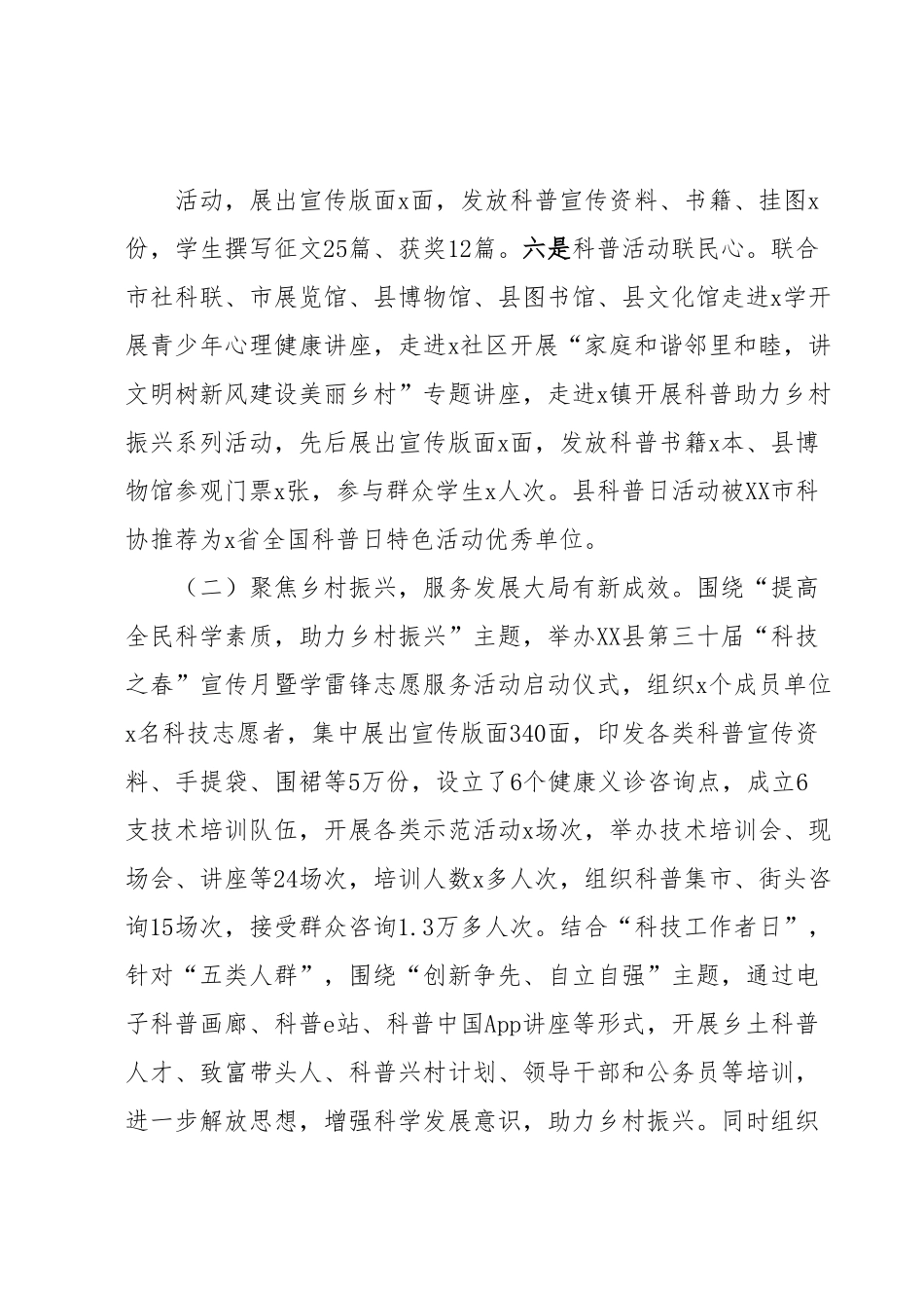 县科协工作汇报今年以来,县科协在县委、县政府的坚强领导下,坚持以习近平新时代中国特色社会主义思想为指导,认真落实县委关于群团工作的部署,紧扣围绕中心、服务大局主线,集聚科学普及主业、强化政治引领主责、实施“五大行动”,切实履行“四服务”工作职责,科协事业发展实现了新飞跃。工作特色及成绩(一)聚焦科学普及,提升科学素质有新突破。围绕“全国科普日”活动主题,开展“喜迎XX大、科普向未来”暨“五进一联”活动。一是科普大篷车进校园。利用科普大篷车,先后走进实验小学、x小学、x小学、x小学,展示教具x件,为x名师生提供零距离动手体验科普展品的机会。二是科普宣传进乡村。结合全县秋播、乡村振兴等内容,组织县农技中心人员深入田间地头开展秋播技术培训,发放科普宣传资料x份,培训农村群众x多人次三是科普宣传进广场。联合县司法局等x个成员单位举办主题宣传活动,设置展台x个、宣传展板x面,发放科技知识手册、农业科普知识书籍x份。四是科普宣传进产业。联合县畜牧工作站举办玉米青贮技术、青贮玉米机械收购、青贮有益菌添加窖贮等专场技术培训,参加培训人数达到x人。五是科普实践进课堂。结合“国旗下讲话”主题教育,融入“科普教育”元素,联合县教体局在全县中小学、幼儿园开展了校园科技课实践活动,展出宣传版面x面,发放科普宣传资料、书籍、挂图x份,学生撰写征文25篇、获奖12篇。六是科普活动联民心。联合市社科联、市展览馆、县博物馆、县图书馆、县文化馆走进x学开展青少年心理健康讲座,走进x社区开展“家庭和谐邻里和睦,讲文明树新风建设美丽乡村”专题讲座,走进x镇开展科普助力乡村振兴系列活动,先后展出宣传版面x面,发放科普书籍x本、县博物馆参观门票x张,参与群众学生x人次。县科普日活动被XX市科协推荐为x省全国科普日特色活动优秀单位。(二)聚焦乡村振兴,服务发展大局有新成效。围绕“提高全民科学素质,助力乡村振兴”主题,举办XX县第三十届“科技之春”宣传月暨学雷锋志愿服务活动启动仪式,组织x个成员单位x名科技志愿者,集中展出宣传版面340面,印发各类科普宣传资料、手提袋、围裙等5万份,设立了6个健康义诊咨询点,成立6支技术培训队伍,开展各类示范活动x场次,举办技术培训会、现场会、讲座等24场次,培训人数x多人次,组织科普集市、街头咨询15场次,接受群众咨询1.3万多人次。结合“科技工作者日”,针对“五类人群”,围绕“创新争先、自立自强”主题,通过电子科普画廊、科普e站、科普中国App讲座等形式,开展乡土科普人才、致富带头人、科普兴村计划、领导干部和公务员等培训,进一步解放思想,增强科学发展意识,助力乡村振兴。同时组织省市县30名科技人员,走进XX县、XX有限公司、XX公司、等,开展奶山羊养殖、生鲜乳收购,蔬菜、苹果栽培,中蜂养殖,核桃园管理田间、电子商务,农产品质量安全,休闲农业、乡村旅游等培训x场次,培训人数3639人。县科协被x省科协评为第三十届“科技之春”宣传月活动先进单位(三)聚焦科普品牌,服务重大决策有新举措。一是实施科普示范创建。围绕创新驱动高质量发展,积极与省、市科协组织联系,考察推荐XX县蜂业科普示范基地、XX县奶山羊优质牧草示范基地、XX县普裕农牧科普示范基地为市级农村科普示范基地;XX县青少年校外活动中心、XX县普裕农牧专业合作社为市级科普教育基地;XX县城关镇新城社区为市级科普示范社区。联合县委组织部、县人社局、团县委向市科协推荐申报第十四届陕西青年科技奖候选人1名。二是开展决策咨询调研。与XX市农村科普大学联合,聘请各类专业技术人才,深入x镇、x村等10个村开展调查研究,上报市科协决策咨询调研课题《XX县奶山羊产业发展现状分析及对策》、《XX县扶贫资产的现状问题及对策分析》等调研报告10篇,中省市科协网站等刊登科协信息32篇。三是加大科普创新发展。投资15万元,完成了XX市农村科普大学XX县分校电子科普画廊。投资5000元建成x广场科普宣传栏1面。投资x万元,在西城社区、东城社区、实验中学、县医院、南道巷中学安装科普e站5个。投资8万元,打造x文化科普馆、x科普馆2处。精心筹备了“中国流动科技馆陕西巡展XX...