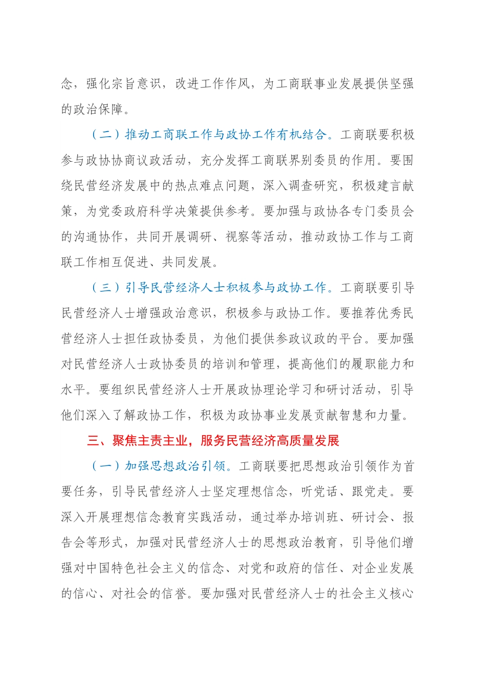 工商联学习2025年全国政协会议精神心得体会2025年全国政协会议的胜利召开,是我国政治生活中的一件大事,对于全面贯彻落实党的XX大和二十届三中全会精神,动员全国各族人民为全面建设社会主义现代化国家、全面推进中华民族伟大复兴而团结奋斗,具有重大而深远的意义。作为工商联的一员,我深入学习了会议精神,结合工商联工作实际,谈几点心得体会。一、提高政治站位,深刻领会会议精神实质(一)深刻认识政协会议的重要意义。全国政协会议是中国政治协商制度的重要实践平台,是各民主党派、无党派人士、人民团体和各界爱国人士参政议政、共商国是的重要舞台。会议围绕党和国家中心工作,聚焦经济社会发展中的重大问题,广泛凝聚共识,积极建言献策,为推动国家治理体系和治理能力现代化发挥了重要作用。工商联作为人民政协的重要界别之一,肩负着团结带领广大民营经济人士听党话、跟党走,为经济社会发展贡献力量的重要使命。我们要深刻认识政协会议的重要意义,切实增强责任感和使命感,以更加饱满的热情和更加扎实的工作,为实现会议确定的目标任务而努力奋斗。(二)准确把握会议精神的核心要义。本次政协会议深入贯彻习近平新时代中国特色社会主义思想,全面落实党的XX大和二十届三中全会精神,对经济社会发展作出了全面部署。会议强调要坚持稳中求进工作总基调,完整、准确、全面贯彻新发展理念,加快构建新发展格局,着力推动高质量发展,更好统筹发展和安全,扎实推进中国式现代化。我们要认真学习、深刻领会会议精神的核心要义,把思想和行动统一到党中央决策部署上来,紧紧围绕中心工作,服务大局,找准工商联工作的切入点和着力点,为促进民营经济高质量发展、推动经济社会持续健康发展贡献力量。(三)增强“四个意识”、坚定“四个自信”、做到“两个维护”。工商联是党领导下的人民团体和商会组织,必须始终坚持党的领导,把政治建设摆在首位。我们要通过学习政协会议精神,进一步增强“四个意识”、坚定“四个自信”、做到“两个维护”,不断提高政治判断力、政治领悟力、政治执行力。要深刻领悟“两个确立”的决定性意义,始终在思想上政治上行动上同以习近平同志为核心的党中央保持高度一致,坚决贯彻党中央决策部署,确保工商联工作始终沿着正确方向前进。二、坚持党建引领,推动工商联工作与政协工作深度融合(一)加强工商联党组织建设。工商联党组织要充分发挥领导核心作用,加强对工商联工作的全面领导。要认真落实党建工作责任制,加强党员教育管理,提高党员素质,增强党组织的凝聚力和战斗力。要深入开展主题教育,引导党员干部坚定理想信念,强化宗旨意识,改进工作作风,为工商联事业发展提供坚强的政治保障。(二)推动工商联工作与政协工作有机结合。工商联要积极参与政协协商议政活动,充分发挥工商联界别委员的作用。要围绕民营经济发展中的热点难点问题,深入调查研究,积极建言献策,为党委政府科学决策提供参考。要加强与政协各专门委员会的沟通协作,共同开展调研、视察等活动,推动政协工作与工商联工作相互促进、共同发展。(三)引导民营经济人士积极参与政协工作。工商联要引导民营经济人士增强政治意识,积极参与政协工作。要推荐优秀民营经济人士担任政协委员,为他们提供参政议政的平台。要加强对民营经济人士政协委员的培训和管理,提高他们的履职能力和水平。要组织民营经济人士开展政协理论学习和研讨活动,引导他们深入了解政协工作,积极为政协事业发展贡献智慧和力量。三、聚焦主责主业,服务民营经济高质量发展(一)加强思想政治引领。工商联要把思想政治引领作为首要任务,引导民营经济人士坚定理想信念,听党话、跟党走。要深入开展理想信念教育实践活动,通过举办培训班、研讨会、报告会等形式,加强对民营经济人士的思想政治教育,引导他们增强对中国特色社会主义的信念、对党和政府的信任、对企业发展的信心、对社会的信誉。要加强对民营经济人士的社会主义核心价值观教育,引导他们树立正确的世界观、人生观、价值观,自觉履行社会责任。(二)助力民营企业科技创新。科技创新是推动民营经济高质量发展的关键。工商联要积...