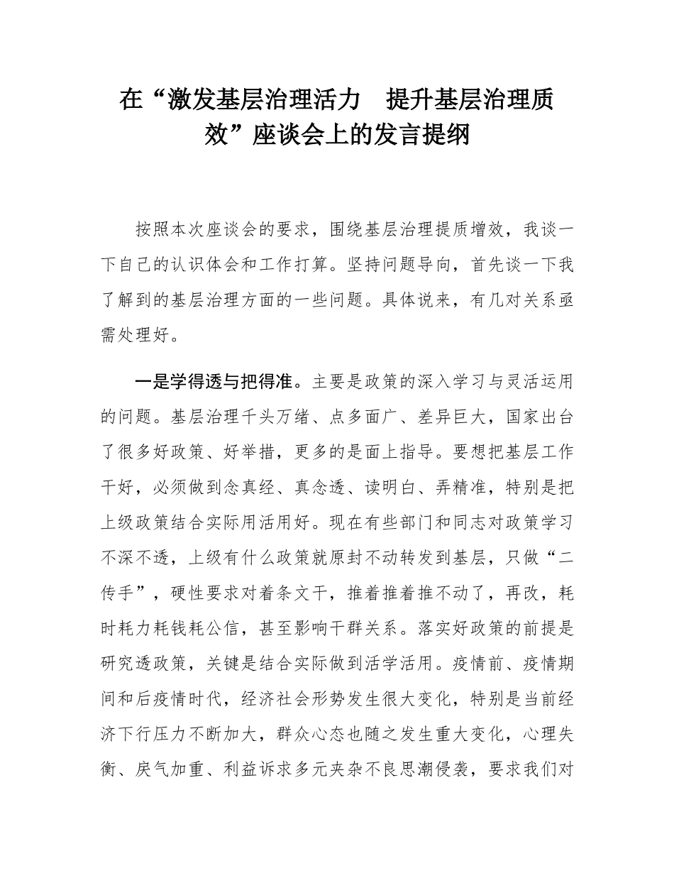 在“激发基层治理活力提升基层治理质效”座谈会上的发言提纲按照本次座谈会的要求,围绕基层治理提质增效,我谈一下自己的认识体会和工作打算。坚持问题导向,首先谈一下我了解到的基层治理方面的一些问题。具体说来,有几对关系亟需处理好。一是学得透与把得准。主要是政策的深入学习与灵活运用的问题。基层治理千头万绪、点多面广、差异巨大,国家出台了很多好政策、好举措,更多的是面上指导。要想把基层工作干好,必须做到念真经、真念透、读明白、弄精准,特别是把上级政策结合实际用活用好。现在有些部门和同志对政策学习不深不透,上级有什么政策就原封不动转发到基层,只做“二传手”,硬性要求对着条文干,推着推着推不动了,再改,耗时耗力耗钱耗公信,甚至影响干群关系。落实好政策的前提是研究透政策,关键是结合实际做到活学活用。疫情前、疫情期间和后疫情时代,经济社会形势发生很大变化,特别是当前经济下行压力不断加大,群众心态也随之发生重大变化,心理失衡、戾气加重、利益诉求多元夹杂不良思潮侵袭,要求我们对基层治理一定要与时俱进,自觉地把基层治理放到经济社会发展的大的社会背景中来看,研究透国家的政策、群众的心态、落实的细致措施,真正把工作做到群众心坎上,争取群众理解和满意。有些同志思想上跟进不够及时,方式方法相对传统落后,是一种被动学习被动思考被动工作的状态。二是做的对与做的好。大家都在认真做,为什么结果不好?前段时间,河南省漯河市郾城区法院一年轻女法官被杀案件,让我深刻思考“做的对与做的好”之间的距离。在基层工作中,不少同志都反映自己经常加班、觉得自己工作很努力,工作的出发点是为了群众好,各项工作也都按照上级要求和条文规定去做,表报了、报告写了,到最后做了很多,反而群众不买账、不满意,都是做对的事情,却没有好的效果。这说明,我们工作中,还没有把握好“做的对和做的好”的关系,没有很好地把上级要求的好、群众需要的好放到一起来考量,二者出现了脱节。再比如,近年来,尽管组织部门加大了对村支部书记队伍的管理教育,但是每年仍有支部书记被处分,仔细分析起来,有的犯的错误很低级,但是前任支部书记纪委刚处分完,后任马上又因为同样原因被处分。同区纪委同志谈话了解到,这几年来,针对村支部书记这支队伍,基本上没有开展过专项廉洁教育,特别是以案说法、案例剖析,引导村支部书记交流剖析,这项工作始终没有开展过,不少村支部书记对法纪了解不深,觉得违规违纪离自己较远,甚至违规违纪了尚不自知。三是下得去与沉进去。这些年来,我们向基层倾斜了很多力量,很多年轻同志通过招考进入到基层机关,参与到基层治理中来。不少是从学校直接到机关到基层,缺少基层经历,还有的是从省市县机关选派到基层。总体上看,大家在基层的时间、投入、历练距离做一名优秀的基层干部还有较大差距。有些在乡镇工作的同志,张口闭口“下村”,很年轻的同志却有很强的官僚气息。身在基层并不意味着心就在基层了,有的同志只是坐到基层的办公室通过看手机、看电脑弄材料、搞创新,没有真正沉进去,或者是身到心不到,这样就不可能了解真实情况,也绝不会精准研判形势,拿不出务实举措。再优美生动的文字抵不过与群众坐到一条板凳上唠嗑拉呱的交心。年轻同志害怕基层、逃避基层、应付基层的问题需要进一步加大力度解决。四是专项精与全局好。基层治理是一项综合性系统工程,涉及发展、稳定、环保、信访等各项工作,很多工作交织叠加。单纯去抓一条线,其他线上的工作都不管不问,即便是专项的条条很精,也不一定实现全局都好。我们搞环境卫生、洒水降尘,如果在接送学生的高峰时期来进行,工作干的再好,学生会骂,市民也不满意。我们单独解决一个利益群体的诉求,可能会连带引发其他群体的诉求,工作可能更加被动。推动基层治理提升过程中,各个部门既要实现单个部门的业务提升,更要牢固树立全局意识和大局意识,左右兼顾、齐头并进,决不能干按下葫芦浮起瓢的事情。五是压担子与真爱护。现在基层的工作难干,不压担子工作推不开,光压担子也不行,还得真心关爱基层干部,特别是很多岗位缺少专业人才...