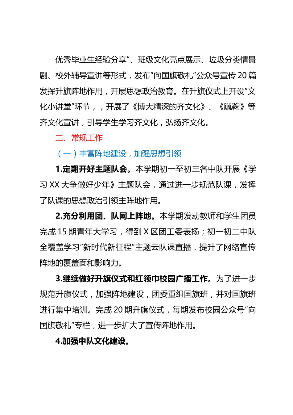 XX中学2022--2023学年第二学期共青团、少先队工作总结本学期学校共青团、少先队深入学习党的XX大精神,深入贯彻落实习近平总书记关于少先队和共青团工作的重要论述,聚焦主责主业,扎实开展各项活动,现总结如下:一、亮点工作(一)校外辅导员积极参与少先队活动完善了校外辅导员队伍,建立校外辅导员联系群,校外辅导员积极参与学校少先队工作研讨。本学期,校外辅导员XXX警官、XXX律师、XXX律师分别到校进行宣讲。校外辅导员XXX老师积极参与学校心理健康月活动策划及开展。校外辅导员队伍的建立,充分利用了校外资源,凝聚了校内外育人合力。(二)招募了红领巾讲解员,组建志愿者队伍通过自愿申请、班级推荐、团委审核,确定了8名红领巾讲解员,组成红领巾讲解员志愿团队。团委对志愿讲解员进行培训,并录制了《红领巾讲解之团队文化》:《红领巾》《少先队队礼》等,通过公众号发布,普及团队文化,提高团员、队员的团队文化认同感。(三)不断创新升旗仪式,加强阵地建设本学期升旗仪式不断丰富内容,创新形式。通过“优秀毕业生经验分享”、班级文化亮点展示、垃圾分类情景剧、校外辅导宣讲等形式,发布“向国旗敬礼”公众号宣传20篇发挥升旗阵地作用,开展思想政治教育。在升旗仪式上开设“文化小讲堂”环节,,开展了《博大精深的齐文化》、《蹴鞠》等齐文化宣讲,引导学生学习齐文化,弘扬齐文化。二、常规工作(一)丰富阵地建设,加强思想引领1.定期开好主题队会。本学期初一至初三各中队开展《学习XX大争做好少年》主题队会,通过进一步规范队课,发挥了队课的思想政治引领主阵地作用。2.充分利用团、队网上阵地。本学期发动教师和学生团员完成15期青年大学习,得到X区团工委表扬;初一初二中队全覆盖学习“新时代新征程”主题云队课直播,提升了网络宣传阵地的覆盖面和影响力。3.继续做好升旗仪式和红领巾校园广播工作。为了进一步规范升旗仪式,加强阵地建设,团委重组国旗班,并对国旗班进行集中培训。完成20期升旗仪式,每期发布校园公众号“向国旗敬礼”专栏,进一步扩大了宣传阵地作用。4.加强中队文化建设。为推进各中队文化建设,展现中队特色文化,团委联合级部开展中队文化评选,并择优在升旗仪式上展示。各中队群策群力设计队名、队徽河口号等,凝聚了中队力量。5.积极宣传团队工作。除“向国旗敬礼”专栏外,本学期团委在AAA公众号发布宣传稿10篇,扩大了我校团队工作积极影响。(二)开展各种活动,丰富团队生活1.传统节日、节庆日活动。利用清明、端午等传统节日契机,开展“清明祭英烈”“粽叶飘香浓情端午”等活动,引领队员传承红色基因,弘扬传统文化。2.少代会。为发挥队员的主人精神,提高队员的自主管理能力,团委组织召开第六次少代会,对征集的313份提案进行汇总、答复,并成立提案答复督导小组,切实发挥提案作用。3.积极参加上级组织的活动。积极参加上级组织的活动,认真准备,取得优异成绩。如XXX在X市“砥砺奋进守初心,青春献礼XX大”演讲比赛获一等奖,XXX获“X市优秀指导教师”;我校代表X区参加X市第五届中学生辩论赛XX赛区选拔赛,并获得一等奖的好成绩,XXX获得“优秀辩手”;参加“学习XX大,奋进新征程”X市故事大王比赛决赛,XXX获X区一等奖,准备参加事迹决赛,XXX获“X区优秀指导教师”。(三)开展志愿服务,发扬志愿精神1.开展“学雷锋志愿活动”。利用“学雷锋志愿活动月”契机,常态化学雷锋活动。期间,组织《弘扬雷锋精神,争做美德少年》主题队会、《雷锋的微笑》观影学习活动、到全纳幼儿园开展学雷锋送教活动等,引导学生理解雷锋精神时代内涵,掀起学雷锋的热潮。2.开展“植树护绿寄希望,生态文明齐共创”志愿服务活动。组织初一级部师生到XX社区开展植树护绿活动,聆听少工委主任XX的林业英雄事迹宣讲,开展植树护绿实践,增强了队员们热爱自然,保护环境意识。3.开展“情暖端午牵手关爱”志愿服务。团委组织16名帮扶教师对挂包的8名贫困学生、特殊关注学生开展“牵手关爱”志愿服物,通过送学习用品、心理辅导、学习辅导等形式,让学生感受到老师的爱。(四)加强团校建设,做好团员思想政治引领1.进一步加强...