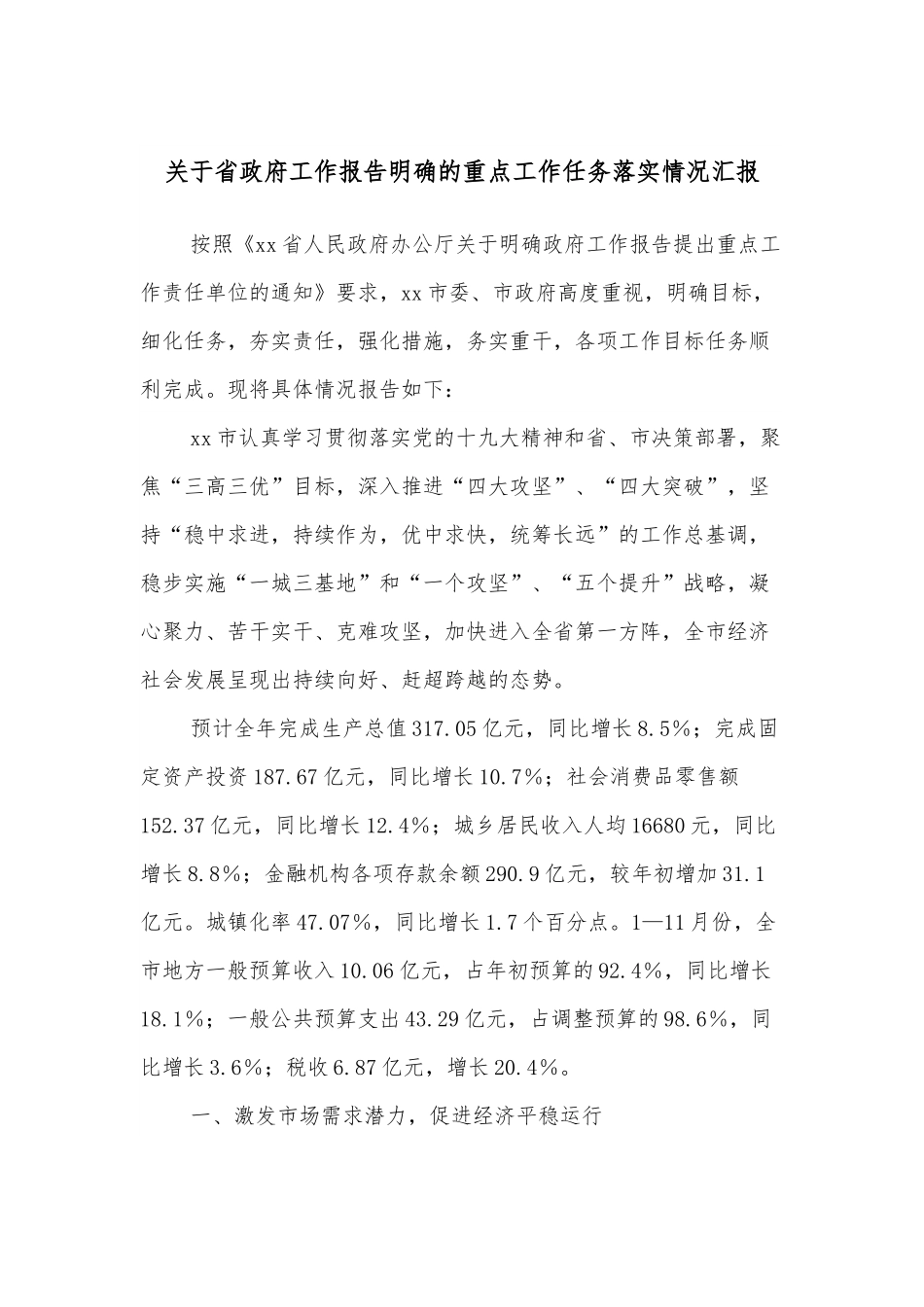 关于省政府工作报告明确的重点工作任务落实情况汇报按照《xx省人民政府办公厅关于明确政府工作报告提出重点工作责任单位的通知》要求,xx市委、市政府高度重视,明确目标,细化任务,夯实责任,强化措施,务实重干,各项工作目标任务顺利完成。现将具体情况报告如下:xx市认真学习贯彻落实党的十九大精神和省、市决策部署,聚焦“三高三优”目标,深入推进“四大攻坚”、“四大突破”,坚持“稳中求进,持续作为,优中求快,统筹长远”的工作总基调,稳步实施“一城三基地”和“一个攻坚”、“五个提升”战略,凝心聚力、苦干实干、克难攻坚,加快进入全省第一方阵,全市经济社会发展呈现出持续向好、赶超跨越的态势。预计全年完成生产总值317.05亿元,同比增长8.5%;完成固定资产投资187.67亿元,同比增长10.7%;社会消费品零售额152.37亿元,同比增长12.4%;城乡居民收入人均16680元,同比增长8.8%;金融机构各项存款余额290.9亿元,较年初增加31.1亿元。城镇化率47.07%,同比增长1.7个百分点。1—11月份,全市地方一般预算收入10.06亿元,占年初预算的92.4%,同比增长18.1%;一般公共预算支出43.29亿元,占调整预算的98.6%,同比增长3.6%;税收6.87亿元,增长20.4%。一、激发市场需求潜力,促进经济平稳运行1.推动消费加快升级。完成情况:我市全年预计社会消费品零售额152.37亿元,同比增长12.4%。我市认真落实相关政策,积极培育消费热点,推动消费升级,促进消费更快增长。加快特色商业区的建设,使其成为以家居、建材、服装等专业市场群为主题,集商贸批发零售、配套商务服务、品质性休闲娱乐等于一体,彰显xx特色的豫东南区域性商贸服务中心。特色商业区集群效应初步显现。欧蓓莎国际商城入驻商户1000多家,带动和促进了现代商贸业、物流业发展;投资8.6亿元的天湖国际综合体项目已经建成,初步形成了以金博大、索普瑞五星酒店等名企集聚的商业中心。止目前,商业区入库企业28家,累计完成营业收入14亿元,从业人员3890人,实际完成税收5800万元。同时,加大投入进一步建设改造城乡农贸市场和综合性市场,加大管理力度,全面实施标准化、规范化管理,促进市场健康有序发展。培育发展旅游业。重点围绕提升城市品位,打造精品旅游品牌。引入民间资本,提升利用效率。稳步推进袁寨古民居建设,完善旅游配套设施,围绕袁世凯及其家族人物开发文化产品,集中连片打造“袁氏文化”旅游品牌。大力推进居民服务体系建设,重点发展家政服务、社区服务、养老服务和病患陪护、家庭用品配送、家庭教育等家庭服务业;鼓励各种资本投资创办居民服务企业,推进公益性信息服务平台建设,实施社区服务体系建设工程,统筹社区内居民服务业发展。2.扩大社会有效投资。完成情况:我市完成固定资产投资187.67亿元,同比增长10.7%。项目谋划力度大。主动与央企沟通对接,寻找发展契合点,谋划项目合作。经省发改委认定,我市共与央企对接合作项目3个,总投资16.2亿元,均具备签约条件。围绕食品、医药、纺织、服装、皮革及健康食品、现代物流、高效种养、健康养老等产业,积极完善转型发展攻坚项目库。截至目前,入库项目22个,计划总投资48.9亿元,其中,属于省定重点攻坚产业项目10个。争取资金成效好。全年共争取各类项目18个,争取上级资金2.28亿元,其中中央投资1.93亿元,省补资金3519万元。实现了“制度+技术”的有效监管,确保了国家资金管好、用好,真正发挥效益。项目建设推进快。列入省重点项目4个,总投资38.15亿元。计划投资13亿元,已完成投资14.7亿元,占年度计划113.07%;列入xx市重点项目26个,总投资139.34亿元,计划投资61.99亿元,已完成投资72.73亿元,占年度计划117.32%。一是在公共服务、资源环境、基础设施和新兴产业等领域,认真谋划实施了一批交通、能源、水利、生态、城市基础设施等重大项目。二是加强项目储备和推介力度,吸引民间资本参与投资和运营。三是组织开展金融专项服务活动。在全市范围内组织开展金融服务专项活动,通过宣传政策,着力解决抽贷、断贷、压贷、倒贷、惜贷等突出问题,切实保障对中小微企业倾斜的各项政策落到实处。3.拓展对外...