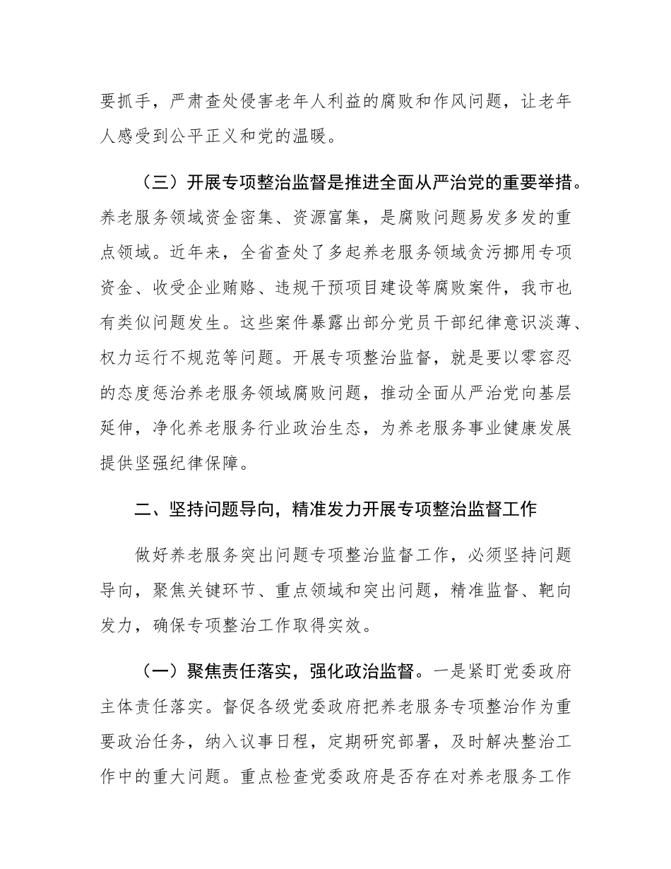 在全市养老服务突出问题专项整治工作推进会上的讲话同志们:养老服务领域的突出问题,关乎民生福祉,更关乎党和政府的形象与公信力。开展养老服务突出问题专项整治,是贯彻落实党中央、国务院关于积极应对人口老龄化战略部署的重要举措,也是推动全面从严治党向基层延伸、维护群众切身利益的必然要求。作为党内监督和国家监察专责机关,全市纪检监察系统必须提高政治站位,主动担当作为,以强有力的监督执纪问责,为专项整治工作提供坚强纪律保障。下面,我围绕监督保障专项整治工作讲三点意见。一、提高政治站位,深刻认识专项整治监督工作的极端重要性养老服务是重大民生工程,是检验各级党组织践行“两个维护”、落实以人民为中心发展思想的重要标尺。当前,我市人口老龄化程度持续加深,老年人口已达万人,占总人口的%,养老服务供需矛盾日益突出,各类问题交织叠加。纪检监察机关必须从政治高度出发,深刻认识专项整治监督工作的重要意义。(一)开展专项整治监督是践行“两个维护”的具体行动。党中央、国务院高度重视养老服务工作,总书记多次就加强养老服务体系建设、维护老年人合法权益作出重要指示批示。省委、市委也将养老服务专项整治列为重点工作。全市纪检监察机关要把专项整治监督作为践行“两个维护”的具体实践,紧盯各级党组织和党员干部贯彻落实党中央决策部署情况,督促职能部门履职尽责,确保党中央关于养老服务的各项政策措施在我市落地生根,坚决杜绝在养老服务工作中搞变通、打折扣、做选择等问题。(二)开展专项整治监督是维护群众利益的必然要求。从前期调研和群众反映情况来看,我市养老服务领域存在诸多突出问题。部分养老机构违规收费、服务质量不达标,甚至存在欺老虐老现象;一些社区养老服务设施建设滞后,资金使用不规范;个别职能部门对养老服务监管不力,推诿扯皮、不作为、慢作为问题时有发生。这些问题严重损害了老年人的切身利益,群众对此反映强烈。纪检监察机关作为群众利益的捍卫者,必须把监督保障专项整治作为回应群众关切、维护群众利益的重要抓手,严肃查处侵害老年人利益的腐败和作风问题,让老年人感受到公平正义和党的温暖。(三)开展专项整治监督是推进全面从严治党的重要举措。养老服务领域资金密集、资源富集,是腐败问题易发多发的重点领域。近年来,全省查处了多起养老服务领域贪污挪用专项资金、收受企业贿赂、违规干预项目建设等腐败案件,我市也有类似问题发生。这些案件暴露出部分党员干部纪律意识淡薄、权力运行不规范等问题。开展专项整治监督,就是要以零容忍的态度惩治养老服务领域腐败问题,推动全面从严治党向基层延伸,净化养老服务行业政治生态,为养老服务事业健康发展提供坚强纪律保障。二、坚持问题导向,精准发力开展专项整治监督工作做好养老服务突出问题专项整治监督工作,必须坚持问题导向,聚焦关键环节、重点领域和突出问题,精准监督、靶向发力,确保专项整治工作取得实效。(一)聚焦责任落实,强化政治监督。一是紧盯党委政府主体责任落实。督促各级党委政府把养老服务专项整治作为重要政治任务,纳入议事日程,定期研究部署,及时解决整治工作中的重大问题。重点检查党委政府是否存在对养老服务工作重视不够、部署不力、推进缓慢等问题,对责任落实不到位的,严肃追责问责。二是紧盯职能部门监管责任落实。民政、财政、住建、市场监管等职能部门在养老服务工作中承担着重要监管职责。要督促各职能部门认真履行职责,加强对养老机构审批、运营、服务等环节的监管,加大对社区养老服务设施建设、资金使用的监督力度。对监管不力、失职渎职导致问题频发的,严肃追究相关人员责任。三是紧盯党员干部直接责任落实。重点监督养老服务领域党员干部是否存在不作为、慢作为、乱作为等问题,是否在项目审批、资金分配、招标采购等工作中以权谋私、收受贿赂。对发现的问题,要快查快处,绝不姑息迁就。(二)聚焦重点领域,强化专项监督。一是加强对养老服务资金使用的监督。养老服务资金是老年人的“养老钱”“救命钱”,必须确保安全规范使用。要联合财政、审计等部门,对养老服务专项资金的申请、分配、...