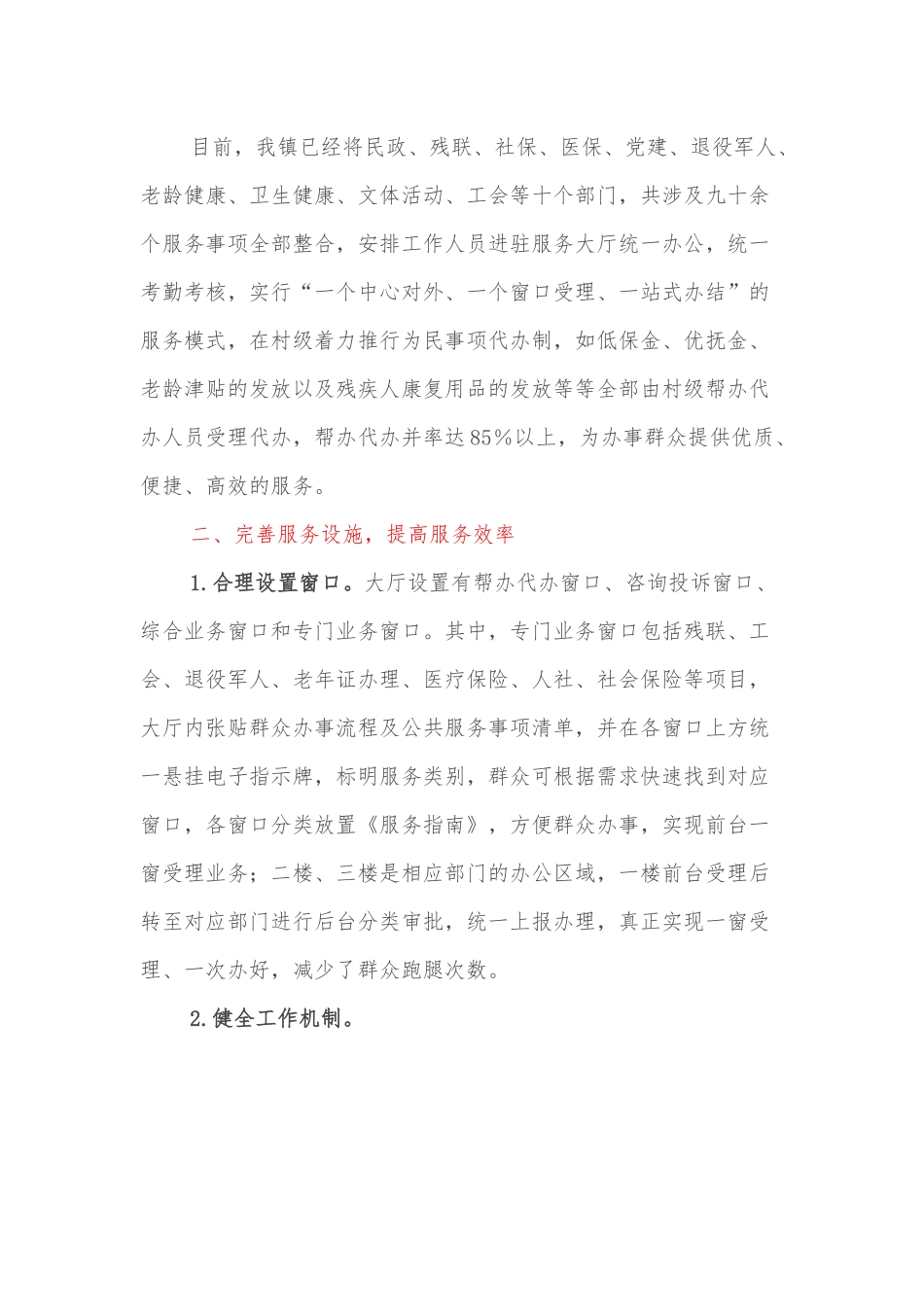 XX镇便民服务工作情况汇报在市政务服务中心的指导下,坚持“便民、规范、廉洁、高效”的服务宗旨,以提升人民群众满意度为出发点和落脚点,不断创新服务方式,持续加强窗口管理制度建设,认真开展各项工作目标和任务,着力打造便民廉洁高效的政务服务新环境。现将相关工作情况汇报如下:一、建设便民服务中心,优化便民服务流程XX镇原便民服务中心位于镇政府对面路北,办公面积XX平米,因空间不足,仅入驻了人社、卫生健康、退役军人、信访等服务事项,民政、残联、党建、文明实践等部分服务事项仍处于分散办公状态,无法满足“一窗受理”“一次办结”的要求。为深入推进“放管服”改革,持续优化营商环境,进一步提升政务服务效能和服务水平,我镇按照“红垒十标”“六有一能”要求,对照《XX市党群服务中心(便民服务中心)标准化建设手册》及《镇街政务服务规范化建设工作标准》,研究制定了《XX镇党群服务中心建设布局规划和方案》,从机构设置、职责范围、进驻单位、主要任务、方法步骤、制度建设等方面进行了细化部署,按照简便实用,美观大方的建设要求进行装修,投资XX万元建成新的便民服务中心,总面积XX平方米,办事大厅XX余平米,同一配备了办公用品和服务设施。目前,我镇已经将民政、残联、社保、医保、党建、退役军人、老龄健康、卫生健康、文体活动、工会等十个部门,共涉及九十余个服务事项全部整合,安排工作人员进驻服务大厅统一办公,统一考勤考核,实行“一个中心对外、一个窗口受理、一站式办结”的服务模式,在村级着力推行为民事项代办制,如低保金、优抚金、老龄津贴的发放以及残疾人康复用品的发放等等全部由村级帮办代办人员受理代办,帮办代办并率达85%以上,为办事群众提供优质、便捷、高效的服务。二、完善服务设施,提高服务效率1.合理设置窗口。大厅设置有帮办代办窗口、咨询投诉窗口、综合业务窗口和专门业务窗口。其中,专门业务窗口包括残联、工会、退役军人、老年证办理、医疗保险、人社、社会保险等项目,大厅内张贴群众办事流程及公共服务事项清单,并在各窗口上方统一悬挂电子指示牌,标明服务类别,群众可根据需求快速找到对应窗口,各窗口分类放置《服务指南》,方便群众办事,实现前台一窗受理业务;二楼、三楼是相应部门的办公区域,一楼前台受理后转至对应部门进行后台分类审批,统一上报办理,真正实现一窗受理、一次办好,减少了群众跑腿次数。2.健全工作机制。本着“进一扇门、一次办好”的原则,所有进驻大厅的部门,对窗口首席代表进行充分授权,签订《授权责任书》,并建立审批服务台账、代办服务台账、印章使用台账等档案资料,确保服务环节到人、责任卡实到位。建立完善了《首接负责制》《服务承诺制》《限时办结制》《一次性告知制度》《投诉举报制度》和《责任追究制》等6项制度措施,全部张贴上墙,并公开投诉举报电话,畅通群众咨询和反映意见的渠道和途径,及时制止和纠正服务工作中存在的问题和不足。3.提高办事效率。便民服务大厅设置《工作人员去向图》,实行A、B岗工作制度,即岗位工作人员临时外出时,其他人员能够及时补上,保证各项业务办理不断档。为适应一岗多职的要求,我们在安排窗口服务人员时进行严格把关,选调业务素质高、工作能力强的服务人员进入中心,每人至少熟练掌握两种以上业务办理能力,解决以往群众定时办、分散办、来回办的苦恼。同时,协调联通公司,推行审批服务事项“网上办”,与群众生产生活密切相关的事项,纳入政务服务平台办理,全程在线办理,提高网上办理比例,实现审批服务“一张网”、企业群众办事“一网通”。另外,在大厅入口右手边放置两台人力资源查询一体机,方便群众查询养老保险缴纳领取信息及就业信息。三、注重细节打造,提升服务水平便民服务中心工作的主导思想是“为民办实事”。为彰显政府便民、利民、亲民的思想,在细节方面,着力营造人性化管理氛围。一是设置了休息场所。服务中心安放了长椅,配备了洗手间,在政务公开体验区准备了各类服务指南、政策法规以及《一封信》,方便群众更好地了解办事流程,缓解群众在等待过程中的焦急心理。二是强化文明接待。要求所...