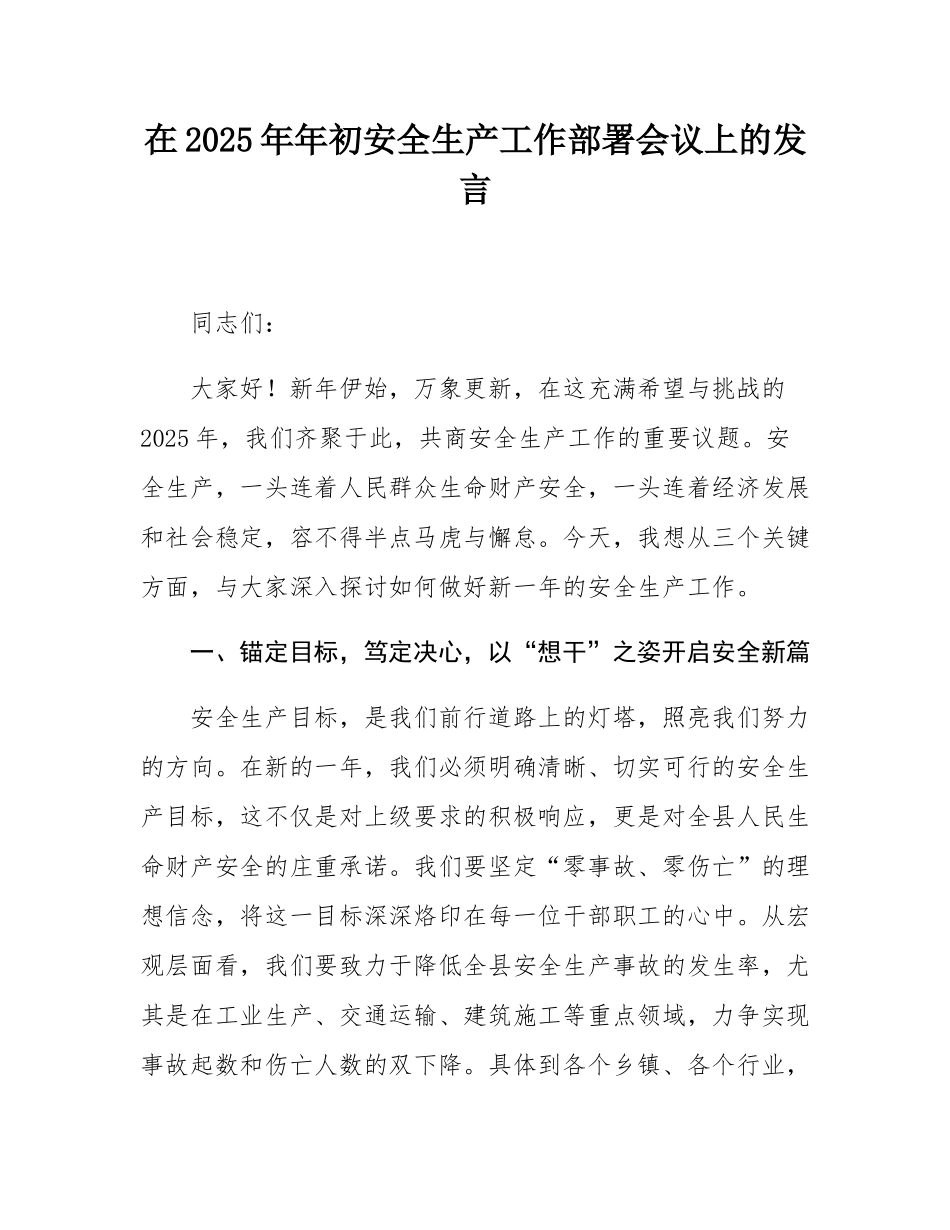 在2025年年初安全生产工作部署会议上的发言同志们:大家好!新年伊始,万象更新,在这充满希望与挑战的2025年,我们齐聚于此,共商安全生产工作的重要议题。安全生产,一头连着人民群众生命财产安全,一头连着经济发展和社会稳定,容不得半点马虎与懈怠。今天,我想从三个关键方面,与大家深入探讨如何做好新一年的安全生产工作。一、锚定目标,笃定决心,以“想干”之姿开启安全新篇安全生产目标,是我们前行道路上的灯塔,照亮我们努力的方向。在新的一年,我们必须明确清晰、切实可行的安全生产目标,这不仅是对上级要求的积极响应,更是对全县人民生命财产安全的庄重承诺。我们要坚定“零事故、零伤亡”的理想信念,将这一目标深深烙印在每一位干部职工的心中。从宏观层面看,我们要致力于降低全县安全生产事故的发生率,尤其是在工业生产、交通运输、建筑施工等重点领域,力争实现事故起数和伤亡人数的双下降。具体到各个乡镇、各个行业,目标要进一步细化、量化。比如,**镇要确保辖区内的矿山企业安全事故发生率同比降低*%;交通运输部门要将道路交通事故的死亡人数控制在*人以内。这些目标看似艰巨,但只要我们有坚定的决心,就没有克服不了的困难。有了目标,更要有实现目标的强烈愿望。我们要从内心深处认识到安全生产工作的重要性,将其视为自己的使命与责任。每一位领导干部,都要把安全生产工作放在心上、抓在手上,不能有丝毫的敷衍与推诿。我们要以“想干”的积极态度,主动谋划工作,积极寻求解决问题的办法。只有当我们真正从思想上重视起来,才能在行动上全力以赴,为实现安全生产目标奠定坚实的基础。二、精研业务,提升本领,凭“会干”之能筑牢安全防线安全生产工作专业性强、技术要求高,没有过硬的业务能力,很难应对复杂多变的安全形势。在新的一年,我们必须加强学习,提升全体干部职工的安全生产业务能力,让每一个人都成为安全生产的行家里手。一方面,要加强对安全生产法律法规和政策文件的学习。安全生产法、消防法等相关法律法规,是我们开展工作的基本遵循。我们要组织干部职工深入学习,确保每一位工作人员都能熟练掌握法律法规的要点,在工作中做到依法依规办事。同时,对于中央、省、市出台的最新安全生产政策文件,要及时传达学习,深刻领会政策精神,将其贯彻落实到实际工作中。另一方面,要加强对安全生产专业知识的学习。不同行业、不同领域的安全生产工作有着不同的特点和要求。我们要根据工作实际,有针对性地开展专业知识培训。例如,对于从事危险化学品监管的工作人员,要重点培训危险化学品的储存、运输、使用等方面的安全知识;对于建筑施工领域的监管人员,要加强对建筑施工安全规范、施工工艺等方面的学习。通过邀请专家授课、组织实地参观学习、开展案例分析等多种形式,不断丰富干部职工的专业知识储备,提升他们的业务水平。此外,还要注重在实践中学习和积累经验。安全生产工作千头万绪,实际工作中会遇到各种各样的问题。我们要鼓励干部职工在工作中多思考、多总结,不断探索适合本地、本行业的安全生产工作方法。同时,要建立健全经验交流机制,定期组织不同部门、不同乡镇之间的安全生产工作经验交流活动,让大家相互学习、相互借鉴,共同提高业务能力。只有具备了“会干”的能力,我们才能在安全生产工作中做到游刃有余,真正筑牢安全防线。三、勇挑重担,积极作为,以“敢干”之勇破解安全难题安全生产工作往往涉及到诸多利益关系,面临着各种各样的困难和挑战。在新的一年,我们必须勇于担当,积极主动,以“敢干”的勇气和魄力,破解安全生产工作中的难题。在面对一些历史遗留的安全隐患问题时,我们不能畏首畏尾、退缩不前。比如,一些老旧小区存在消防设施不完善、疏散通道不畅等问题,这些问题由来已久,解决起来难度较大。但是,我们不能因为困难大就回避,而要主动担当起责任。相关部门要积极协调各方力量,制定切实可行的整改方案,加大资金投入,逐步推进问题的解决。在这个过程中,可能会遇到居民不理解、不配合的情况,我们的干部要耐心做好解释工作,争取群众的支持。只要我们敢于迎难而上,就没有解决不了的...