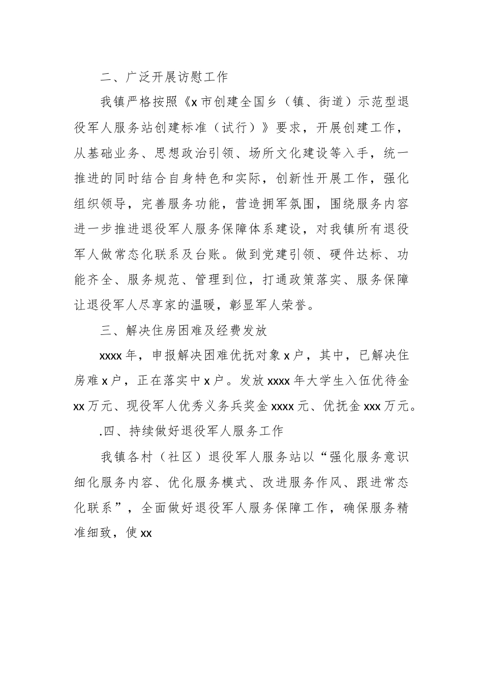 关于退役军人示范型服务站建设汇报材料(4篇)篇1:根据《x市xx区人民政府办公室关于加强xxxx年度全国示范型退役军人事务站建设和验收工作的通知》要求,我镇高度重视,积极行动,多措并举扎实推进全国示范型退役军人服务站创建工作。现将创建全国示范型退役军人服务站情况总结如下:一、思想政治建设及光荣牌悬挂自退役军人服务站成立以来,我镇边建设、边运行、边探索、边规范,积极加快推进机构组建,切实强化使命担当,充分发挥我镇、村(社区)两级退役军人服务站统筹协调作用,确保各项工作落到落实。做到机构挂牌与实地运转同步推进、规划建设与规范服务无缝对接,积极对辖区的退役军人及其他优抚对象的信息进行采集,共采集信息xxx人,xxxx年新挂光荣牌xx块,退役军人归属感、荣誉感、幸福感、获得感不断增强,服务站的作用发挥初见成效。组织机关职工参加“致敬·xxxx清明祭英烈”,组织了机关、镇辖单位职工参加“xxxx年烈士纪念日”,活动引导职工珍惜生活、热爱祖国,增强国防观念。为参加抗美援朝老兵发送“中国人民志愿军抗美援朝出国作战xx周年纪念章”x枚。二、广泛开展访慰工作我镇严格按照《x市创建全国乡(镇、街道)示范型退役军人服务站创建标准(试行)》要求,开展创建工作,从基础业务、思想政治引领、场所文化建设等入手,统一推进的同时结合自身特色和实际,创新性开展工作,强化组织领导,完善服务功能,营造拥军氛围,围绕服务内容进一步推进退役军人服务保障体系建设,对我镇所有退役军人做常态化联系及台账。做到党建引领、硬件达标、功能齐全、服务规范、管理到位,打通政策落实、服务保障让退役军人尽享家的温暖,彰显军人荣誉。三、解决住房困难及经费发放xxxx年,申报解决困难优抚对象x户,其中,已解决住房难x户,正在落实中x户。发放xxxx年大学生入伍优待金xx万元、现役军人优秀义务兵奖金xxxx元、优抚金xxx万元。.四、持续做好退役军人服务工作我镇各村(社区)退役军人服务站以“强化服务意识细化服务内容、优化服务模式、改进服务作风、跟进常态化联系”,全面做好退役军人服务保障工作,确保服务精准细致,使xx镇退役军人服务站成为“退役军人之家”,让每一位退役军人感受到党和政府的关怀和温暖。公示我镇退役军人服务站姓名、联系方式等,做到有来访,有接访,有解决。协助区事务局完成好退役军人专场招聘会和退役军人第一课培训会等工作。示范型退役军人服务站建设汇报材料二篇东丽区创建全国示范型退役军人服务中心(站)工作推动会暨培训会在区退役军人服务中心召开,进一步提高业务素质,增强服务能力,提升工作水平,推动全国示范型退役军人服务中心(站)工作全面落实。会议开展全国示范型退役军人服务中心(站)创建内容(各街道落实工作情况)、部署《全市退役军人服务保障业务技能活动》、信息采集和悬挂光荣牌工作、信访稳定工作及业务培训等内容。为确保全国示范型退役军人服务中心(站)创建工作按照时间节点高质量完成,区退役军人服务中心针对此项工作建立了服务中心、街道包联工作机制,由区退役军人服务中心工作人员分组联络各街道服务站,跟踪了解、动态掌握各街道示范型服务站创建工作的开展情况,及时传达上级精神;定期开展推动会,通报各街道的进展情况,总结经验做法和存在的问题,集中研讨推进工作开展。自创建工作开展以来,区退役军人服务中心认真按照上级要求及“枫桥经验”精神,切实落实创建“全国示范型退役军人服务中心(站)”工作,加快推进退役军人服务保障体系建设的具体内容,从硬件设施配置到人员定岗从文化氛围宣传到功能发挥,从服务质量提升到关爱援助逐条逐项进行对标对表抓落实,凝聚工作合力,共谋创建发展。示范型退役军人服务站建设汇报材料三篇10月23日,历城区退役军人事务局召开全国示范型退役军人服务中心(站)创建工作第三方验收问题反馈会议会议由区退役军人服务中心主任陈克超同志主持,区退役军人事务局相关科室负责人及各街道服务站站长参加。会上,陈克超同志首先就我区在示范创建工作中各服务站存在的共性问题及个性问题逐条梳理,对标对表,一一分析指导。同时,对下一阶段...