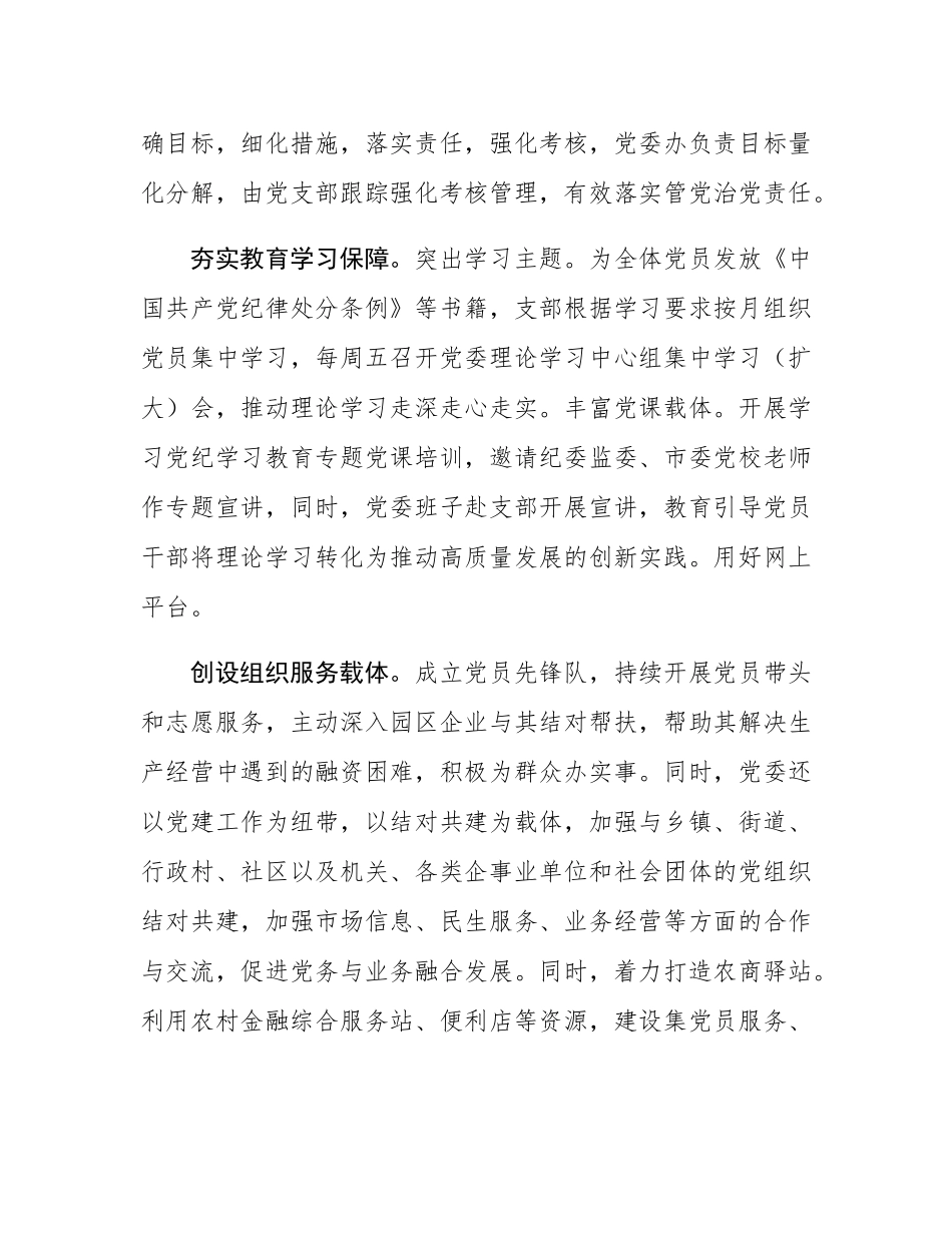 经验交流:党建引领促发展凝心聚力谱新篇近年来,*农商银行持续推进党建引领,细化工作措施增强引领力,丰富主题党日活动增强向心力,抓业务提升影响力,不断提高党建工作水平,凝聚全行高质量发展的新动能。一、细化党建工作措施,增强引领力健全党建工作制度。建立健全党委班子联系点制度、“三重一大”事项实施细则、党支部、党员PK实施方案、党委理论学习中心组学习制度、党费使用、管理制度等,为有效开展党建工作,提高党建工作水平提供了制度保障。明确党建工作责任。强化党委管党建、书记抓党建的责任,牢固确立抓好党建是本职、不抓党建是失职、抓不好党建是不称职的责任意识,切实履行党建工作第一责任人职责。强化监督责任。纪委主动作为,强化监督,严格执纪。同时,党委切实履行党风廉政建设主体责任,纪委履行监督责任,定期研究党建工作特别是党风廉政建设工作,根据每周重点工作清单定期开展监督。强化目标考核。按照党建工作实施细则要求,明确目标,细化措施,落实责任,强化考核,党委办负责目标量化分解,由党支部跟踪强化考核管理,有效落实管党治党责任。夯实教育学习保障。突出学习主题。为全体党员发放《中国共产党纪律处分条例》等书籍,支部根据学习要求按月组织党员集中学习,每周五召开党委理论学习中心组集中学习(扩大)会,推动理论学习走深走心走实。丰富党课载体。开展学习党纪学习教育专题党课培训,邀请纪委监委、市委党校老师作专题宣讲,同时,党委班子赴支部开展宣讲,教育引导党员干部将理论学习转化为推动高质量发展的创新实践。用好网上平台。创设组织服务载体。成立党员先锋队,持续开展党员带头和志愿服务,主动深入园区企业与其结对帮扶,帮助其解决生产经营中遇到的融资困难,积极为群众办实事。同时,党委还以党建工作为纽带,以结对共建为载体,加强与乡镇、街道、行政村、社区以及机关、各类企事业单位和社会团体的党组织结对共建,加强市场信息、民生服务、业务经营等方面的合作与交流,促进党务与业务融合发展。同时,着力打造农商驿站。利用农村金融综合服务站、便利店等资源,建设集党员服务、便民服务、业务办理、产品咨询等多种功能为一体的“农商驿站”。二、丰富主题党日活动,增强向心力抓主题。围绕各项工作推进,在保证主题党日“党味”不淡、程序不乱的基础上,将近期重点业务工作纳入主题,华融党支部开展了“快乐生活,积极工作”主题党日活动,为员工提供放松心情、锻炼体能、增强交流的平台。城关党支部组织辖内网点分组深入社区,积极开展“普惠金融在身边”社区营销主题党日活动,并建立社区客户群,激活大批使用率较低的社保卡。抓融合。各支部以党的二十大精神为指引,以党员先锋队为抓手,全员保持奋进姿态,通过比学赶超,凝聚了勠力同心的正能量。各支部引导党员立足岗位作贡献,支部包片领导以双重身份深入基层网点既走访调研,又以普通党员身份开展总结讨论,既强化全员对党的认识,保持党员本色,又在现场观摩学习了先进网点工作中好的经验和做法。在理论学习和业务推进两个重点的结合中,不断促进全员素质能力提升。在不良贷款清降工作中,在遇到难攻克的地方,各支部扬长补短增强后劲,明确大目标小目标,一项一项抓推进、一个一个抓落实、一点一点去攻坚,坚决做到“党委有部署、支部有要求、全员见行动”。抓带动。按月开展主题党日活动日,活动当天,各党支部书记都会和党员敞开心扉、畅所欲言,引导党员充分发挥聪明才智,献计献策,保证活动的效果。同时,改变了过去主题党日活动仅有本支部党员参加的参与方式,将参加对象扩展至积极分子、普通员工、服务对象等,让党日活动更具包容性、广泛性和群众性,以“党建”带“团建”,此举对本单位青年员工来说具有重要意义,能更好地加强对青年员工的思想政治教育,促进青年员工学习政治理论知识,自觉接受党性教育,提高政治修养,从而更积极地向党组织靠拢,真正履行好党支部组织群众、宣传群众、凝聚群众、服务群众的职责。三、党建+普惠金融,增强影响力党建+金融,擦亮金融品牌。不断创新产品和服务,助力解决农村集体经济组织融资难融资贵问题...