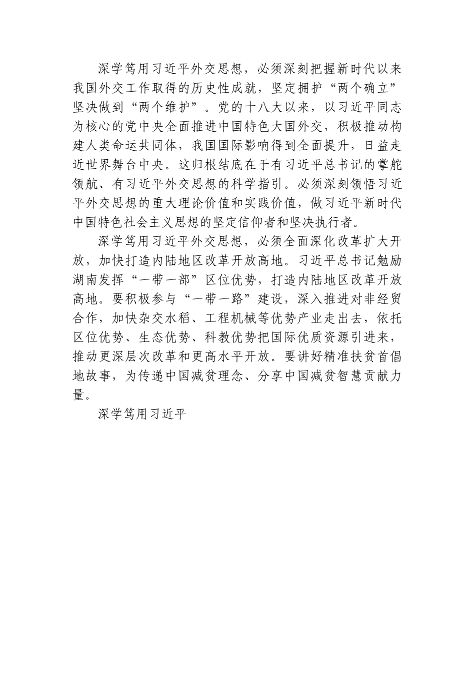十二届省委理论学习中心组第十次集体学习发言汇编(7篇)目录1.深学笃用习近平外交思想开创湖南对外开放新局面2.全面深入学习贯彻习近平经济思想坚定不移推动长沙高质量发展3.深入学习贯彻习近平法治思想推动新时代政法工作高质量发展4.用法治护航“美丽湖南”建设5.深入学习贯彻习近平生态文明思想加快推进美丽湖南建设6.用习近平经济思想指导国资国企高质量发展7.深学笃行习近平法治思想努力为推进法治湖南建设贡献公安力量深学笃用习近平外交思想开创湖南对外开放新局面湖南省委副书记朱国贤习近平外交思想是习近平新时代中国特色社会主义思想的重要组成部分,是马克思主义基本原理同中国特色大国外交实践相结合的重大理论成果,为新时代中国外交工作提供了根本遵循和行动指南。全面落实“三高四新”战略定位和使命任务,必须深学笃用习近平外交思想,以大外事推进大开放,以大开放促进大发展。深学笃用习近平外交思想,必须深刻把握新时代以来我国外交工作取得的历史性成就,坚定拥护“两个确立”坚决做到“两个维护”。党的十八大以来,以习近平同志为核心的党中央全面推进中国特色大国外交,积极推动构建人类命运共同体,我国国际影响得到全面提升,日益走近世界舞台中央。这归根结底在于有习近平总书记的掌舵领航、有习近平外交思想的科学指引。必须深刻领悟习近平外交思想的重大理论价值和实践价值,做习近平新时代中国特色社会主义思想的坚定信仰者和坚决执行者。深学笃用习近平外交思想,必须全面深化改革扩大开放,加快打造内陆地区改革开放高地。习近平总书记勉励湖南发挥“一带一部”区位优势,打造内陆地区改革开放高地。要积极参与“一带一路”建设,深入推进对非经贸合作,加快杂交水稻、工程机械等优势产业走出去,依托区位优势、生态优势、科教优势把国际优质资源引进来,推动更深层次改革和更高水平开放。要讲好精准扶贫首倡地故事,为传递中国减贫理念、分享中国减贫智慧贡献力量。深学笃用习近平外交思想,必须坚决维护国家主权、安全、发展利益,有效防范和化解各种风险挑战。当前,世界进入动荡变革期,不稳定性不确定性显著上升。必须统筹发展与安全,增强忧患意识,树牢底线思维。要积极主动做好对外舆论引导工作,维护好国家政治安全。要坚决同一切侵犯和分裂国家领土的活动作斗争,维护好国家主权和领土完整。要统筹做好经济、金融、网络、生物等重点领域安全工作建立健全风险预警防范机制,坚决捍卫党、国家和人民的根本利益。深学笃用习近平外交思想,必须坚持党对外事工作的集中统一领导,不断提升对外开放工作能力与水平。党的集中统一领导是我国外交最鲜明的特征。要继续完善外事工作体制机制,压实党委主体责任,强化多方协调配合,加强综合归口管理,构建大外事、大协同的工作格局。按照“忠于党、忠于国家、忠于人民,政治坚定、业务精湛作风过硬、纪律严明”的要求,锻造一支让党放心、让人民满意、能堪当时代重任的对外工作队伍。全面深入学习贯彻习近平经济思想坚定不移推动长沙高质量发展湖南省委常委、长沙市委书记吴桂英习近平经济思想高屋建瓴、内涵丰富、博大精深,深刻回答了“实现什么样的发展、怎样实现发展”的时代之问,具有鲜明的科学性、人民性、时代性、实践性、开放性,为我们全面落实“三高四新”战略定位和使命任务、奋力实施“强省会”战略提供了根本遵循和行动指南。长沙将进一步深入学习贯彻习近平经济思想,立足新发展阶段、贯彻新发展理念、构建新发展格局,加快推动高质量发展。一是全力推动产业转型升级。习近平总书记强调,要深化产业结构调整,构建现代产业发展新体系。我们加快壮大工程机械世界级先进制造业集群,先进储能材料、新一代自主安全计算系统等2个国家级先进制造业集群,现代种业、智能终端等N个省级先进制造业集群,做强汽车及零部件、电子信息等7大千亿产业集群,三次产业结构优化为3.2∶39.6∶57.2,助推长沙实现“经济总量过万亿、财税过千亿、人口过千万”三大历史性跨越,力争2026年经济总量突破两万亿元。二是加快建设科技创新高地。习近平总书记指出,科技自立自强是国家强盛之基、安全之要。长...