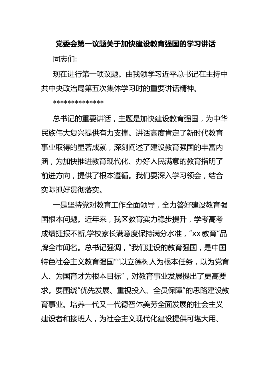 党委会第一议题关于加快建设教育强国的学习讲话同志们:现在进行第一项议题。由我领学习近平总书记在主持中共中央政治局第五次集体学习时的重要讲话精神。**************总书记的重要讲话,主题是加快建设教育强国,为中华民族伟大复兴提供有力支撑。讲话高度肯定了新时代教育事业取得的显著成就,深刻阐述了建设教育强国的丰富内涵,为加快推进教育现代化、办好人民满意的教育指明了前进方向,提供了根本遵循。我们要深入学习领会,结合实际抓好贯彻落实。一是坚持党对教育工作全面领导,全力答好建设教育强国根本问题。近年来,我区教育实力稳步提升,学考高考成绩捷报不断,学校家长满意度保持满分水准,“xx教育”品牌全市闻名。总书记强调,“我们建设的教育强国,是中国特色社会主义教育强国”“以立德树人为根本任务,以为党育人、为国育才为根本目标”,对教育事业发展提出了更高要求。要围绕“优先发展、重视投入、全员保障”的思路建设教育事业。培养一代又一代德智体美劳全面发展的社会主义建设者和接班人,为社会主义现代化建设提供可堪大用、能堪大用的栋梁之材是新时代教育的里要任务、优先任务。对教育事业的人力物力财力投入,不能只算“经济账”,不算“政治账”,不能只算“眼前账”,不算“长远账”。各单位不能只扫“门前雪”,要进一步提高思想认识,在党委的统筹领导下,加大组织领导、发展规划资源保障等方面工作力度,持续推进全区教育高质量发展。要围绕“用新时代中国特色主义思想铸魂育人”的思路开展教育工作。“培养什么人、怎么培养人、为谁培养人”是建设教育强国的核心课题。要持续推进我区大中小学校思政教育建设工作,着重加强社会主义核心价值观教育,正确引导学生听党话、跟党走,具备理想、树立信念;要强化对思政教学内容的监督管理,鼓励师生开展形式新颖、内容积极、具有针对性和吸引力的思政课堂,稳步做好校园思政工作和意识形态工作。要围绕“常态化、具体化、精准化”的思路推进教育系统从严治党。教育系统是全区教育发展的“桥头堡”,教育系统的廉政风气是教育发展“风向标”,直接影响人民群众对教育质量的信心。全区教育系统各级党组织要一以贯之、持之以恒地正风肃纪,保证教育事业建设队伍的干净忠诚;要以又严又准的基调、又细又实的措施,保障教育领域各项权力在阳光下运行;要切实加强对“关键职能”“关键事项”的纪律检查,全面打造我区教育系统风清气正、清廉健康的良好工作氛围。二是加快教育资源统筹供应,系统完成建设教育强国重要任务。教育之力是民生幸福之本、教育之强是国家富强之基。总书记强调,“要坚持系统观念,统筹推进育人方式、办学模式、管理体制、保障机制改革,全面提升教育治理体系和治理能力现代化水平”。要保障好群众“有学上”的基本需求。今年,我区秋季入学形势较为严峻,各级学校学位需求大、运转满负荷。各责任单位要加紧研判调度,抓好落实推进;要加快校舍建设,保证高质量、留好提前量,让学生家长安心如期入学;要统筹增配学位数量和师资力量,有序开展对上协调、对内挖潜和校际调配,保障学位充足配备、师生比例达到国家标准要求;要大力提升校园环境,逐一落实学校运行所需设备配备情况、校园环境建设情况,确保校舍文化氛围足、教学设施优。要满足好群众“上好学”的改善需求。当前,我区教育资源分布依然存在不平衡的问题,"xx、xx”两片区在数量和质量上落后于xx片区,部分学区的区位划分矛盾亟待解决,需要我们继续以高质量发展为主线,加快研究推进教育资源扩容增效、促进教育合理均质分布,进一步缩小教育的区域、校际、群体等各方面差异,让我区的教育是公平的、均衡的、社会效用最优的。要营造好全社会“终身学”的优良风气。总书记在讲话中指出,"要建设全民终身学习的学习型社会、学习型大国,促进人人皆学、处处能学、时时可学”。结合xx∞x、x∞∞x<等一些企业的反馈,我区高素质技术技能人才依然存在较大缺口,要统筹推进职业教育、高等教育、继续教育普及质效,促进校企合作、产教融合,教科兴产,源源不断地提供满足生产力布局和城镇化需求的能工巧匠;要充分利用“x∞xx”等实体化...