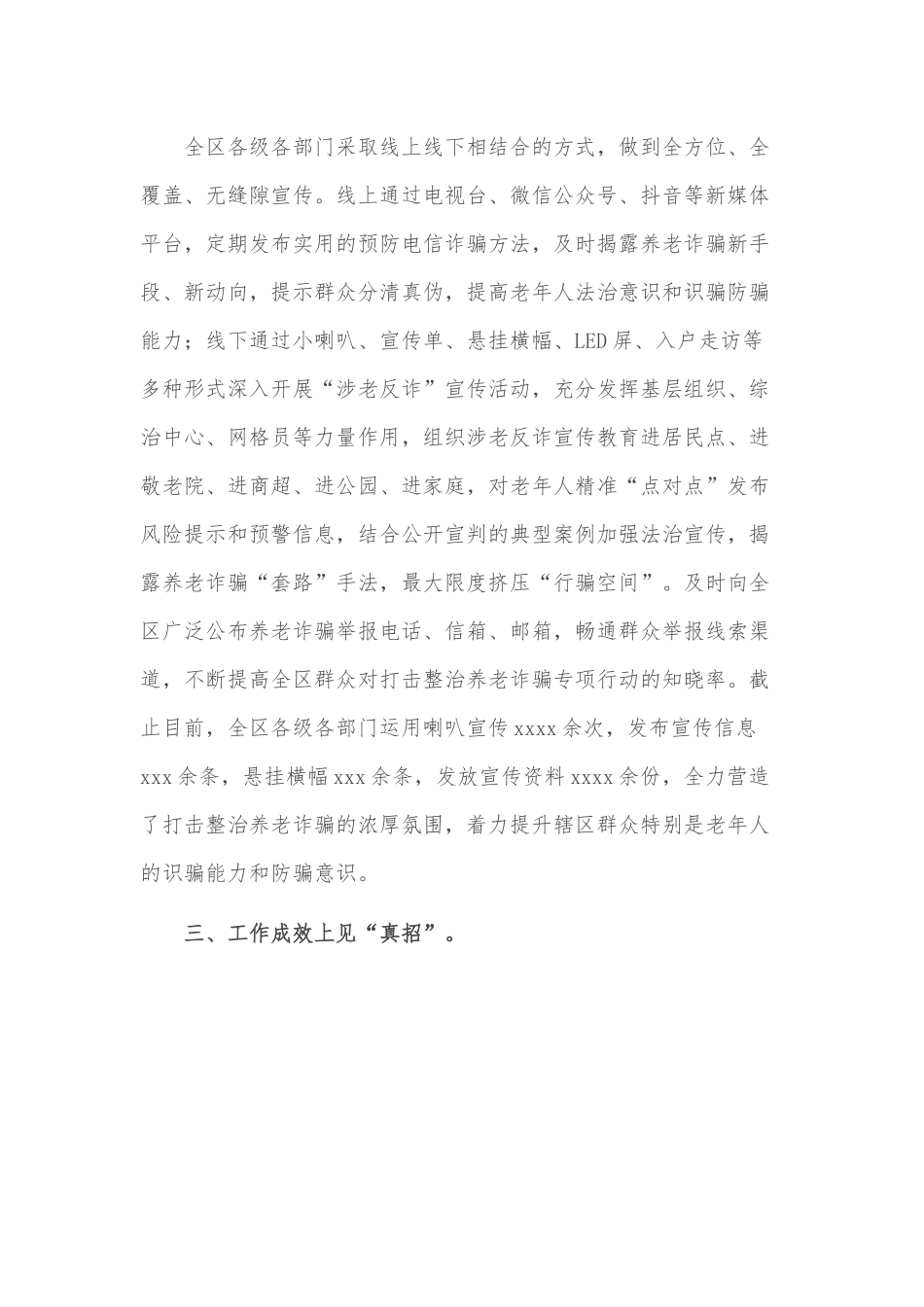 2022年区政府打击整治养老诈骗专项行动工作总结自全国开展打击整治养老诈骗专项行动以来,xx区认真学习贯彻中省市决策部署,不断提升政治站位,强化组织推动,坚持宣传教育、依法打击、整治规范“三箭齐发”,综合运用“打、防、管、控”一体推进打击整治养老诈骗专项行动走深走实。一、组织保障上用“实招”。全市打击整治养老诈骗专项行动动员会后,区委、区政府高度重视,强化组织领导,成立了以区委常委、政法委书记任组长,公、检、法“三长”任副组长,政法委、宣传部、民政局等xx个部门主要负责人和各街镇党(工)委书记为成员的高规格打击整治专项行动领导小组,领导小组下设专项办。区专项办在设立综合、打击、整治、宣教x个工作组的基础上增设线索组,共从各行业主管部门中抽调x名政治立场坚定、业务能力过硬的干部到区专项办集中开展工作,高效推动打击整治工作,做到“组织机构、工作人员、办公场所、经费保障”四到位。同时,以区委平安办名义制定印发《xx市xx区打击整治养老诈骗专项行动实施方案》,明确了工作目标、重点任务及工作要求,切实形成街镇部门“一把手”负总责、亲自抓,分管领导扛在肩、经常抓,上下贯通、左右联动、运转高效的工作体系,并将专项行动纳入年度平安建设考核评价指标内容,确保专项行动有力有序有效推进。二、营造氛围上出“新招”。全区各级各部门采取线上线下相结合的方式,做到全方位、全覆盖、无缝隙宣传。线上通过电视台、微信公众号、抖音等新媒体平台,定期发布实用的预防电信诈骗方法,及时揭露养老诈骗新手段、新动向,提示群众分清真伪,提高老年人法治意识和识骗防骗能力;线下通过小喇叭、宣传单、悬挂横幅、LED屏、入户走访等多种形式深入开展“涉老反诈”宣传活动,充分发挥基层组织、综治中心、网格员等力量作用,组织涉老反诈宣传教育进居民点、进敬老院、进商超、进公园、进家庭,对老年人精准“点对点”发布风险提示和预警信息,结合公开宣判的典型案例加强法治宣传,揭露养老诈骗“套路”手法,最大限度挤压“行骗空间”。及时向全区广泛公布养老诈骗举报电话、信箱、邮箱,畅通群众举报线索渠道,不断提高全区群众对打击整治养老诈骗专项行动的知晓率。截止目前,全区各级各部门运用喇叭宣传xxxx余次,发布宣传信息xxx余条,悬挂横幅xxx余条,发放宣传资料xxxx余份,全力营造了打击整治养老诈骗的浓厚氛围,着力提升辖区群众特别是老年人的识骗能力和防骗意识。三、工作成效上见“真招”。坚持“行业整治”“地方整治”两条线统筹运行,推进以区委宣传部等x个部门、xx个街镇的整治工作双线互补、协同发力,努力形成“各级抓、抓各级”“系统抓、抓系统”的工作格局。建立动态日报、总结周报、要情随报的工作机制,及时汇总情况、研判形势、协调调度、督导推进,工作中形成“一本台帐、两张图表、三个方案、四份清单”,促进各项工作有序开展。制定下发《xx市xx区打击整治养老诈骗专项行动线索受理工作流程》,严格线索核查工作流程,组织各成员单位聚焦以提供“养老服务”、投资“养老项目”、销售“养老产品”、宣称“以房养老”、代办“养老保险”、开展“养老帮扶”等为名实施诈骗、侵害老年人合法权益的各类违法犯罪行为,扎实开展涉老诈骗线索摸排工作,深挖彻查行业领域养老诈骗问题隐患。截止目前,我区成功打掉xx“以帮人办理养老保险”为名养老诈骗案一件,该案涉案资金xx万余元,犯罪嫌疑人xx已被刑事逮捕,案件正在进一步侦办深挖之中。下一步,xx区将坚持问题导向,聚焦打击整治重点环节,进一步加大线索摸排、核查转办、打击惩治、追赃挽损力度,抓痛点、攻难点、消堵点,切实打出声威、打出效果。一是坚决扛牢政治责任。深刻认识开展打击整治养老诈骗专项行动的重大意义,进一步统一思想、提高站位、凝聚共识,迅速行动,主动作为,以更高的政治自觉、更强的政治担当、更大的责任使命扎实开展专项行动,切实守护好老百姓“养老钱”,维护好老年人合法权益。二是扎实细化工作举措。牢固树立一盘棋思想,严格按照《方案》安排部署,认真统筹谋划,精心组织实施,协调推动落实,做到责任链条化、任务清单...
