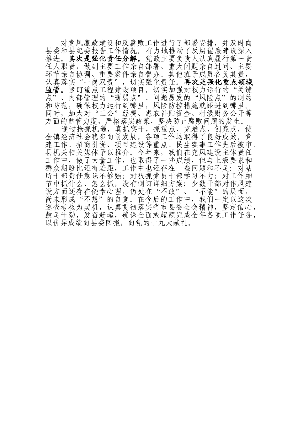 对领导班子的整体评价xx镇领导班子认真贯彻落实党的十八大精神,坚持以习近平总书记系列讲话精神为指导,把落实党委的主体责任和纪检的监督责任作为加强自身建设的一项重要任务来抓,以身作则,率先垂范,不断增强班子的凝聚力和战斗力。一、带头守责,树良好形象。首先是抓学习考核。认真学习党章、《中国共产党问责条例》等党内法规和习近平总书记关于严明纪律全面从严治党条例重要讲话精神,与镇村干部开展谈心谈话活动,强化党性修养、纪律意识和组织意识;其次是严格落实党风廉政建设责任制的表率作用。班子成员严格遵守中央、省委、市委和县委机关规定要求和领导干部廉洁自律规定要求,带头遵守党纪党规。二、出台制度,严实作风首先是从严规范干部管理。出台《xx镇机关管理制度》、《xx镇加强干部作风管理制度》、《xx镇“互联网+监督”制度》和《xx镇村级工作目标管理千分制考核办法》等制度,对镇村干部工作进行严格的监督和管理,确定各项工作目标任务并逐项落地生效;其次是狠抓干部作风问题。坚持以干部作风建设年为契机,突出问题导向,主攻薄弱环节,对监督发现的换届、作风方面等问题及时进行处理,查处干部“四风”问题起,先后约谈人、下发通报期,形成有力震慑,干部工作作风、晋升风貌较为改观。再次是推进推进党务政务公开。坚持“公开是原则,不公开是例外”,及时在镇村宣传栏公布各类政策信息、办事信息等,着力方便群众办事,主动接受群众监督。三、齐抓共管,履行主业首先是强化组织领导。在干部大会和工作讲评会上对党风廉政建设和反腐败工作进行了部署安排,并及时向县委和县纪委报告工作情况,有力地推动了反腐倡廉建设深入推进。其次是强化责任分解。党政主要负责人认真履行第一责任人职责,做到主要工作亲自部署、重大问题亲自过问、主要环节亲自协调、重要案件亲自督办。其他班子成员各负其责,认真落实“一岗双责”,切实强化责任。再次是强化重点领域监管。紧盯重点工程建设项目,切实加强对权力运行的“关键点”、内部管理的“薄弱点”、问题易发的“风险点”的制约和防范,确保权力运行到哪里,风险防控措施就跟进到哪里。同时,加大对“三公”经费、惠农补贴资金、村级财务公开等方面的监管力度,严格落实政策,坚决防止腐败问题的发生。通过抢抓机遇,真抓实干,抓重点、克难点、创亮点,使全镇经济社会稳步向前发展,各项工作均取得了良好成效。党建工作、招商引资、项目建设等重点、民生实事工作先后被市、县机关相关媒体予以推介。今年来,我们在党风建设主体责任工作中,做了大量工作,也取得了一些成绩,但与上级要求和群众期盼比还有差距,工作中也还存在一些问题和不足:对站所干部责任意识不够强;对狠抓党员干部学习不力;对工作细节中抓什么、怎么抓,没有制订详细方案;少数干部对作风建设方面还存在侥幸心理,仍处在“不敢”、“不能”的层面,尚未形成“不想”的自觉。在今后的工作中,我们一定以这次巡查考核为契机,认真贯彻落实省市县委全会精神,坚定信心,鼓足干劲,发奋赶超,确保全面或超额完成全年各项工作任务,以优异成绩向县委回报,向党的十九大献礼。