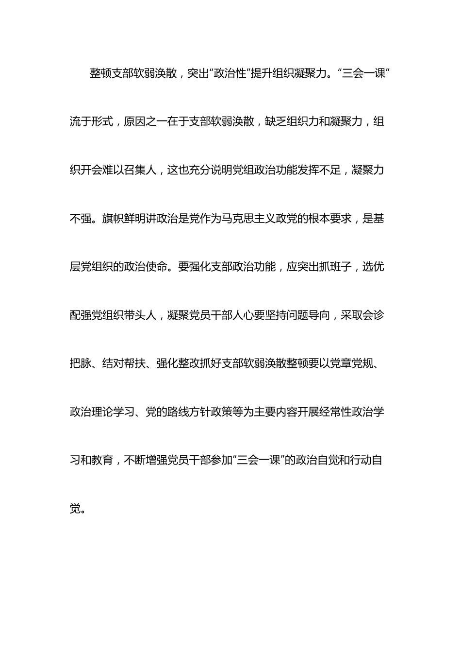 政治判断力、政治领悟力、政治执行力“三力”党课讲稿发言材料(3篇)党员干部要有政治判断力、政治领悟力、政治执行力“三力”党课讲稿:“三性三力”破解三会一课“形式主义”“三会一课”是我们党的优良传统,是加强党员教育、保持党员先进性和纯洁性,增强党组织凝聚力、战斗力的重要载体,是基层党组织必须坚持的一项基本政治制度。然而,在贯彻落实“三会一课”制度中,存在内容枯燥、形式单一、程序简化等完成任务、应付检查式的“形式主义”,背离了“三会一课”的初衷,影响了“三会一课”的质效。对此,要着力从支部、书记和党员三个维度入手,以“三性三力”破解三会一课“形式主义”。整顿支部软弱涣散,突出“政治性”提升组织凝聚力。“三会一课”流于形式,原因之一在于支部软弱涣散,缺乏组织力和凝聚力,组织开会难以召集人,这也充分说明党组政治功能发挥不足,凝聚力不强。旗帜鲜明讲政治是党作为马克思主义政党的根本要求,是基层党组织的政治使命。要强化支部政治功能,应突出抓班子,选优配强党组织带头人,凝聚党员干部人心要坚持问题导向,采取会诊把脉、结对帮扶、强化整改抓好支部软弱涣散整顿要以党章党规、政治理论学习、党的路线方针政策等为主要内容开展经常性政治学习和教育,不断增强党员干部参加“三会一课”的政治自觉和行动自觉。增强书记能力本领,突出“趣味性”提升活动吸引力。“三会一课”流千形式的另一个原因在千书记能力不足,“本领恐慌”。组织开展“三会一课”陈旧老套、缺乏新意,吸引力不足,无法满足和适应党员日益增长的学习新要求。群雁高飞靠头雁,船载万斤靠舵人。作为支部的带头人,要想给人一碗水,自己要有一桶水。支部书记必须加强自身能力建设,不断增强政治判断力、政治领悟力、政治执行力,在组织“三会一课”形式上创新突破,由室内课堂转向现场教学,由“单向灌输”转为“双向互动”,变“独角戏”为“群英汇”,在增强“三会一课”吸引力上下足功夫、做足文章,不断提升“三会一课”趣味性和党员干部的参与度。强化党员党性意识,突出“科学性”提升支部向心力。在参加“三会一课”中,部分党员认为“三会一课”是一种负担,影响其开展其他工作,不想、不愿参加,这是党性意识不强的表现,也是导致“三会一课”形式主义的重要原因。参加“三会一课”本就是加强党性锻炼的重要载体,长期因不想、不愿参加,将严重影响党员党性锻炼和支部凝心聚力的战斗堡垒作用发挥。要改变此种现状,应突出加强对党员的考核管理,探索建立互联网和信心技术为支撑的智能考评,推进平时考核与年终考核相结合,由注重资料考核向注重效能考核转变,在科学考核中增强党员参加“三会一课”的主动性,提升支部的向心力。党员干部要有政治判断力、政治领悟力、政治执行力“三力”党课讲稿:“学党史”助年轻干部凝练“三力”党史,是营养剂,是教科书,是清醒剂。我们党的百年历史,就是一部践行初心使命的历史,就是一部党与人民心连心、同呼吸、共命运的历史。作为党和人民事业发展的生力军,在党史学习过程中,年轻干部不仅要学会领悟党史故事中蕴含的智慧和力量,更是要通过党史学习,不断淬炼对党忠诚的政治力、筑牢为民尽责的服务力、增强干净担当的自制力。以“忠诚印寸心,浩然充两间”的纯粹为信仰之基,淬炼对党忠诚的政治力。要求年轻干部要自觉加强政治历练,增强政治自制力,始终做政治上的“明白人”“老实人”。作为年轻干部,认真学习中国共产党百年党史,通过学习党史,领悟我们党为什么能够经受考验、战胜困难,不断发展壮大的原因,找到我们出发的原点、支点。从而以清醒的认识来坚定自身的立场。要从党史中学习革命先辈的的奋斗目标、革命精神,以他们的政治品质,来不断提升自己的思想认识、把稳自己的前进方向、践行自己的坚定信念。作为党和国家事业接班人,年轻干部要淬炼对党忠诚的政治力,以对党和人民绝对忠诚为信仰之基,确保我们在前进道路上把准方向,做到不忘初心、牢记使命。以“历尽天华成此景,人间万事出艰辛”的实干为动力之源,筑牢为民尽责的服务力。人民对美好生活的向往,就是我们的奋斗目标,党的...