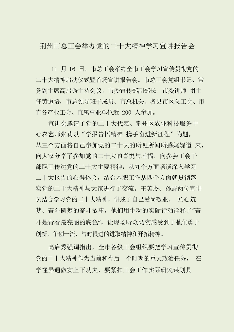 荆州市总工会举办党的二十大精神学习宣讲报告会11月16日,市总工会举办全市工会学习宣传贯彻党的二十大精神启动仪式暨首场宣讲报告会。市总工会党组书记、常务副主席高启秀主持会议,市委宣传部副部长、市委讲师团主任黄道培,市总领导班子成员、市总机关、各县市区总工会、市直各产业工会、直属事业单位近200人参加。宣讲会邀请了党的二十大代表、荆州区农业科技服务中心农艺师张莉以“学报告悟精神携手奋进新征程”为题,从三个方面将自己参加党的二十大的所见所闻所感娓娓道来,向大家分享了参加党的二十大的喜悦与幸福,向参会工会干部职工传达党的二十大主要精神,从九个方面畅谈深入学习二十大报告的心得体会,结合本职工作从四个方面就贯彻落实党的二十大精神与大家进行了交流。王英杰、孙野两位宣讲员结合学习党的二十大精神,讲述了自己爱岗敬业、匠心筑梦、奋斗圆梦的奋斗故事,他们用生动的实际行动诠释了“奋斗是青春最亮丽的底色”,让现场听众切实感受到了他们勇于创新,争创一流,与时俱进的进取精神和开拓精神。高启秀强调指出,全市各级工会组织要把学习宣传贯彻党的二十大精神作为当前和今后一个时期的重大政治任务,在学懂弄通做实上下功夫,要紧扣工会工作实际研究谋划具体贯彻落实举措,将贯彻党的二十大精神转化为做好工会工作的强大动力和生动实践。一是要在学习党的二十大精神入脑入心、融会贯通上下功夫。工会领导干部要带头学习,以身作则、以上率下,迅速在全市工会干部和广大职工中迅速兴起学习贯彻热潮。二是用党的二十大精神引领工会工作创新发展上求实效。要深刻理解、准确把握二十大提出的新思想新论断新特点新目标新要求,找准工会工作的切入点,切实把党的二十大精神落实到工会工作各个方面。三是推动宣传党的二十大精神在基层落地生根上求创新。全市各级工会要迅速掀起学习宣传贯彻党的二十大精神热潮,广泛开展“五宣五进”活动进企业、进车间、进班组、进工地、进社区,切实推动党的二十大精神在职工中入脑入心、落地生根、开花结果。四是用党的二十大精神推动工会工作上台阶上抓落实。要对照年初重点工作部署,全力查漏补缺,注重以学促用、以学促建,稳步推进全市工会系统各项工作有力有序有效落实,确保完成全年工作目标任务,交出一份满意的答卷。同时要用党的二十大精神为指引,及时思考谋划好明年和今后一个时期的工会工作,奋力谱写新时代荆州工会工作新篇章。会上,市委宣传部领导、市总工会负责人为首批18名职工(劳模)宣讲队成员颁发了聘书。