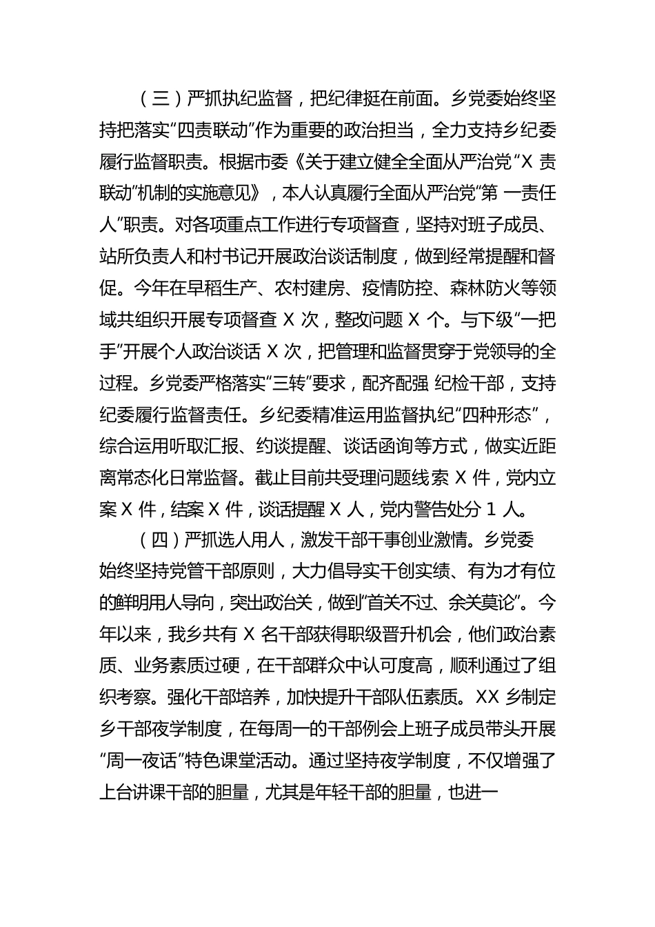 2022年度乡镇履行全面从严治党主体责任情况报告(3089字)2022年,XX党委在县委县政府的正确领导下,深入学习贯彻习近平新时代中国特色社会主义思想,坚决落实党要管党、从严治党主体责任,加强政治建设,严格纪律规矩,强化党内监督,推动全面从严治党不断走向深入。现对照年初制定的《2022年落实全面从严治党主体责任工作要点》,将落实情况报告如下:一、履责情况及成效(一)严抓思想教育,增强党纪意识强化源头预防。乡党委始终坚持把加强理想信念作为重大政治使命,切实拧紧思想和行动的”总开关”。一是旗帜鲜明讲政治。采取党委中心组学习、三会一课、书记讲党课、干部例会等形式,认真学习贯彻习近平总书记关于全面从严治党、作风建设重要论述和视察江西重要讲话精神。坚定站在忠诚捍卫“两个确立”、坚决做到“两个维护”的政治高度,学懂弄通做实习近平新时代中国特色社会主义思想。自《习近平谈治国理政》第四卷出版发行以来,我乡各党支部、党员掀起了学习《习近平谈治国理政》第四卷热潮,乡党委组织班子成员、县乡人大代表带头学,各党支部充分利用“三会一课”、主题党日等活动,组织党员干部日常学。切实用习近平新时代中国特色社会主义思想武装头脑、指导实践、推动工作。二是学思践悟强党性。乡党委认真贯彻落实习近平总书记关于推动党史学习教育常态化长效化的重要指示精神,大力弘扬伟大建党精神,不断巩固和拓展党史学习教育成果。今年以来,党委书记共上红色廉政党课3次,组织党员干部参观xx红色教育基地、乡廉政教育室和观看《邓小平小道》等红色电影。通过学习伟大建党精神和正反典型案例教育引导党员干部筑牢信仰之基、补足精神之钙、把稳思想之舵。(二)严抓管党治党,聚焦党建主责主业。乡党委始终坚持把落实管党治党作为最根本的政治责任,牢牢抓住责任制这个“牛鼻子”。一是不断严肃党内政治生活,严格落实“三会一课”制度定期开好民主生活会、组织生活会,党委书记秉着“红红脸、出出汗”的原则,带头开展批评与自我批评,准确抓住领导班子这个“关键少数”,推动领导班子成员自觉担当领导责任和示范责任。2022年以来,我乡共召开民主生活会X次、组织生活会X次,开展专题研讨X次。二是坚持推行每月“抓党建工作日”和“一线工作法”,以问题为导向,深入下辖基层党组织,开展调查研究,进行现场指导,推动问题在一线解决、短板在一线补齐、任务在一线落实。三是积极开展红旗党支部和模范党支部创建活动,打造了以“XX”工作法为载体的XX红旗党支部和以“XX”党建为载体的模范党支部—XX党支部。四是深入推行“党员户制度”,全乡设党员户X户,联系党员X名,联系农户X户;充分发挥党员先锋模范作用,形成“一户带一片,多片带整体”的服务工作格局。(三)严抓执纪监督,把纪律挺在前面。乡党委始终坚持把落实“四责联动”作为重要的政治担当,全力支持乡纪委履行监督职责。根据市委《关于建立健全全面从严治党“X责联动”机制的实施意见》,本人认真履行全面从严治党“第一责任人”职责。对各项重点工作进行专项督查,坚持对班子成员、站所负责人和村书记开展政治谈话制度,做到经常提醒和督促。今年在早稻生产、农村建房、疫情防控、森林防火等领域共组织开展专项督查X次,整改问题X个。与下级“一把手”开展个人政治谈话X次,把管理和监督贯穿于党领导的全过程。乡党委严格落实“三转”要求,配齐配强纪检干部,支持纪委履行监督责任。乡纪委精准运用监督执纪“四种形态”,综合运用听取汇报、约谈提醒、谈话函询等方式,做实近距离常态化日常监督。截止目前共受理问题线索X件,党内立案X件,结案X件,谈话提醒X人,党内警告处分1人。(四)严抓选人用人,激发干部干事创业激情。乡党委始终坚持党管干部原则,大力倡导实干创实绩、有为才有位的鲜明用人导向,突出政治关,做到“首关不过、余关莫论”。今年以来,我乡共有X名干部获得职级晋升机会,他们政治素质、业务素质过硬,在干部群众中认可度高,顺利通过了组织考察。强化干部培养,加快提升干部队伍素质。XX乡制定乡干部夜学制度,在每周一的干部例会上班子成员带头开展“周一夜话”特...