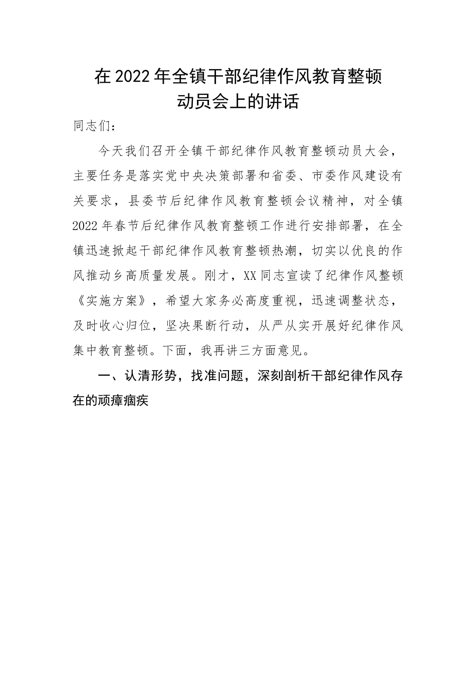 在2022年全镇干部纪律作风教育整顿动员会上的讲话同志们:今天我们召开全镇干部纪律作风教育整顿动员大会,主要任务是落实党中央决策部署和省委、市委作风建设有关要求,县委节后纪律作风教育整顿会议精神,对全镇2022年春节后纪律作风教育整顿工作进行安排部署,在全镇迅速掀起干部纪律作风教育整顿热潮,切实以优良的作风推动乡高质量发展。刚才,XX同志宣读了纪律作风整顿《实施方案》,希望大家务必高度重视,迅速调整状态,及时收心归位,坚决果断行动,从严从实开展好纪律作风集中教育整顿。下面,我再讲三方面意见。一、认清形势,找准问题,深刻剖析干部纪律作风存在的顽瘴痼疾去年以来,新一届镇党委、政府始终把加强作风建设作为密切党群干群关系、凝聚人心、推进发展的一项重要工作来抓,全镇干部的精神面貌发生了较大的变化,大局意识、公仆意识、服务意识也明显增强。尤其是在灾后重建、疫情防控、秦岭山水建设等工作中,全镇上下充分发扬了艰苦奋斗、吃苦耐劳、无私奉献的可贵精神。总体上看,我镇干部队伍是一支能吃苦、能战斗,值得信赖和依靠的队伍,多数部门也能够发挥职能作用,围绕加快发展献计出力,搞好服务;绝大多数干部能够爱岗敬业,恪尽职守,扎实工作,这些必须给予充分肯定。但同时,我们也清醒地认识到,党的十九大为我们提出了新的更高的要求,与面临的新形势相比,与上级的要求相比,我们乡镇干部队伍在工作落实、作用发挥、履职能力方面,都还存在一些不容忽视的问题,突出表现在以下四个方面:一是领导主体责任落实不到位的问题。对标上年度工作计划、中央和省委、市委、县委巡视巡察反馈问题,我镇部分工作因汛情、疫情影响推进缓慢、工作上要求不严、标准不高、成效不足,导致多次被全县通报批评。工作普遍存在重安排部署,轻督查检查,跟进推进少,导致出现“会议开了,一散了之,不落实;文件有了,一批了之,不督办;事务多了,一交了之,不追问;材料搞了,一送了之,不把关;制度有了,一看了之,不执行”,日常的深入检查督察、跟踪服务形式大于实际,狠抓落实的力度先硬后软,虎头蛇尾,往往出现“查事多,查人少”思想。二是“关键少数”作用发挥不明显的问题。面对当前新形势下干部管理要求,班子内部个别领导干部面对工作适应能力不强,工作缺少全局意识,执行力、合力不够,工作的“能力、水平、体力、意志力”不能均衡发展。如在各村的疫苗接种工作中,就出现有的村进度快、有的村停滞不前,或一抓就进,一松就退,这就是习惯于矛盾往上交,责任往下压,工作缺少主动作为精神,不敢负责、不想碰硬。个别领导干部、单位负责人在抓工作上情况不明,乐于表态、工作调门高、行动落实差,表率作用发挥不够,习惯于当“二传手”;工作拿不出具体办法措施,以签字批转、开会安排代替工作落实,请示汇报少,指导检查不够,导致履职尽责不到位。没有发挥到“关键少数”的作用,缺乏“坐不住”的责任感,“慢不得”的危机感,“等不起”的紧迫感,没有在干部中起到模范带头作用。三是党员干部作风政风不扎实的问题。“浮”即工作浮漂,乡镇不同于县级机关,我们的工作核心就是抓落实。但我们有的干部缺少担当,干工作挑肥拣瘦,总认为自己干的多,工作辛苦,多次要求调整岗位,缺少全心全意为人民服务的奉献精神。有些干部工作效率低下、工作不积极、不主动,领导签批的文件,一拖再拖,既不谋划落实,也不主动汇报,有些工作安排下去一两个星期,还是正在办理、正在协调。有的干部缺乏精细化工作态度,基本功不扎实,对政策了解掌握不准,对业务数据不能了然于心,没有做到底数清、情况明、政策熟、业务精,导致工作缺少特色亮点。四是村级干部履职能力不到位的问题。当前,乡镇村级班子基本配齐,但部分村干部责任意识缺失,表现为“混日子”。这一现象主要为缺乏追求,胸无大志,干一天算一天,精神不振,无所事事,没有干事创业的朝气和活力;有一部分同志干了工作,但对工作标准不高,不求创新、不图进取,原地踏步,习惯于穿新鞋走老路,面对成绩时沾沾自喜,满足于还可以、过得去;在遇到棘手问题时不愿碰硬,不去发现问题存在的根源...