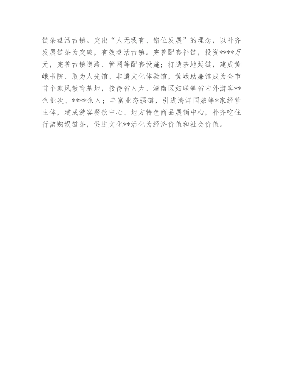 文化旅游发展汇报:加快文旅突围发展全力争创旅游名县近年来,**区坚持以习近平新时代中国特色社会主义思想为指导,全面贯彻落实省委、市委决策部署,以争创**旅游名县、全域旅游示范区为抓手,立足打造**地区休闲旅游首选地,聚焦聚力整合资金新建、创新机制提升、补齐链条盘活、包装谋划储备“四个一批”,下好**盘活、项目撬动、融合蝶变“三步棋”,走出了一条后发地区文旅突围发展的新路子,成为全市唯一获批创建“四川省现代公共文化服务体系建设示范县”的区县,获评全国最具投资价值旅游目的地。20**年,旅游综合性收入同比增长**%。20**年*-*月,文旅投入*.**亿元,同比增长***%,实现文旅收入**.**亿元,为全区经济增长领跑全市提供了强有力的支撑。一是坚持以会促建,写好景城一体“大文章”。整合建设资金。将筹办全市文旅大会作为提升文旅产业发展水平、推动经济转型升级的重要机遇,坚持小财政办大文旅,牢固树立“文旅+公园城市”理念,把城市作为最美的公园、最大的景区来打造,整合各方投入**.**亿元,新建改建文旅项目*个,初步形成景在城中、城在景中。建设公园城市。扎实推进“三园三路三改一街”十大重点项目建设,*江生态湿地公园、**主题公园等城市重点项目建成并投入使用,拉动了周边餐饮、住宿、零售、娱乐、地产等产业集聚发展,**群众获得感、幸福感得到显著增强,“湖光山色、安逸**”城市名片更加响亮。打造城市地标。引入上市公司棕榈集团投资**亿元,建设**时光里特色商业街区,打造**版“太古里”,建设夜游经济带,城市人气商气显著改善。二是坚持以引强链,下好文旅**“盘活棋”。精准排查摸清底数。坚持内外双向突围,针对七彩明珠、黄峨古镇等区内景区前期运行中存在的问题,本着“新官理旧账,还要理得了、理得好旧账”理念,在化解历史遗留问题、景区盘活上狠下功夫。创新机制提升景区。创新实施景区所有权、经营权、管理权“三权分离”,加快盘活景区业态。政府把握所有权,设立文化和旅游产业扶持基金,每年财政预算配套资金不低于****万元;农旅园区具体管理,推动景区重大文旅项目建设、基础设施提升,开展业态招引、日常监管等工作;经营权委托专业团队,引进海洋国旅专业团队托管经营景区,总投资****万元建设**,新晋为城市近郊旅游网红打卡地,开放以来首趟千人旅游专列开进**,国庆期间累计接待游客**.**万人次。补齐链条盘活古镇。突出“人无我有、错位发展”的理念,以补齐发展链条为突破,有效盘活古镇。完善配套补链,投资****万元,完善古镇道路、管网等配套设施;打造基地延链,建成黄峨书院、敢为人先馆、非遗文化体验馆,黄峨助廉馆成为全市首个家风教育基地,接待省人大、潼南区妇联等省内外游客**余批次、****余人;丰富业态强链,引进海洋国旅等*家经营主体,建成游客餐饮中心、地方特色商品展销中心,补齐吃住行游购娱链条,促进文化**活化为经济价值和社会价值。三是坚持以融兴产,唱好产业升级“重头戏”。加快区域融合。依托**泛*江流域文化旅游联盟,推动文化旅游品牌共建、旅游线路共推、公共文化共享,打造伍先华红色感恩、**桃花乡愁体验、**寺禅意养生等*条**精品旅游专线,开通**城区至**镇西部首条跨省城际公交,积极融入**文化旅游走廊。加快文旅融合。实施书香、花香、菜香“三香**”文旅振兴工程,观音绣随“神九”遨游太空,**广竹编屡获金奖,非遗音乐剧《**》赢得游客点赞,《**》网络剧在国家广电总局成功备案。加快农旅融合。擦亮生态底色,加快建设*江生态文化走廊,连续*年举办乡村文化旅游节,县域副中心拦江镇成功创建国家级特色小镇,“**人家”成功创建全国休闲农庄示范单位,毗卢寺村入选“四川十大最美古村落”,金鸡村、海龙村被评为省级乡村旅游重点村。四是坚持以点带面,绘好全域旅游“新蓝图”。坚持“全域旅游”理念,抢抓**地区双城经济圈战略机遇,加快编制**全域旅游规划和文旅“十四五”规划,精心包装储备重大文旅项目**个、总投资***.*亿元,加快构建“一带三区”全域旅游发展布局。一带即以总投资*亿元的跑马滩-卧佛院文旅合作示范项目为支撑,联动安岳、潼南等毗邻区县,打造...