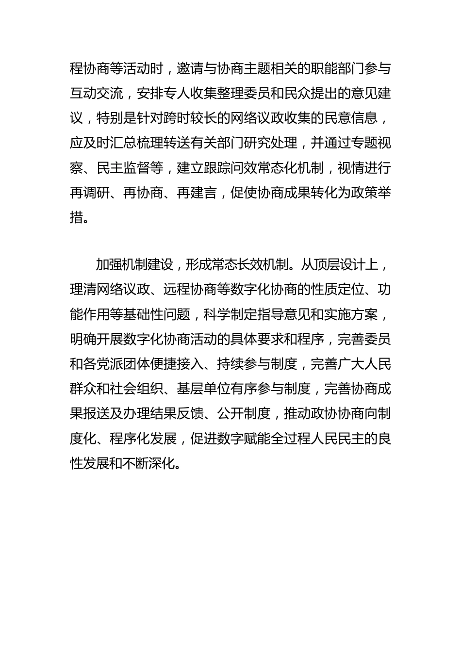 【政协工作体会文章】用信息技术赋能协商民主提高人民政协协商实效习近平总书记在党的二十大报告中明确指出,发挥人民政协作为专门协商机构作用,加强制度化、规范化、程序化等功能建设,提高深度协商互动、意见充分表达、广泛凝聚共识水平。随着新兴数字技术的迅猛发展,积极探索网络议政、远程协商等新形式,用信息技术赋能协商民主,提高人民政协协商实效,对于丰富和拓展全过程人民民主实现形式意义深远。加强思想引导,凝聚各方共识。加快信息化服务宣传推广,引导广大人民群众利用信息化手段有序参与政协协商,更多更快更高效地收集民意反映民意,使信息化渠道成为党委政府听民声、察民情、解民困的重要途径,为建言资政和凝聚共识双向发力注入新动力,为推进政协协商向社会辐射、向基层延伸创造新空间。加强软硬件建设,拓宽协商渠道。适应人民群众期待和需求,打造功能强大、方便易用、安全稳定的数字化协商平台,为社会大众提供用得上、用得起、用得好,能够充分表达诉求的信息服务。建设远程协商会议室、办公场所、机房等,引入增配有专业能力的工作人员,负责数字化协商平台的运行、管理、维护等,强化网络安全监测预警和技术防护,确保数字化协商平台等系统安全可靠。数字化协商平台要与政协门户网站、微信公众号等实现数据共享、功能互补,并将应用范围扩展到省市县三级政协,构建起横向到边、纵向到底的网络体系,推动各级各地政协联动履职。加强调查研究,提高协商质量。以知民情、解民忧、纾民怨、暖民心为着力点,运用大数据、云计算等信息技术手段,加强对重大问题、敏感问题的调查研究,及时掌握群众在干什么、想什么、需要什么、有什么困难,提高协商议政、建言献策的精准度和科学性。加强政协数字化协商平台与党委、政府及有关部门数字系统以及大专院校、科研院所智库的联通,争取获得数字“外脑”的支持;打通与社会公众的连接通道,如面向大众的意见征询、网络问卷调查等,吸收基层群众的智慧。加强跟踪问效,推动成果转化。通过数字化协商平台、网站、微信公众号等形式,开展各类网络议政、远程协商等活动时,邀请与协商主题相关的职能部门参与互动交流,安排专人收集整理委员和民众提出的意见建议,特别是针对跨时较长的网络议政收集的民意信息,应及时汇总梳理转送有关部门研究处理,并通过专题视察、民主监督等,建立跟踪问效常态化机制,视情进行再调研、再协商、再建言,促使协商成果转化为政策举措。加强机制建设,形成常态长效机制。从顶层设计上,理清网络议政、远程协商等数字化协商的性质定位、功能作用等基础性问题,科学制定指导意见和实施方案,明确开展数字化协商活动的具体要求和程序,完善委员和各党派团体便捷接入、持续参与制度,完善广大人民群众和社会组织、基层单位有序参与制度,完善协商成果报送及办理结果反馈、公开制度,推动政协协商向制度化、程序化发展,促进数字赋能全过程人民民主的良性发展和不断深化。