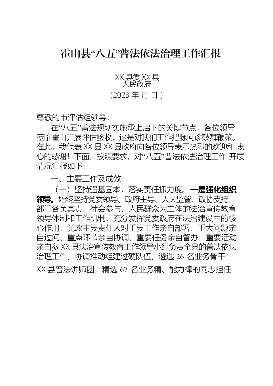 “”XX县委XX县人民政府(2023年月日)尊敬的市评估组领导:在“八五”普法规划实施承上启下的关键节点,各位领导莅临霍山开展评估验收,这是对我们工作把脉问诊鼓舞鞭策。在此,我代表XX县XX县政府向各位领导表示热烈的欢迎和衷心的感谢!下面,按照要求,对“八五”普法依法治理工作开展情况汇报如下:一、主要工作及成效(一)坚持强基固本,落实责任抓力度。一是强化组织领导。始终坚持党委领导、政府主导、人大监督、政协支持、部门各负其责、社会参与、人民群众为主体的法治宣传教育领导体制和工作机制,充分发挥党委政府在法治建设中的核心作用,党政主要责任人对重要工作亲自部署、重大问题亲自过问、重点环节亲自协调、重要任务亲自督办、重要活动亲自参XX县法治宣传教育工作领导小组负责全县的普法依法治理工作,协调推动组建过硬队伍,遴选26名业务骨干XX县普法讲师团,精选67名业务精、能力棒的同志担任72所中小学(含教学点)法治副校长,招募450名普法志愿者,充实各乡镇各单位普法联络员队伍。二是强化责任落实。进一步压紧“谁执法谁普法”“谁管理谁普法”“谁服务谁普法”责任制,构建“明责任、勤提醒、强督促、重实效”四位一体新格局,打造闭环管理新模式。每年XX县法宣办发布年度重点普法目录,明确“普什么”;制定年度普法日历,明确“何时普”;印发年度普法要点,明确“怎么普”;各责任单位制定个性清单,明确“我要普”;印发提示函和督办函指导,常态化督促重点普法工作落实落地。三是强化督查考核。把普法依法治理工作纳入法治建设总体部署,纳入党委综合考核、政府目标绩效考核,与平安建设、文明创建、乡村振兴等同部署同考XX县人XX县政协每年对重要法律法规宣传及执法情况进行视察调研,切实做到组织领导、责任落实、队伍建设、经费保障、督查问效“五落实”,切实推动普法依法治理工作规范化、制度化、经常化。(二)坚持守正创新,平台载体抓厚度。一是升级传统阵地。按XX县级阵地有规模、乡镇阵地有亮点、村及阵地全覆盖”的原则,深入实施法治文化阵地建设提升工程。充分利用现有公园广场,在原有布局和园林景观的基础上,以进行功能性改造升级,添加注入现代法治元素,构建“一地一品牌”法治文化集群。充分利用乡村人口聚集地“小、快、灵”的空间场地上,在全县144个村(社区)“农家书屋”设立“法律图书角”,把法治元素通过电子屏、宣传橱窗、小喇叭等简单便捷方式,融入到服务窗口、晨练点、候车厅、校园文化角、医院候诊厅等群众密集场所,让法治宣传教育阵地随处可见、随处能见。目前,全县共有市级法治文化示范点3XX县级法治文化示范点14处。二是创新现代载体。在巩固线下阵地的同时,推进普法宣传上线、上网、上屏。充分运用“法治霍山”手机台、微信公众号,定期推送各种法治宣传、志愿者活动、法律条文和法治案例,全方位、多角度宣传法律知识。在抖音、快手推出自编自导自演自拍民法典小视频、“未检云课堂,护苗助成长”、“释法解‘霍’”等法治云课堂栏目。开通“法治公交专线”,车身、车厢、把手均融入法治元素,车载电视循环播放法治视频,普法书籍专区定期更新宣传资料,目之所及、耳之所闻皆能受到法治理念的熏陶与洗礼。三是打造特色精品。探索“政府指导、政企共建、企业运营”的法治宣传教育基地新模式,建设面向青少年学生开展校外教育的迎驾春风营地,让广大青少年学生获得沉浸式法治教育体验,2021年6月开放以来共接待近15万余人次。积极探索法治文化与红色文化相结合的路径,讲好红色法治故事,传承红色法治基因,整理搜集红军公田碑、霍山苏维埃政府旧址等12处XX县红色法治遗址,目前数量位列全市第一。(三)坚持普治并举,对象重点抓精度。一是以创建“依法办事示范单位”为抓手,狠抓领导干部学法用法。严格落实党委(党组)中心组集体学法、政府常务会议定期学法、旁听庭审、行政机关负责人出庭应诉、领导干部年度述法等制度,突出领导干部。把宪法法律和党内法规列入党校必修课,把法治教育纳入干部教育培训总体规划,纳入国家工作人员初任培训、任职培训等的必训内容。坚持和完善国家工作人员定期法律知...