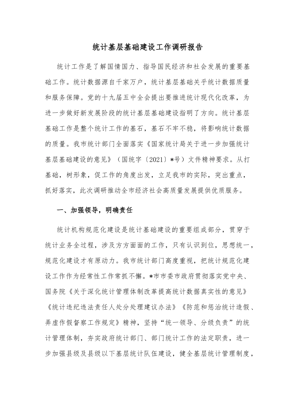 统计基层基础建设工作调研报告统计工作是了解国情国力、指导国民经济和社会发展的重要基础工作。统计数据源自千家万户,统计基层基础关乎统计数据质量和服务保障。党的十九届五中全会提出要推进统计现代化改革,为进一步做好新发展阶段的统计基层基础建设指明了方向。统计基层基础工作是整个统计工作的基石,基石不牢不稳,将影响统计数据的质量。我市统计部门全面落实《国家统计局关于进一步加强统计基层基础建设的意见》(国统字〔2021〕*号)文件精神要求。从打基础,树形象,促工作的角度出发,立足我市的实际,突出重点,抓好落实,此次调研推动全市经济社会高质量发展提供优质服务。一、加强领导,明确责任统计机构规范化建设是统计基础建设的重要组成部分,贯穿于统计业务全过程,涉及方方面面的工作,只有认识到位,思想统一,规范化建设才有原动力。我市统计部门高度重视,把统计规范化建设工作作为经常性工作常抓不懈。*市市委市政府贯彻落实党中央、国务院《关于深化统计管理体制改革提高统计数据真实性的意见》《统计违纪违法责任人处分处理建议办法》《防范和惩治统计造假、弄虚作假督察工作规定》精神,坚持“统一领导、分级负责”的统计管理体制,夯实政府统计部门、部门统计工作的法定职责,进一步加强县级及县级以下基层统计队伍建设,健全基层统计管理制度,完善基层统计业务规范,提升基层统计信息化水平,强化基层统计保障条件,为推进统计现代化改革提供强有力的基础支撑。为加强对统计基础规范化建设的组织领导,我局专门成立了统计规范化建设领导小组,由局一把手负总责,分管局长直接抓,专业科室具体抓,形成了统一协调、分工协作、条块结合、整体推进、齐抓共管的局面。二、建立制度、制定实施方案结合我市实际,建立健全各项工作制度、制定统计基层基础建设工作实施方案,要准确把握统计基层基础建设工作的任务和重点,明确各阶段工作任务,完成时间结点,切实解决统计基层基础建设中存在的短板和弱项。市委、政府高度重视统计工作,为进一步加强部门统计和企业统计工作的规范化、法制化、科学化建设,进一步调动部门和企业统计工作积极性,提高部门和企业统计工作水平,促进政府综合统计与政府部门统计和企业统计之间的协调与合作,确保全市部门统计和企业统计依法统计,提高统计数据质量,为全市经济社会发展提供良好的统计服务保障。要求全市各乡镇(街道、农场)和市直各单位必须明确一名专兼职统计人员,负责做好与市统计局统计数据对接上报工作,同时要求,统计人员原则上一年内不得进行更换。统计人员的保障,为统计工作的更好开展奠定了坚实基础。三、加快统计信息化建设,提升统计工作科学性统计机构规范化建设贯穿于统计业务全过程,纵向到底,横向到边,涉及方方面面的工作,只有认识到位,思想统一,规范化建设才有原动力。为此,统计部门高度重视,把统计规范化建设工作作为经常性工作常抓不懈。积极配合省统计局开展统计规范化建设工作。为巩固拓展统计“基层基础”建设,顺应“大数据”时代潮流,全面提升统计信息化工作水平,夯实统计信息化基础。四、加强县区基层基础工作督促指导。统计部门要强化对四县四区统计基层基础建设工作的督促指导,重点加强县、区、乡镇级以下统计基层基础建设,及时掌握日常工作进展情况,做到制度不虚设、数据有来源、建立健全统计台帐、数据审核评估、依法统计,加强统计基层基础建设,进一步提高统计数据质量,确保各项工作全面落实。五、基层统计存在的主要问题通过此次全市统计调查基础工作调研,基层统计总体情况良好,基层党政领导对统计工作的重视程度有所提高,基层统计人员的工作条件有所改善,但仍然存在一些不容忽视的问题:1.关于提高统计服务能力的问题。由于目前主要社会经济指标都实行了下算下管一级,在提高统计服务能力的问题上,上级为下级服务,数据反馈的及时性成了基层统计的棘手问题,使统计服务工作十分被动。建议以后在数据反馈上再及时一些,有利于提高统计服务的及时性、有效性和公信力。2.统计队伍人员不稳定,变动频繁。统计队伍人员不稳定,变动频繁。我市友谊县兴隆镇、龙...
