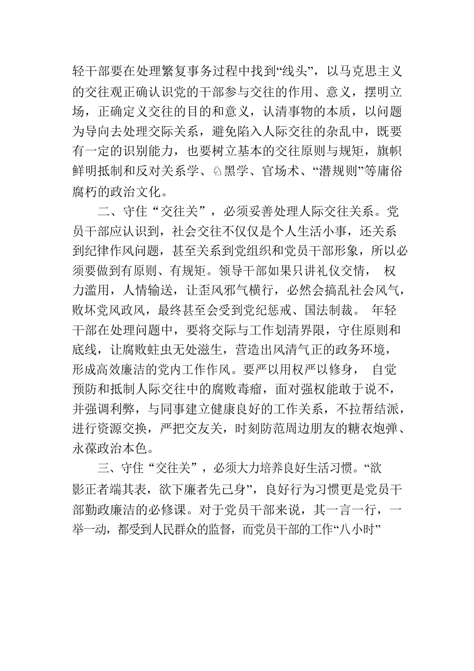 ”“中华民族的伟大复兴,关键在党,关键在人,归根到底在培养造就一代又一代可靠接班人。习近平总书记高度关注年轻干部的成长成才,叮嘱他们“守住交往关,交往必须有原则、有规矩,不断净化社交圈、生活圈、朋友圈”。为广大年轻干部正确对待社会交往注入了政治免疫力,帮助年轻干部在未来工作交往中找准定力,抵御诱惑。新征程上,党员干部一定要严格交友的原则,慎交友、交好友,哪些人该交,哪些人不该交,应该心中有杆秤。要守住守牢拒腐防变防线,就必须守住守牢交往关,交往必须有原则、有规矩,不断净化社交圈、生活圈、朋友圈。一、守住“交往关”,必须牢固树立正确价值观。关于交往,古人早已有“君子淡以亲,小人甘以绝”的交往之道,也有“人生结交在终始,莫为升沉中路分”的交往之则,更有“钟子期死,伯牙破琴绝弦”的交往佳话。新时代我们党《关于新形势下党内政治生活的若干准则》对党员干部交往也提出了明确要求,“必须坚决抵制潜规则,自觉净化社交圈、生活圈、朋友圈,决不能把商品交换那一套搬到党内政治生活和工作中来”。青年干部应择善而交,时刻净化交往圈,守住交往关。在市场经济的大环境中,广大党员干部肩负着发展经济,造福人民的重任,必定处在纷繁复杂的交往之中。年轻干部要在处理繁复事务过程中找到“线头”,以马克思主义的交往观正确认识党的干部参与交往的作用、意义,摆明立场,正确定义交往的目的和意义,认清事物的本质,以问题为导向去处理交际关系,避免陷入人际交往的杂乱中,既要有一定的识别能力,也要树立基本的交往原则与规矩,旗帜鲜明抵制和反对关系学、♘黑学、官场术、“潜规则”等庸俗腐朽的政治文化。二、守住“交往关”,必须妥善处理人际交往关系。党员干部应认识到,社会交往不仅仅是个人生活小事,还关系到纪律作风问题,甚至关系到党组织和党员干部形象,所以必须要做到有原则、有规矩。领导干部如果只讲礼仪交情,权力滥用,人情输送,让歪风邪气横行,必然会搞乱社会风气,败坏党风政风,最终甚至会受到党纪惩戒、国法制裁。年轻干部在处理问题中,要将交际与工作划清界限,守住原则和底线,让腐败蛀虫无处滋生,营造出风清气正的政务环境,形成高效廉洁的党内工作作风。要严以用权严以修身,自觉预防和抵制人际交往中的腐败毒瘤,面对强权能敢于说不,并强调利弊,与同事建立健康良好的工作关系,不拉帮结派,进行资源交换,严把交友关,时刻防范周边朋友的糖衣炮弹、永葆政治本色。三、守住“交往关”,必须大力培养良好生活习惯。“欲影正者端其表,欲下廉者先己身”,良好行为习惯更是党员干部勤政廉洁的必修课。对于党员干部来说,其一言一行,一举一动,都受到人民群众的监督,而党员干部的工作“八小时”外,是最容易滋生腐败的“多发时段”,干部是否能够公私分明,严以修身,严把自己的朋友圈,生活圈和社交圈,对干部自身的成长和发展都是至关重要的。因此,年轻干部在工作之余,要多学习多充电,消化党和组织发布的政策文件,向群众多讲解党的惠民政策,调查了解民情民意,下决心减少应酬,自觉遵守服从党员干部八小时之外的监督工作,抵制庸俗的人际交往,保持健康的工作方式和生活方式。要自觉抵制庸俗、消极的生活方式,面对奢靡之风、拜金主义之风等不良作风习惯,要克制自己,严守党纪法规。严防盲目跟风,禁止互相攀比,清除消极腐败行为产生的雾霾,净化干部政治环境,营造良好工作作风人人学的氛围。不能守寸心,安能胜苍穹。面对形形色色的诱惑,党员干部只有严格自律、心存敬畏,坚持公正用权、谨慎用权、依法用权,坚持交往有原则、有界限、有规矩,方能时刻保持清醒,让“围猎”者无从下手。