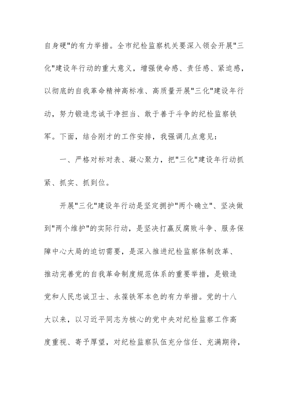 在纪检监察工作规范化法治化正规化建设年行动动员部署会议上的讲话提纲公文同志们:刚才,组织学习了中央纪委国家监委,以及省纪委纪检监察工作规范化法治化正规化建设年行动动员部署会议精神,也对我市相关工作作了安排部署。开展"三化"建设年行动,是深入贯彻落实习近平总书记和党中央重要要求,坚定拥护"两个确立"、坚决做到"两个维护"的具体体现;是推进新征程纪检监察工作高质量发展,打好反腐败斗争攻坚战持久战总体战的迫切需要;是进一步深化纪检监察体制改革,推动完善党的自我革命制度规范体系的重要途径;是有效解决当前自身建设存在的突出问题,做到"打铁必须自身硬"的有力举措。全市纪检监察机关要深入领会开展"三化"建设年行动的重大意义,增强使命感、责任感、紧迫感,以彻底的自我革命精神高标准、高质量开展"三化"建设年行动,努力锻造忠诚干净担当、敢于善于斗争的纪检监察铁军。下面,结合刚才的工作安排,我强调几点意见:一、严格对标对表、凝心聚力,把"三化"建设年行动抓紧、抓实、抓到位。开展"三化"建设年行动是坚定拥护"两个确立"、坚决做到"两个维护"的实际行动,是坚决打赢反腐败斗争、服务保障中心大局的迫切需要,是深入推进纪检监察体制改革、推动完善党的自我革命制度规范体系的重要举措,是锻造党和人民忠诚卫士、永葆铁军本色的有力举措。党的十八大以来,以习近平同志为核心的党中央对纪检监察工作高度重视、寄予厚望,对纪检监察队伍充分信任、充满期待,提出一系列重要要求,为加强纪检监察机关自身建设提供了根本遵循。全市纪检监察机关要提高政治站位,深刻认识开展"三化"建设年行动的重大意义,从政治上看、从政治上抓,以高度的责任感使命感抓紧抓实、抓出成效。首先,开展"三化"建设年行动成效,要体现在坚决打好反腐败斗争攻坚战、持久战、总体战上。纪检监察机关是开展反腐败斗争的专门力量,使命光荣、责任重大,新的形势任务对纪检监察干部队伍的政治能力、政策水平、纪法素养都提出了更高要求。要以开展"三化"建设年行动为契机,进一步提高正风肃纪反腐能力、依规依纪依法履职水平,一体推进不敢腐、不能腐、不想腐,坚决打赢反腐败这场输不起也决不能输的重大斗争。其次,开展"三化"建设年行动成效,要体现在推动完善党的自我革命制度规范体系上。推进党的纪律检查体制改革、国家监察体制改革,是以习近平同志为核心的党中央作出的重大决策部署。要通过"三化"建设年行动,进一步深化纪检监察体制改革,不断健全科学严密、系统完备的纪检监察法规制度体系,推动完善党和国家监督体系,使党的自我革命制度规范体系内容更加全面、程序更加严密、执行更加有效。第三,开展"三化"建设年行动成效,要体现在打造忠诚干净担当、敢于善于斗争纪检监察铁军上。习近平总书记多次强调,纪检监察机关要努力做自我革命的表率、遵规守纪的标杆。开展"三化"建设年行动,就是要刀刃向内、自我革命,进一步加强政治建设、能力建设、作风建设、廉洁建设,坚决清除害群之马,着力解决突出问题,确保党和人民赋予的权力不被滥用、惩恶扬善的利剑永不蒙尘。二、聚焦重点、精准发力,全面提升纪检监察工作规范化法治化正规化水平高标准高质量开展好"三化"建设年行动,必须聚焦重点抓、盯着问题改,举措精准务实,防止泛化笼统,以关键问题突破带动"三化"水平整体提升。"三化"建设涉及纪检监察工作方方面面,是一项系统工程。其中,规范化是基础,要求构建标准统一的工作制度体系,确保监督执纪执法全链条有规可依、有章可循;法治化是关键,强调纪检监察机构、职能、权限、责任法定化,依规依纪依法履职用权;正规化是根本,要求推动纪检监察组织建设全面过硬,干部素质全面提升,监督约束机制逐步健全。三者各有侧重、相辅相成。加强"三化"建设,既要系统推进也要重点突破。要正视我市纪检监察工作"三化"建设短板弱项,聚焦重点抓、盯住问题改,推动"三化"建设水平整体提升。首先,抓住办案这个重中之重。办案是最有力的监督,也是"三化"建设的重中之重。越是形势严峻复杂、任务艰巨繁重,越要坚持高质量办案,不断提升依规依纪依法办案质效,把全面从严...