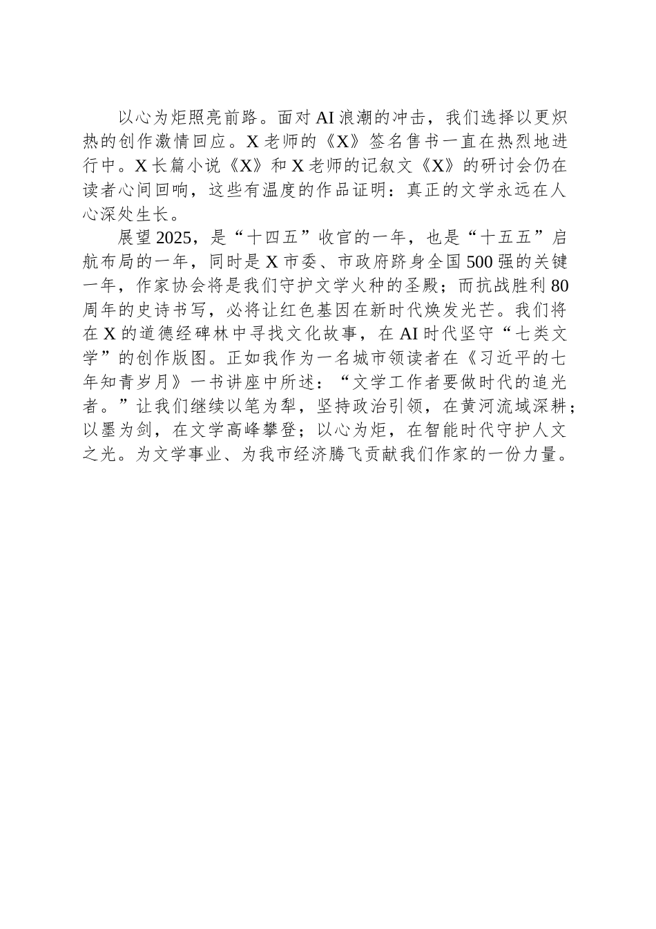 市作家协会主席在2025年市文联工作会议上的发言尊敬的杜部长、X部长、X主席、各位领导、兄弟协会大家好!笔耕函谷千重嶂,墨涌黄河万里涛。在市委宣传部意识形态的引领下,在市文联的正确领导下,此时此刻我的指尖仍能触摸到《X》油墨的温度。这温度来自2024年三百多个日夜的笔耕不辍,来自X的晨雾浸润过的纸张,来自小秦岭深处采风时沾满泥土的笔记本。X作家群体用文字丈量时光,让每一个方块字都成为穿透岁月的星光。以笔为犁深耕热土。我们到X、X、X研学基地创作的作品印证了:真正的文学永远扎根大地。2024年12次深入基层采风,386篇沾着泥土芬芳的作品,11个创作基地里晾晒的草稿纸,都是作家们与脚下土地的血脉相连。我们为一线工人记录过凌晨三点的霜花,在采摘园聆听过果实爆浆的轻响,这些鲜活的细节,是AI永远无法复制的生命质感。以墨为剑问鼎高峰。X老师、X老师、X老师X老师、X老师、X老师、X老师、X老师、X老师、X老师、X老师、X老师等等在黄河交响曲中夺冠,还有以X、X、X等为代表的新一代年轻人的崭露头角,更加说明这些奖项背后是作家们对黄河文明基因的破译。更令人振奋的是,在安吉“和文化”全球大赛和昆明文学大赛中,我们的文字让青山绿水、金山银山的哲思跨越山海。这些奖杯的重量,实则是X作家群体对文学初心的坚守——当44位会员在各级赛事中摘金夺银,当3000余篇作品化作铅字,我们正在用方块字构筑属于新时代的文学长城。以心为炬照亮前路。面对AI浪潮的冲击,我们选择以更炽热的创作激情回应。X老师的《X》签名售书一直在热烈地进行中。X长篇小说《X》和X老师的记叙文《X》的研讨会仍在读者心间回响,这些有温度的作品证明:真正的文学永远在人心深处生长。展望2025,是“十四五”收官的一年,也是“十五五”启航布局的一年,同时是X市委、市政府跻身全国500强的关键一年,作家协会将是我们守护文学火种的圣殿;而抗战胜利80周年的史诗书写,必将让红色基因在新时代焕发光芒。我们将在X的道德经碑林中寻找文化故事,在AI时代坚守“七类文学”的创作版图。正如我作为一名城市领读者在《习近平的七年知青岁月》一书讲座中所述:“文学工作者要做时代的追光者。”让我们继续以笔为犁,坚持政治引领,在黄河流域深耕;以墨为剑,在文学高峰攀登;以心为炬,在智能时代守护人文之光。为文学事业、为我市经济腾飞贡献我们作家的一份力量。公文范文文库网站①【公文堂】:www.gongwentang.com公文范文文库网站②【公文堂】:www.gongwentang.com请各位用户务必收藏好以上两个网站,收藏好网址,终身可访问或下载全站公文范文客服微信:gongwentangkf微信公众号:【公文堂】