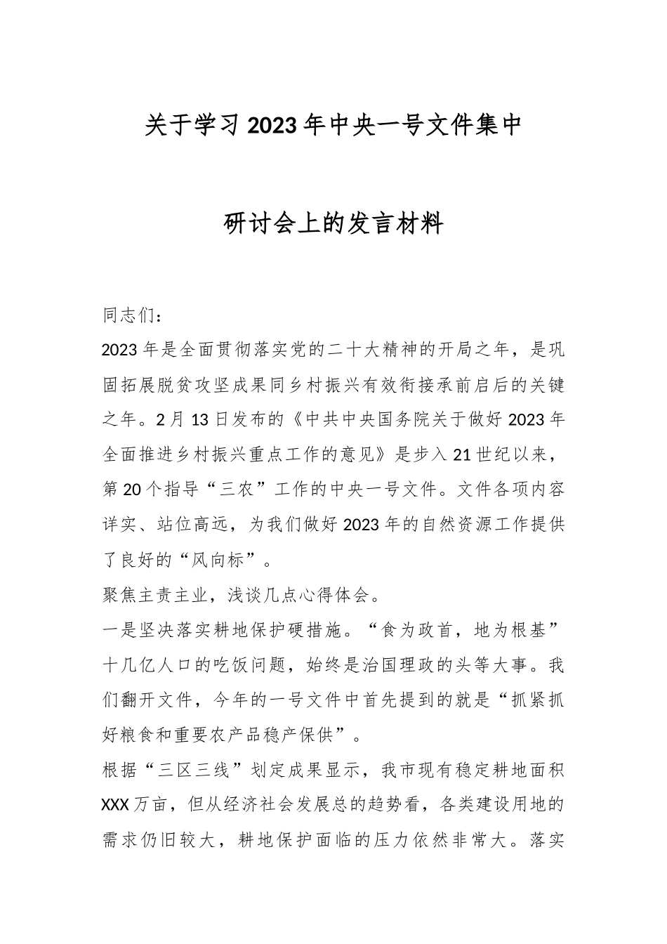 关于学习2023年中央一号文件集中研讨会上的发言材料同志们:2023年是全面贯彻落实党的二十大精神的开局之年,是巩固拓展脱贫攻坚成果同乡村振兴有效衔接承前启后的关键之年。2月13日发布的《中共中央国务院关于做好2023年全面推进乡村振兴重点工作的意见》是步入21世纪以来,第20个指导“三农”工作的中央一号文件。文件各项内容详实、站位高远,为我们做好2023年的自然资源工作提供了良好的“风向标”。聚焦主责主业,浅谈几点心得体会。一是坚决落实耕地保护硬措施。“食为政首,地为根基”十几亿人口的吃饭问题,始终是治国理政的头等大事。我们翻开文件,今年的一号文件中首先提到的就是“抓紧抓好粮食和重要农产品稳产保供”。根据“三区三线”划定成果显示,我市现有稳定耕地面积XXX万亩,但从经济社会发展总的趋势看,各类建设用地的需求仍旧较大,耕地保护面临的压力依然非常大。落实“长牙齿”的硬措施,我们必须要与各县(区)签订耕地保护目标责任状,将耕地和永久基本农田保护任务带位置分解下达。制定耕地保护责任目标考核方案,优化细化考核指标体系,充分发挥考核指挥棒作用,压实县(区)耕地保护主体责任。要坚持实行严格考核、重大问题一票否、终身追责,扛稳耕地“三位一体”保护的政治责任,全方位夯实粮食安全根基。必须加强用途管制,严控耕地“非农化”“非粮化”。进一步加强项目用地选址指导和预审,进一步做好拟建项目选址、用地规模、占地类型、补充耕地方案、征地补偿等内容的审查,指导建设项目选址尽量避让或减少占用耕地和基本农田。确需占用的,必须严格落实“占补平衡”,确保“占一补一、占优补优、占水田补水田”同时,全力推进土地综合整治,确保可以长期稳定利用的耕地不减少。二是强化国土空间规划引领和保障作用。习近平总书记强调“实施乡村振兴战略要坚持规划先行、有序推进,做到注重质量、从容建设”,要“通盘考虑土地利用、产业发展、居民点布局、人居环境整治、生态保护和历史文化传承,编制‘多规合一’的实用性村庄规划”。坚持村庄规划引领,我们要做到发展有遵循、建设有依据,确保乡村振兴始终沿着正确的方向发展。要强化农村产业发展规划与国土空间规划衔接,尊重农村产业发展规律,全面考虑乡村资源、乡村功能和产业特色、基础设施配套、生态环境保护等多方面因素,全域系统性谋划。要坚持整合利用农村各类资源,合理安排农产品加工流通、农村休闲观光旅游、电子商务等农村产业,优化农村一二三产业布局,科学编制符合现代乡村产业体系的农村产业发展规划,因地制宜提出本地区的农村产业发展目标、功能结构、空间布局和空间需求、设施规模等具体内容。要主动结合农村产业发展规划,经国土空间规划统筹平衡后予以用地空间保障。三是坚持增强农村产业用地保障能力。要积极向上争取将我市纳入集体经营性建设用地入市试点范围,探索在农民集体依法妥善处理原有用地相关权利人的利益关系后,将符合规划的存量集体建设用地,按照农村集体经营性建设用地入市交易。在符合国土空间规划前提下,鼓励对依法登记的宅基地等农村建设用地进行复合利用,发展乡村民宿、农产品初加工、电子商务等农村产业。鼓励各区结合实际制定分业分类的农村低效用地判定标准和激励机制,加大低效用地节约挖潜,推进低效用地减量化,促进产业转型升级、提质增效。四是强乡村振兴产业发展活力。乡村振兴战略的20字总要求中,首先一条就是“产业兴旺”。发展设施农业是推动乡村产业振兴的重要抓手,是助推农业基础设施现代化迈上新台阶的重要举措。推进设施农业产业发展,空间保障是重中之重。我们要聚焦主责主业,进一步优化设施农业用地管理,强调要科学引导设施建设合理选址。依据国土空间规划或土地利用总体规划、农业发展规划、村庄规划在保护耕地和合理利用土地的前提下,用好自然资源、农业、林业等各类政策,按照设施建设方案,综合施策,合理确定设施建设用地位置、范围。同时,应尽量利用荒山荒坡等未利用地和农村集体建设用地,尽量避免占用坝区耕地。我就讲这么多。谢谢!