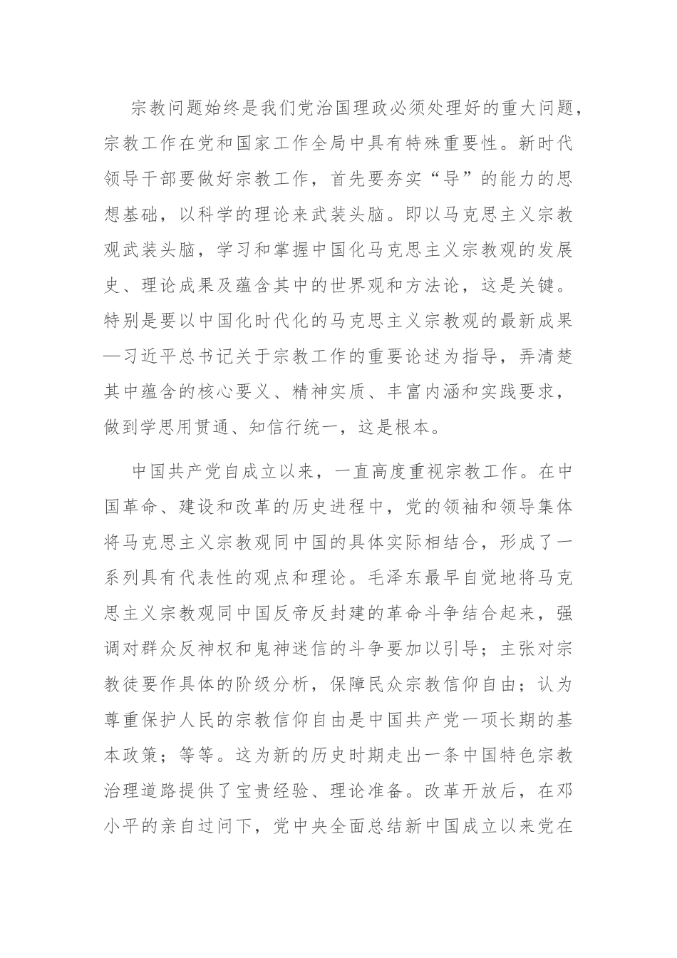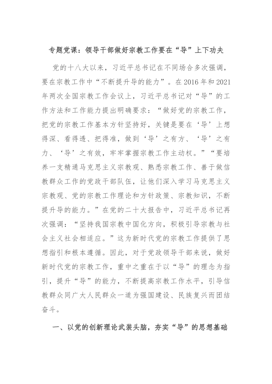 专题党课:领导干部做好宗教工作要在“导”上下功夫党的十八大以来,习近平总书记在不同场合多次强调,要在宗教工作中“不断提升导的能力”。在2016年和2021年两次全国宗教工作会议上,习近平总书记对“导”的工作方法和工作能力提出明确要求:“做好党的宗教工作,把党的宗教工作基本方针坚持好,关键是要在‘导’上想得深、看得透、把得准,做到‘导’之有方、‘导’之有力、‘导’之有效,牢牢掌握宗教工作主动权。”“要培养一支精通马克思主义宗教观、熟悉宗教工作、善于做信教群众工作的党政干部队伍,让他们深入学习马克思主义宗教观、党的宗教工作理论和方针政策、宗教知识,不断提升导的能力。”在党的二十大报告中,习近平总书记再次强调:“坚持我国宗教中国化方向,积极引导宗教与社会主义社会相适应。”这为新时代党的宗教工作提供了思想指引和根本遵循。因此,对于党政领导干部来说,做好新时代党的宗教工作,重中之重在于以“导”的理念为指引,提升“导”的能力,不断提高宗教工作水平,引导信教群众同广大人民群众一道为强国建设、民族复兴而团结奋斗。一、以党的创新理论武装头脑,夯实“导”的思想基础宗教问题始终是我们党治国理政必须处理好的重大问题,宗教工作在党和国家工作全局中具有特殊重要性。新时代领导干部要做好宗教工作,首先要夯实“导”的能力的思想基础,以科学的理论来武装头脑。即以马克思主义宗教观武装头脑,学习和掌握中国化马克思主义宗教观的发展史、理论成果及蕴含其中的世界观和方法论,这是关键。特别是要以中国化时代化的马克思主义宗教观的最新成果—习近平总书记关于宗教工作的重要论述为指导,弄清楚其中蕴含的核心要义、精神实质、丰富内涵和实践要求,做到学思用贯通、知信行统一,这是根本。中国共产党自成立以来,一直高度重视宗教工作。在中国革命、建设和改革的历史进程中,党的领袖和领导集体将马克思主义宗教观同中国的具体实际相结合,形成了一系列具有代表性的观点和理论。毛泽东最早自觉地将马克思主义宗教观同中国反帝反封建的革命斗争结合起来,强调对群众反神权和鬼神迷信的斗争要加以引导;主张对宗教徒要作具体的阶级分析,保障民众宗教信仰自由;认为尊重保护人民的宗教信仰自由是中国共产党一项长期的基本政策;等等。这为新的历史时期走出一条中国特色宗教治理道路提供了宝贵经验、理论准备。改革开放后,在邓小平的亲自过问下,党中央全面总结新中国成立以来党在宗教工作方面的理论和实践正反两个方面的历史经验,出台《关于我国社会主义时期宗教问题的基本观点和基本政策》,标志着我们党的宗教观恢复到正常的轨道,并提出了诸多创新性的观点。党的十三届四中全会后,江泽民高度重视宗教问题,提出了社会主义时期宗教问题的基本特点是长期性、群众性和特殊的复杂性;肯定了宗教的文化价值;正式提出积极引导宗教与社会主义相适应的重大命题;等等。党的十六大以来,胡锦涛继续推进中国化马克思主义宗教观的发展,提出宗教关系是事关党和国家全局的重大社会关系,要全面贯彻党的宗教工作基本方针;在构建和谐社会的过程中,要发挥宗教在促进社会和谐方面的作用;强调从政治、社会、文化层面进一步积极引导宗教与社会主义相适应;等等。回顾马克思主义宗教观中国化的历史,我们能够清晰地发现,中国共产党是马克思主义宗教观中国化的主体,一部马克思主义宗教观中国化的历史,就是一部中国共产党人以马克思主义宗教观为指导结合中国革命、建设和改革中所遭遇到的宗教问题的具体实际,坚持丰富、发展马克思主义宗教观的历史过程,也是让马克思主义宗教观成为“中国”的和“当代”的历史过程。对于领导干部来说,熟悉和认知上述历史并掌握其所蕴含的时代背景、思想观点、方法论原则等,构成夯实“导”的能力思想基础的首要维度。马克思主义宗教观中国化的历史进程表明,马克思主义宗教观不是静止的,而是随着时代的变革和社会主要矛盾的变化而不断丰富完善并实现理论飞跃的。党的十八大以来,以习近平同志为主要代表的中国共产党人,坚持把马克思主义基本原理同中国具体实际相结合、同中华优秀传统文化相结合,...