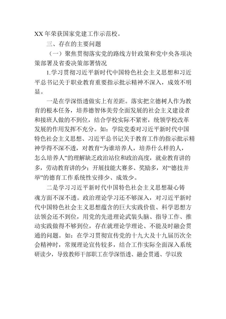 为进一步贯彻落实习近平总书记关于巡视工作的重要论述,深化对新时代巡视巡察工作内涵要求的理解把握,以高质量巡察推动全面从严治党向纵深发展。根据省委巡察工作统一部署,我院坚持以习近平新时代社会主义思想为指导,深入贯彻落实巡视工作方针和省委巡察工作要求,围绕“三个聚焦”,从严从实开展全面自查。现将自查情况报告如下。一、基本情况学院始建于X年,其前身是原XX职工大学,X年X月经XX省人民政府批准更名为XXX职业大学,X年X月经XX省人民政府同意设立XX职业技术学院。学校占地X亩,建筑面积X万平方米,图书馆藏书X万册。现有教职工X人,其中专任教师X人,高级职称教师占专任教师的X%,双师型教师占专任教师的X%,硕士以上学历教师占专任教师的X%。全校共有X个教学系部,X个教学班级,在校学生X人。学院党委由X人组成,书记X人,副书记X人,党委委员X人。院党委下设X个党总支,现有党员X人。学校实行校系两级管理,设置党政办、组织部、宣传部、学生处、教务处、总务处、计财处等X个职能部门和X个教辅部门。学校主要办学形式是以全日制高等职业教育、技工教育、国家开放教育、各类职业培训与鉴定等为主的公立综合类职业院校和高技能人才培训基地。职业教育开设有畜牧兽医、机电技术应用、机械设备装配与自动控制、学前教育、旅游管理等X个与当地支柱产业紧密结合的专业;国家开放教育开设有工商管理、法学、机电一体化等X个本(专)科专业。二、主要成效近四年来,我院坚持把专业建在产业链上,极大提升了专业对区域产业发展的贡献度,服务区域产业的能力大幅提高;深化工学结合、政校企合作,X年在XX集团挂牌XX学院XX分院,X年在XX开发区挂牌XX学院XX分院;学院新增设X个专业,成功申报X个省优质专业和X个国家品牌专业;圆满承办XX第一届职业技能大赛,分获一等奖X个,二等奖X个,三等奖X个,获奖率位居全省各代表队前列,被评为XXX第一届职业技能大赛突出贡献单位;招生工作位居全省同类学校前列;毕业生就业率始终保持在X%以上,用人单位满意度高达X%以上;为社会累计输送毕业生达X余人,社会化培训鉴定达X余人次。我院服务区域产业转型升级、服务地方经济高质量发展的能力得到大幅度提升。学院先后荣获首批国家职业教育改革发展示范校、国家现代学徒制试点单位、全国电大系统优秀教务管理先进单位、全国职业教育先进单位、国家高技能人才培训基地等多项殊荣。X年被教育部列为第二批“1+X”证书制度试点院校,X年被列为首批国家优质高等职业学校建设单位,同时遴选为第X届世界技能大赛XX服务项目中国集训基地,XX年荣获国家党建工作示范校。三、存在的主要问题(一)聚焦贯彻落实党的路线方针政策和党中央各项决策部署及省委决策部署情况1.学习贯彻习近平新时代中国特色社会主义思想和习近平总书记关于职业教育重要指示批示精神不深入,成效不明显。一是在学深悟透做实上有差距。落实把立德树人作为教育的根本任务,培养德智体美劳全面发展的社会主义建设者和接班人做的不到位,结合学校实际不紧密,统领学校改革发展的作用发挥不充分。如:学院党委对习近平新时代中国特色社会主义思想、习近平总书记关于教育工作的指示批示精神学得不深不透,对教育“为谁培养人,培养什么样的人,怎么培养人”的理解缺乏政治站位和政治高度,就业教育讲的多,劳动教育讲的少;开展技能大赛多、奖励多,对“德技并举”的德育工作系统性安排少、成效少。二是学习习近平新时代中国特色社会主义思想凝心铸魂方面不深不透。政治理论学习还不够深入,对习近平新时代中国特色社会主义思想蕴含的巨大实践价值、科学思想方法领会还不到位,用党的先进理论武装头脑、指导工作、推动实践做得不够到位,存在就理论学理论、不能及时融会贯通的问题。如:在学习贯彻宣传党的十九大及十九届历次全会精神时,常规理论宣传较多,结合工作实际全面深入系统研读少,导致教师干部职工在学深悟透、融会贯通、学以致用效果不佳,将政策理论转化为推进工作举措较少。2.贯彻落实党中央重大决策部署和省委决策部署及落实职业教育高质量发展不到位,还有差距。一是意识形态工作责任制落实不到位。班子...