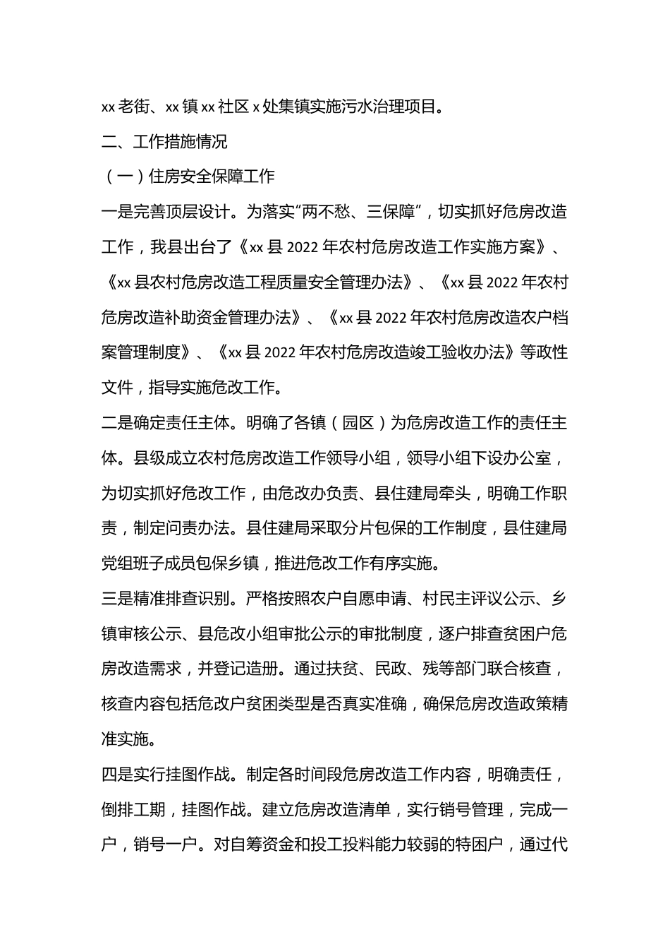 (住建领域)2022年巩固拓展脱贫攻坚住房保障成果工作总结汇编(5篇)目录1.住建局2022年巩固拓展脱贫攻坚成果同乡村振兴有效衔接工作开展情况报告22.住建局2022年巩固拓展脱贫攻坚成果后评估工作情况汇报63.住建局2022年巩固拓展脱贫攻坚成果同乡村振兴有效衔接工作总结124.住建局2022年度巩固拓展脱贫攻坚成果工作总结155.住建局2022年巩固拓展脱贫攻坚住房保障成果工作总结18住建局2022年巩固拓展脱贫攻坚成果同乡村振兴有效衔接工作开展情况报告一、任务完成情况(一)牵头实施住房安全保障工作。在脱贫攻坚和乡村振兴有效衔接时期,我局主要承担农村低收入群体基本住房保障工作。为做好住房保障工作,我局建立就爱你全农村脱贫人口住房安全动态监测机制,2022年度,省市下达我县xxx户农村危房改造任务。经摸排、审核、确认我县共完成农村危房改造项目xxx户,拨付资金xxx.x万元。(二)协助实施农村环境提升行动。主要针对乡镇建成区污水处理设施建设,我县基本实现全县xx个镇、园区(xx镇、xx镇、xx镇、xx镇、xx镇、xx镇、xx镇)污水设施稳定运营,建设厂区场站xx个,主管网铺设约xx公里、支管网铺设约xxx公里。2022年继续对xx镇xx老街、xx镇xx社区x处集镇实施污水治理项目。二、工作措施情况(一)住房安全保障工作一是完善顶层设计。为落实“两不愁、三保障”,切实抓好危房改造工作,我县出台了《xx县2022年农村危房改造工作实施方案》、《xx县农村危房改造工程质量安全管理办法》、《xx县2022年农村危房改造补助资金管理办法》、《xx县2022年农村危房改造农户档案管理制度》、《xx县2022年农村危房改造竣工验收办法》等政性文件,指导实施危改工作。二是确定责任主体。明确了各镇(园区)为危房改造工作的责任主体。县级成立农村危房改造工作领导小组,领导小组下设办公室,为切实抓好危改工作,由危改办负责、县住建局牵头,明确工作职责,制定问责办法。县住建局采取分片包保的工作制度,县住建局党组班子成员包保乡镇,推进危改工作有序实施。三是精准排查识别。严格按照农户自愿申请、村民主评议公示、乡镇审核公示、县危改小组审批公示的审批制度,逐户排查贫困户危房改造需求,并登记造册。通过扶贫、民政、残等部门联合核查,核查内容包括危改户贫困类型是否真实准确,确保危房改造政策精准实施。四是实行挂图作战。制定各时间段危房改造工作内容,明确责任,倒排工期,挂图作战。建立危房改造清单,实行销号管理,完成一户,销号一户。对自筹资金和投工投料能力较弱的特困户,通过代建、统建等措施,杜绝贫困户因缺乏自筹资金而难以实施危房改造的情况。五是强化资金管理。按照村初验、乡镇核验、县级总验、综合评价等方式,进行逐户验收。经验收合格后,补助资金由各乡镇申请,县住建等部门审核后,县财政部门直接打卡发放到危改户,保证了补助资金专款专用。(二)乡镇污水设施建设工作一是倒排工期,有序开展。依据乡镇污水处理设施建设要求,制定工作计划和任务,做到工作有计划,实施有单位,严格按照计划落实施工期限,确保乡镇污水处理设施建设工作有序开展。二是科学实施,合力推进。按照县级建主网入场、乡镇建支网入户的基本原则,我局主动协调乡镇政府针对管网建设协调施工,做好乡镇污水处理厂和配套主管网建设工作,在各乡镇政府的大力配合下,乡镇污水处理厂及配套管网建设按计划快推进。三是强化监管,稳定运营。为确保厂区正常运营,我局成立专班积极督促项目管理单位及乡镇政府,全力保障乡镇污水处理厂后期运营工作。2021年4月份已通过环保验收,各镇(园区)提质增效管网均已基本完成。三、乡村建设发展主要思路(一)以总体规划为引领,以法治建设为骨架,以经济建设为抓手,以基础设施建设为引力,以文化建设、公共事业建设为补充。乡村建设和乡村治理的关键在于村级总体规划的制定与落实,包括未来发展规划、主体经济规划、区域位置规划、村庄建设规划等多种规划制定工作,结合经济建设、基础设施建设、文化建设和公共事业建设工作发展村级经济,建设美好乡村,强化乡村治理。(二)我单位主要承担农房建设指导工作,在工作方面一是加强农...