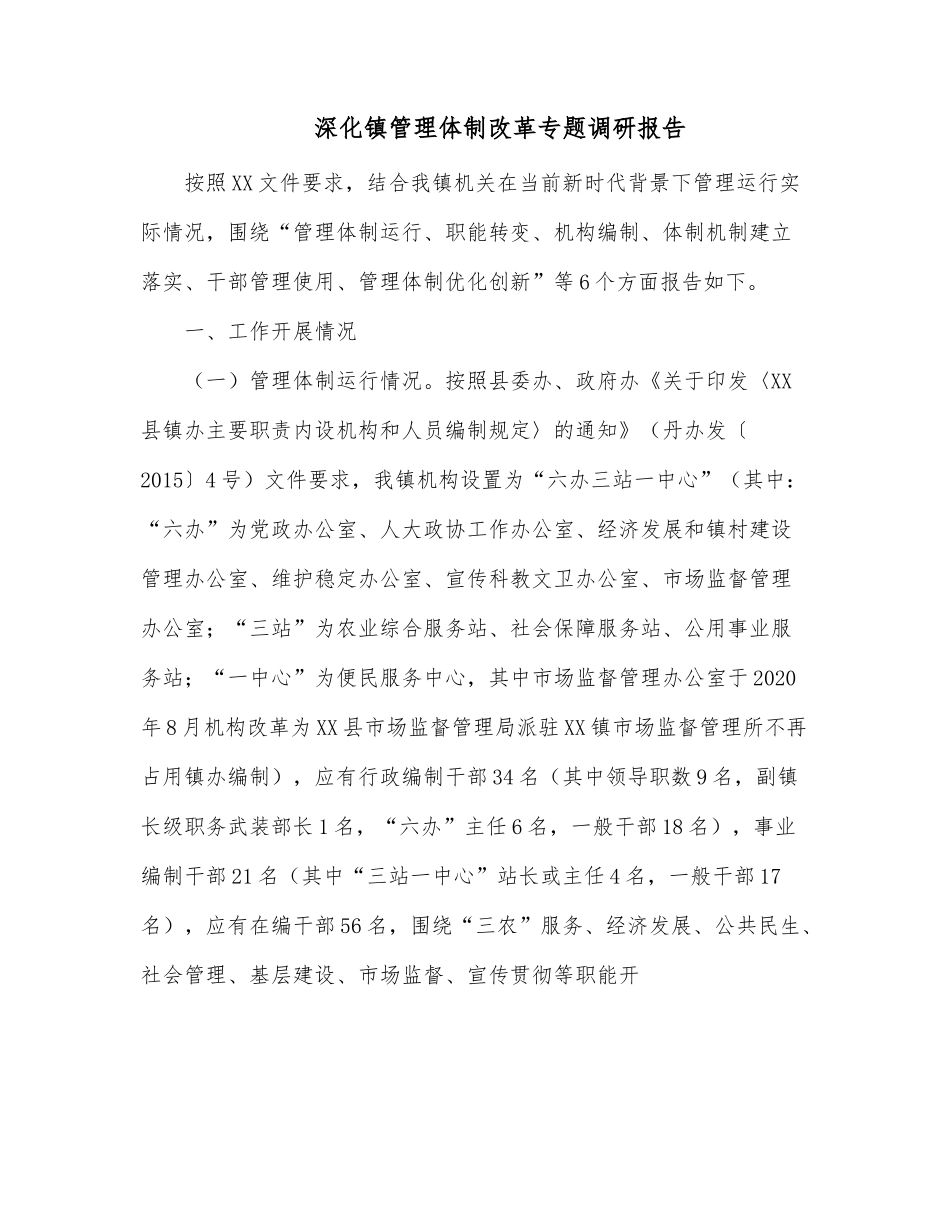 深化镇管理体制改革专题调研报告按照XX文件要求,结合我镇机关在当前新时代背景下管理运行实际情况,围绕“管理体制运行、职能转变、机构编制、体制机制建立落实、干部管理使用、管理体制优化创新”等6个方面报告如下。一、工作开展情况(一)管理体制运行情况。按照县委办、政府办《关于印发〈XX县镇办主要职责内设机构和人员编制规定〉的通知》(丹办发〔2015〕4号)文件要求,我镇机构设置为“六办三站一中心”(其中:“六办”为党政办公室、人大政协工作办公室、经济发展和镇村建设管理办公室、维护稳定办公室、宣传科教文卫办公室、市场监督管理办公室;“三站”为农业综合服务站、社会保障服务站、公用事业服务站;“一中心”为便民服务中心,其中市场监督管理办公室于2020年8月机构改革为XX县市场监督管理局派驻XX镇市场监督管理所不再占用镇办编制),应有行政编制干部34名(其中领导职数9名,副镇长级职务武装部长1名,“六办”主任6名,一般干部18名),事业编制干部21名(其中“三站一中心”站长或主任4名,一般干部17名),应有在编干部56名,围绕“三农”服务、经济发展、公共民生、社会管理、基层建设、市场监督、宣传贯彻等职能开展工作。我镇实际运行情况为,经济发展和镇村建设管理办公室、便民服务中心2个机构未挂牌但有专职干部负责日常工作,在编干部46名(其中党政班子领导10名,党政办8人,人大政协办1人、维稳办3人、经发办4人、宣教办3人、农综站6人、社保站5人、公事站3人、便民中心3人,其中市监所干部1名,财政所干部2名非占镇办编制),“三支一扶”干部3名(均为支农干部),其中在职干部33名(含“三支一扶”干部3名,在职干部实际在编30名),长期抽借调14名,长期病假2人。目前全镇日常工作运行顺畅,其中党的建设、脱贫成果巩固、产业发展、疫情防控、秦岭生态、人大、统战等工作处于全县中上游水平。(二)职能转变情况。当前全镇工作在县委、县政府坚强领导下,各项工作按照“三定”规定依法依规履职,权利与责任一致对等,日常运行认真履行“一岗双责”、党政同责要求,各项工作开展高效、廉洁、有序。财权与事权相互匹配,“三重一大”制度落实到位,凡是牵扯到大宗财政开支工作,必须经过财经及“三重一大”领导小组双重审核把关,经过镇党政班子表决通过后方可开展。县级部门授权或依法委托行政事项和有关公共服务事项全部承接到位,对于重大信访案件、刑事案件、国土规划等重要工作落实“一对一”承接责任制,保证上级交办任务落实落地并见实效。(三)机构编制情况。当前全镇机构设置、编制调整、设岗定制、领导职数配置均能保障履职所需,党委与县级相关部门的体制机制运行顺畅。但存在一是上级单位抽借调人数过多,且抽调人数大多为中青年业务骨干干部,致使在职干部承担职责多,存在身兼数职、一岗多责等情况;二是部分派驻机构工作配合不力,县国土局派驻XX镇国土所原所长于2021年12月年满退休,2021年度新招录国土所干部被县国土所抽调至包抓村任驻村工作队员,致使2022年度国土所工作由镇办其他干部承担;县财政局派驻XX镇财政所配备的2名干部以“年级大不会电脑,业务不熟”等原因不承担日常出纳、会计等工作,致使全镇财政工作由镇政府指派2名有资质的一般干部承担等问题(四)体制机制建立落实情况。XX镇高度重视体制机制建立落实工作,自2017年至今每年均在年初修订并完善《XX镇管理制度汇编》,对于日常管理、行政执法、便民服务事项办理、民生保障、精文减会、“三项机制”等工作结合实际运行情况进行修订完善,目前全镇体制机制建立完善,运行规范有序。(五)干部管理使用情况。目前,我镇不存在干部混岗、不满最低服务期限人员逆向流动、超编或超结构进人、人岗不相配、人才招录引进难等问题。建议县级单位一要注重乡镇干部业务培养,定期组织相关业务干部开展岗位相关技能集中培训,并且注重与乡镇干部沟通,对于工作指导尽量避免发文了之的现象;二要加大乡镇干部的关心关爱力度,对于抽借调人员到期后要及时返还乡镇,杜绝出现“借而不调”、长期无理由占用等现象,适时建立“乡镇干部家属茶话会”、乡镇干部重大疾病...