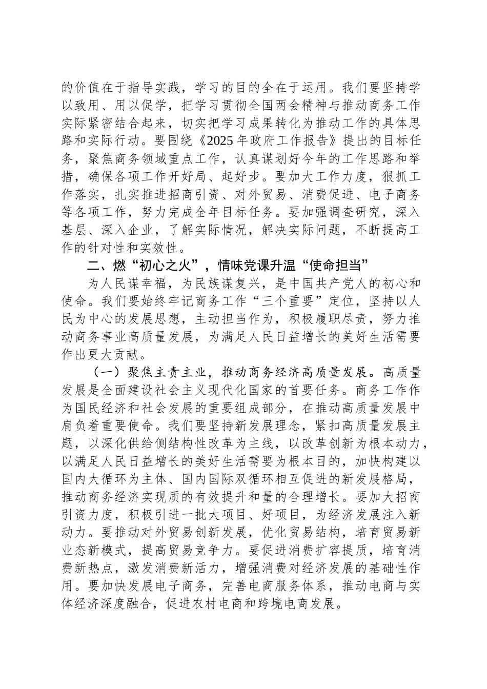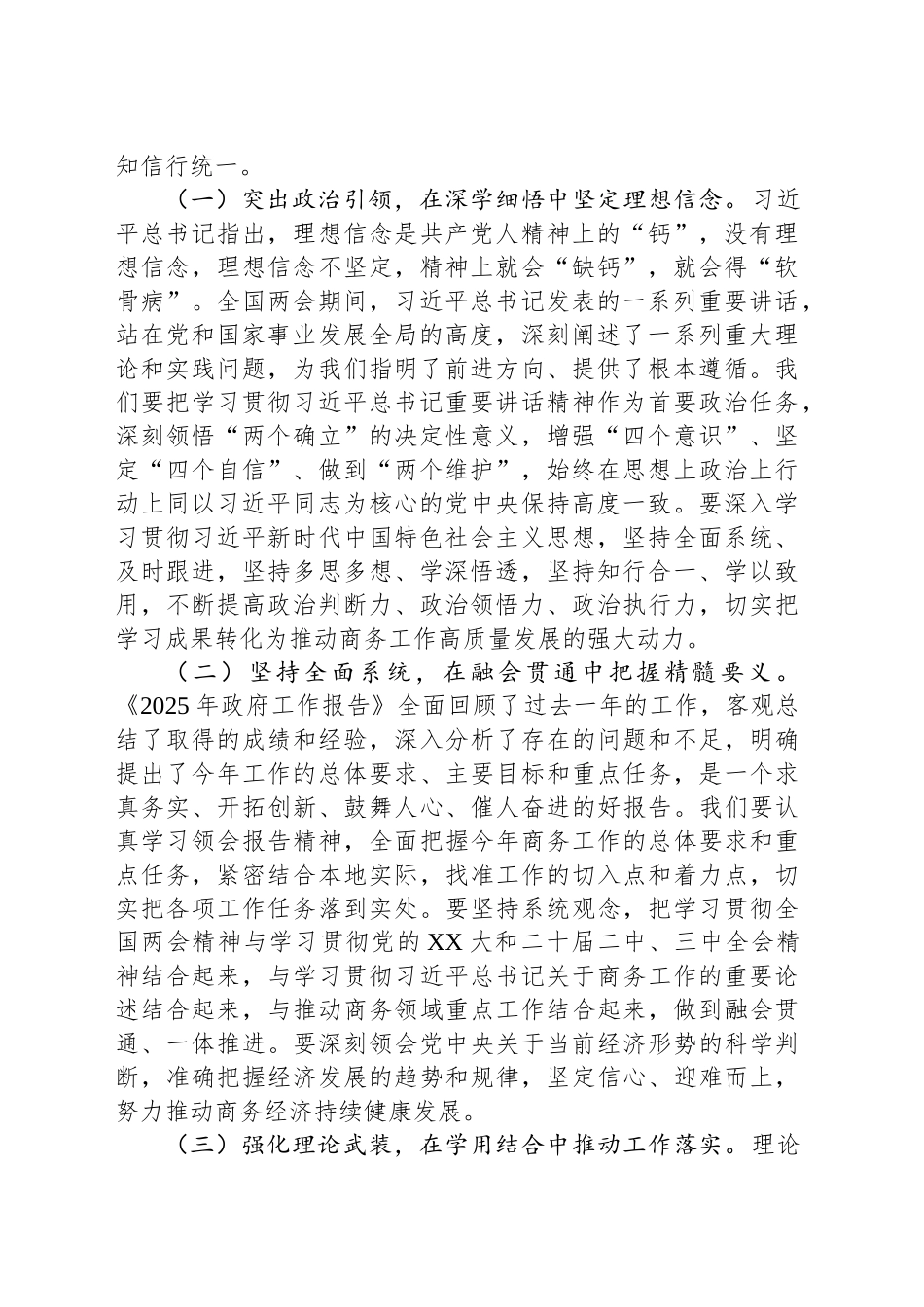 市商务局党组书记在理论学习中心组会上学习2025年全国两会精神研讨发言材料同志们:刚刚胜利闭幕的2025年全国两会,是在全面贯彻落实党的XX大和二十届二中、三中全会精神,全面建设社会主义现代化国家的关键时刻召开的一次重要会议。这次大会,高举中国特色社会主义伟大旗帜,全面贯彻习近平新时代中国特色社会主义思想,深入贯彻落实习近平总书记重要讲话精神,圆满完成各项议程,取得了一系列重大成果,是一次民主、团结、求实、奋进的大会,对于动员全国各族人民更加紧密地团结在以习近平同志为核心的党中央周围,全面贯彻党的XX大和二十届二中、三中全会精神,为全面建设社会主义现代化国家、全面推进中华民族伟大复兴而团结奋斗,具有重大而深远的意义。习近平总书记在全国两会上发表的一系列重要讲话,高屋建瓴、思想深邃、内涵丰富,为我们做好各项工作指明了前进方向、提供了根本遵循。我们要深入学习贯彻习近平总书记重要讲话精神,深刻领悟“两个确立”的决定性意义,增强“四个意识”、坚定“四个自信”、做到“两个维护”,切实把思想和行动统一到党中央决策部署上来,以更加坚定的信心、更加饱满的热情、更加务实的作风,扎实做好商务领域各项工作,为推动高质量发展、实现中国式现代化贡献商务力量。一、燃“理论之火”,原味党课升温“党性觉悟”学深悟透全国两会精神,是当前和今后一个时期的重要政治任务。我们要以此次理论学习中心组学习为契机,进一步掀起学习贯彻全国两会精神的热潮,坚持读原著、学原文、悟原理,深刻领会精神实质,准确把握核心要义,做到学思用贯通、知信行统一。(一)突出政治引领,在深学细悟中坚定理想信念。习近平总书记指出,理想信念是共产党人精神上的“钙”,没有理想信念,理想信念不坚定,精神上就会“缺钙”,就会得“软骨病”。全国两会期间,习近平总书记发表的一系列重要讲话,站在党和国家事业发展全局的高度,深刻阐述了一系列重大理论和实践问题,为我们指明了前进方向、提供了根本遵循。我们要把学习贯彻习近平总书记重要讲话精神作为首要政治任务,深刻领悟“两个确立”的决定性意义,增强“四个意识”、坚定“四个自信”、做到“两个维护”,始终在思想上政治上行动上同以习近平同志为核心的党中央保持高度一致。要深入学习贯彻习近平新时代中国特色社会主义思想,坚持全面系统、及时跟进,坚持多思多想、学深悟透,坚持知行合一、学以致用,不断提高政治判断力、政治领悟力、政治执行力,切实把学习成果转化为推动商务工作高质量发展的强大动力。(二)坚持全面系统,在融会贯通中把握精髓要义。《2025年政府工作报告》全面回顾了过去一年的工作,客观总结了取得的成绩和经验,深入分析了存在的问题和不足,明确提出了今年工作的总体要求、主要目标和重点任务,是一个求真务实、开拓创新、鼓舞人心、催人奋进的好报告。我们要认真学习领会报告精神,全面把握今年商务工作的总体要求和重点任务,紧密结合本地实际,找准工作的切入点和着力点,切实把各项工作任务落到实处。要坚持系统观念,把学习贯彻全国两会精神与学习贯彻党的XX大和二十届二中、三中全会精神结合起来,与学习贯彻习近平总书记关于商务工作的重要论述结合起来,与推动商务领域重点工作结合起来,做到融会贯通、一体推进。要深刻领会党中央关于当前经济形势的科学判断,准确把握经济发展的趋势和规律,坚定信心、迎难而上,努力推动商务经济持续健康发展。(三)强化理论武装,在学用结合中推动工作落实。理论的价值在于指导实践,学习的目的全在于运用。我们要坚持学以致用、用以促学,把学习贯彻全国两会精神与推动商务工作实际紧密结合起来,切实把学习成果转化为推动工作的具体思路和实际行动。要围绕《2025年政府工作报告》提出的目标任务,聚焦商务领域重点工作,认真谋划好今年的工作思路和举措,确保各项工作开好局、起好步。要加大工作力度,狠抓工作落实,扎实推进招商引资、对外贸易、消费促进、电子商务等各项工作,努力完成全年目标任务。要加强调查研究,深入基层、深入企业,了解实际情况,解决实际问题,不断提高工作的针对性和实效...