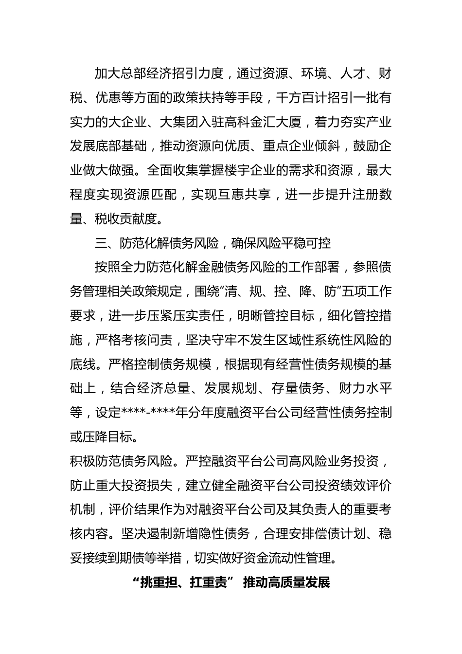 目录提质增效担起财政高质发展重任..................................1“”挑重担、扛重责推动高质量发展...............................2履职尽责勇担当执法有为促发展...................................4“”持续深化放管服改革创造一流营商环境.....................7五个聚焦五个着力赋能高质量发展..............................9靶向发力勇挑重担加速经济恢复提振..........................12提质增效担起财政高质发展重任财政局将全面落实市委、区委工作会议要求,锚定全年目标任务不动摇,勇于“挑重担、扛重责”,敢为善为,务实落实,继续深化财政改革,着力健全财政资金安全高效运行机制,规范财务管理,强化财政职能,加大财源建设力度,严格依法理财,确保高新区持续稳定发展。一、提高财政预算管理水平,抓好财政收入积极组织财政收入,增强收入质量,优化支出结构,提高财政保障能力,确保税收及非税收入计提入库到位。配合各单位梳理预算执行情况,根据实际工作开展进度和年度计划调整相应指标内容,做好预算调整工作。二、重点核查政府投资项目,加大招引总部经济力度加大总部经济招引力度,通过资源、环境、人才、财税、优惠等方面的政策扶持等手段,千方百计招引一批有实力的大企业、大集团入驻高科金汇大厦,着力夯实产业发展底部基础,推动资源向优质、重点企业倾斜,鼓励企业做大做强。全面收集掌握楼宇企业的需求和资源,最大程度实现资源匹配,实现互惠共享,进一步提升注册数量、税收贡献度。三、防范化解债务风险,确保风险平稳可控按照全力防范化解金融债务风险的工作部署,参照债务管理相关政策规定,围绕“清、规、控、降、防”五项工作要求,进一步压紧压实责任,明晰管控目标,细化管控措施,严格考核问责,坚决守牢不发生区域性系统性风险的底线。严格控制债务规模,根据现有经营性债务规模的基础上,结合经济总量、发展规划、存量债务、财力水平等,设定****-****年分年度融资平台公司经营性债务控制或压降目标。积极防范债务风险。严控融资平台公司高风险业务投资,防止重大投资损失,建立健全融资平台公司投资绩效评价机制,评价结果作为对融资平台公司及其负责人的重要考核内容。坚决遏制新增隐性债务,合理安排偿债计划、稳妥接续到期债等举措,切实做好资金流动性管理。“挑重担、扛重责”推动高质量发展市委工作会议,区委工作会议的召开,为投促局下一步工作指明了方向。投促局将克服新冠疫情等不利因素影响,围绕主导产业和特色产业,进一步优化体制机制,线上线下招商相结合,坚持内外开放并举,提升外资利用质量,优化对外贸易结构,全力以赴抓招商、促开放,为高新区经济高质量发展增添新动力。一、精准发力,招大引强,推动产业升级。紧盯“***”任务目标。坚持提前谋划、提早准备,严格执行项目全生命周期管理要求,定期调度梳理汇总各板块项目信息,联合相关部门,沟通把关,争取做到申报一批项目、储备一批项目、转化一批项目,确保按序时节点完成全年任务目标。瞄准“*号工程”项目。围绕四大主导产业精准发力、招大引强,加速构建特色产业集群,加快突破电池生产基地、拟上市总部及生产基地、氮化镓外延及制程等在手行业龙头企业项目。二、扎实推进利用外资扩量提质、外资企业平稳运行。紧盯在手外资项目。重点推进在手重点项目,根据与外方签订的协议节点,加强项目推进力度,争取早到账、早建成、早投产,做好在谈外资重大项目的跟踪工作,加强各级联动、部门协同,建立绿色通道,推动项目尽快落地。强化外资项目招引。积极利用驻点和中介机构招商,通过以商招商、平台招商等方式,加大外资项目招引力度,重点招引新能源汽车及零部件、电子信息等风口产业外资项目。助力外资企业高质量发展。继续认真落实稳外资工作部署要求,宣传解读外资研发中心、地区总部和功能性机构等文件政策,支持辅导企业申报各类总部,引导企业做大做强,形成协同共育的良性发展局面。三、加大扶持力度,优化政策环境,助力外贸企业轻装前行。加大政策支持力度。积极落实商务资金,增强企业拓展市场积极性,稳定企业经营。同时计划向上级争取...