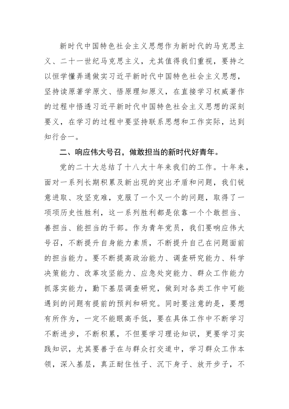 学习二十大研讨发言党的二十大,是在全党全国各族人民迈上全面建设社会主义现代化国家新征程、向第二个百年奋斗目标进军的关键时刻召开的一次十分重要的大会。习近平总书记在此次会上作了重要的报告,在报告的最后,代表党中央向全体青年发出号召:“广大青年要坚定不移听党话、跟党走怀抱梦想又脚踏实地,敢想敢为又善作善成,立志做有理想、敢担当、能吃苦、肯奋斗的新时代好青年,让青春在全面建设社会主义现代化国家的火热实践中绽放绚丽之花。”习近平总书记这一伟大号召是在我们全面建设社会主义现代化强国、在我们朝着第二个百年奋斗目标努力前行的关键节点向全体青年发出的动员令。身为一名青年党员青年干部,我将以高度的政治自觉、思想自觉、行动自觉积极响应这一伟大号召,坚定不移听党话跟党走,不断坚定信念,提升素质能力,将青春融入党和人民的伟大事业之中,让青春在全面建设社会主义现代化国家的火热实践中绽放绚丽之花。一、响应伟大号召,做有理想的新时代好青年。党的二十大报告深刻指出,拥有马克思主义科学理论指导是我们党坚定信仰信念、把握历史主动的根本所在。青年党员要成为有理想的青年,最重要的就是要加强理论修养,从理论中不断汲取信仰信念。要深入学习马克思主义理论,掌握马克思主义的世界观、方法论,用马克思主义观点去指导生活实践。要时刻紧跟党的最新理论。习近平新时代中国特色社会主义思想作为新时代的马克思主义、二十一世纪马克思主义,尤其值得我们重视,要持之以恒学懂弄通做实习近平新时代中国特色社会主义思想,坚持读原著学原文、悟原理知原义,在直接学习权威著作的过程中悟透习近平新时代中国特色社会主义思想的深刻要义,在学习的过程中要坚持联系思想和工作实际,达到知行合一。二、响应伟大号召,做敢担当的新时代好青年。党的二十大总结了十八大十年来我们的工作。十年来,面对一系列长期积累及新出现的突出矛盾和问题,我们锐意进取、攻坚克难,克服了一个又一个的问题,取得了一项项历史性胜利,这一系列胜利都是依靠一个个敢担当、善担当、能担当的干部。作为青年党员,我们要响应伟大号召,不断提升自身能力素质,不断提升自己在问题面前的担当能力。要不断提高政治能力、调查研究能力、科学决策能力、改革攻坚能力、应急处突能力、群众工作能力抓落实能力,勤下基层调查研究,做到对各类工作中可能遇到的问题有提前的预判和研究。同时要注意的是,要想有所作为,一定不能眼高手低,要在具体工作中不断学习不断进步,不断积累,不但要学习理论知识,更要学习实践知识,尤其要善于在与群众打交道中,学习群众工作本领,深入基层,真正耐住性子、沉下身子、放开步子,不断提高自身的实际能力和素质,提升在大是大非面前敢于担当的能力。三、响应伟大号召,做能吃苦的新时代好青年。四、响应伟大号召,做肯奋斗的新时代好青年。党的二十大报告深刻指出,我们必须增强忧患意识,坚持底线思维,做到居安思危、未雨绸缪,准备经受风高浪急甚至惊涛骇浪的重大考验。诚然,我们在实现中华民族伟大复兴的征程上已经取得了前所未有的佳绩,我们已经比历史上任何时刻都更加接近中华民族伟大复兴。但也要看到,我们仍然面临着很多风险和挑战:世界百年未有之大变局加速演进,世界各地地区冲突频发,极端气候天气不时侵扰。可以说,若想实现伟大梦想,我们比历史上任何时候都更需要奋斗精神、斗争精神。作为青年党员,要勇于奋斗、敢于斗争,要在挺起脊梁、冲锋在前的担当和斗争中经风雨、见世面、长才干、作贡献。不论以后我被分配在哪个科室、哪个岗位我都将永葆奋斗精神、斗争精神。要在面对侵害群众利益的时候敢于站出来说不,要在组织利益受到侵害时说不,要在维护党和国家根本利益的重要关头勇敢站出来与外部势力作斗争,依靠奋斗、依靠斗争成长为可堪大用的栋梁之材。时代的动员令已经发出、冲锋的号角已经吹响,领袖在号召这我们,时代在呼唤着我们,人民在期待着我们。作为青年党员,生逢其时,我将珍惜时代给与的舞台,响应伟大号召,不断学习二十大报告精神,立志做有理想、敢担当、能吃苦、肯奋斗的新时代好青年,将青春...