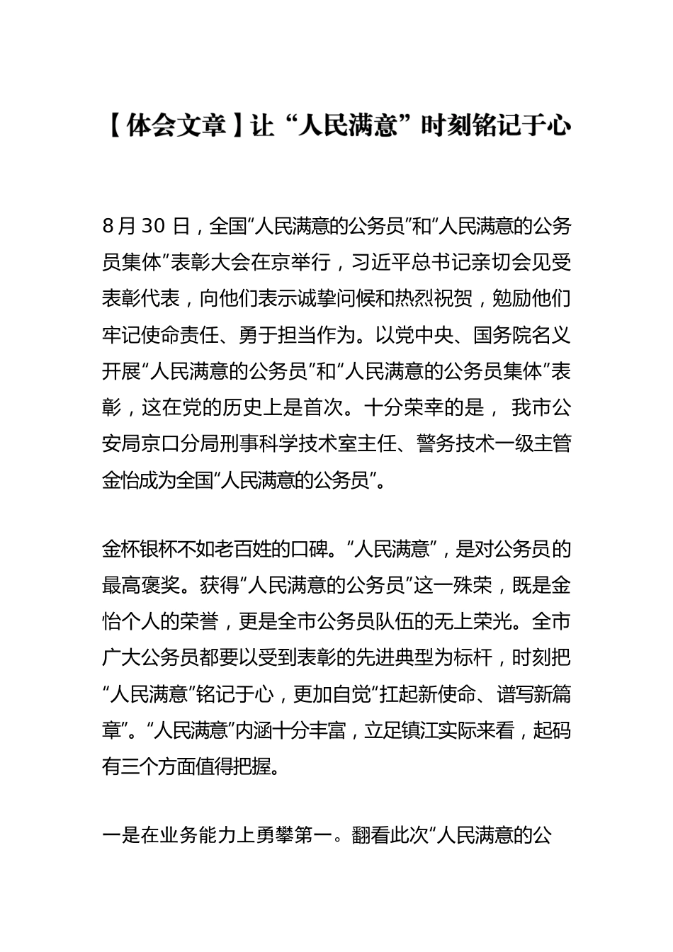 8月30日,全国“人民满意的公务员”和“人民满意的公务员集体”表彰大会在京举行,习近平总书记亲切会见受表彰代表,向他们表示诚挚问候和热烈祝贺,勉励他们牢记使命责任、勇于担当作为。以党中央、国务院名义开展“人民满意的公务员”和“人民满意的公务员集体”表彰,这在党的历史上是首次。十分荣幸的是,我市公安局京口分局刑事科学技术室主任、警务技术一级主管金怡成为全国“人民满意的公务员”。金杯银杯不如老百姓的口碑。“人民满意”,是对公务员的最高褒奖。获得“人民满意的公务员”这一殊荣,既是金怡个人的荣誉,更是全市公务员队伍的无上荣光。全市广大公务员都要以受到表彰的先进典型为标杆,时刻把“人民满意”铭记于心,更加自觉“扛起新使命、谱写新篇章”。“人民满意”内涵十分丰富,立足镇江实际来看,起码有三个方面值得把握。一是在业务能力上勇攀第一。翻看此次“人民满意的公务员”榜单,无一不是业务精湛之人。金怡就是在自己的岗位上精益求精,利用专业所长破获了一批大案难案。人民群众需要看到镇江的发展有新的突破,这种突破从何而来?就是从个体公务员的能力突破而来。拿下了别人没有拿下的项目,是业务能力突出的表现;通过创新手段化解了多年矛盾,是业务能力突出的表现;利用新技术压缩了审批时限,同样是业务能力突出的表现。只要人人都在业务上精益求精,镇江整体公务员素质就会有较大提升,就能引领镇江克难奋进、不惧竞争。在当前镇江发展过程中,广大公务员队伍立足岗位“勇挑大梁”,就能推动各层各级、各行各业为镇江高质量发展“多作贡献”,交出“人民满意”的答卷。二是在廉洁公正上守好底线。德才兼备,是人民群众衡量合格党员干部的重要标准。业务能力强是才,廉洁公正就是重要的从政之德。公平公正,是企业群众的共同诉求,也是一个地方最核心的营商环境。环境好,发展就会好。面广量大的公务员队伍是影响这一环境的决定性因素。要做到事事公正、时时公平,就需要我们的党员干部,特别是领导干部做到去私欲、守廉洁。三是在理想信念上不忘初心。对个体公务员来说,“人民满意”不是一时的要求,而是伴随职业生涯始终。始终做一个“人民满意”的公务员,就需要在理想信念上慎终如始、坚定不移。众多落马干部分析人生误入歧途的原因,都把理想信念偏移了、动摇了作为最本质的一条。这对广大公务员,特别是年轻党员干部来说,具有十分重要的警醒作用,必须慎之、戒之。9月1日下午,市委书记马明龙会见了载誉归来的金怡,勉励她珍惜荣誉、再接再厉,继续在本职岗位上奋力拼搏、担当作为,将这份荣光擦得更亮。这份勉励既是对金怡所说,也是对全市公务员队伍而言。大家一起谨记,一起努力吧。
